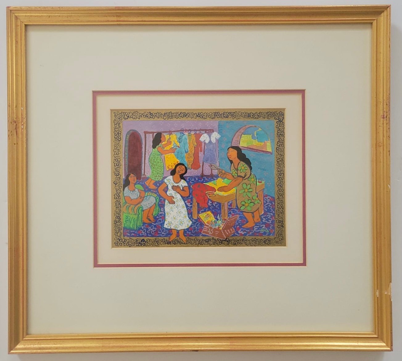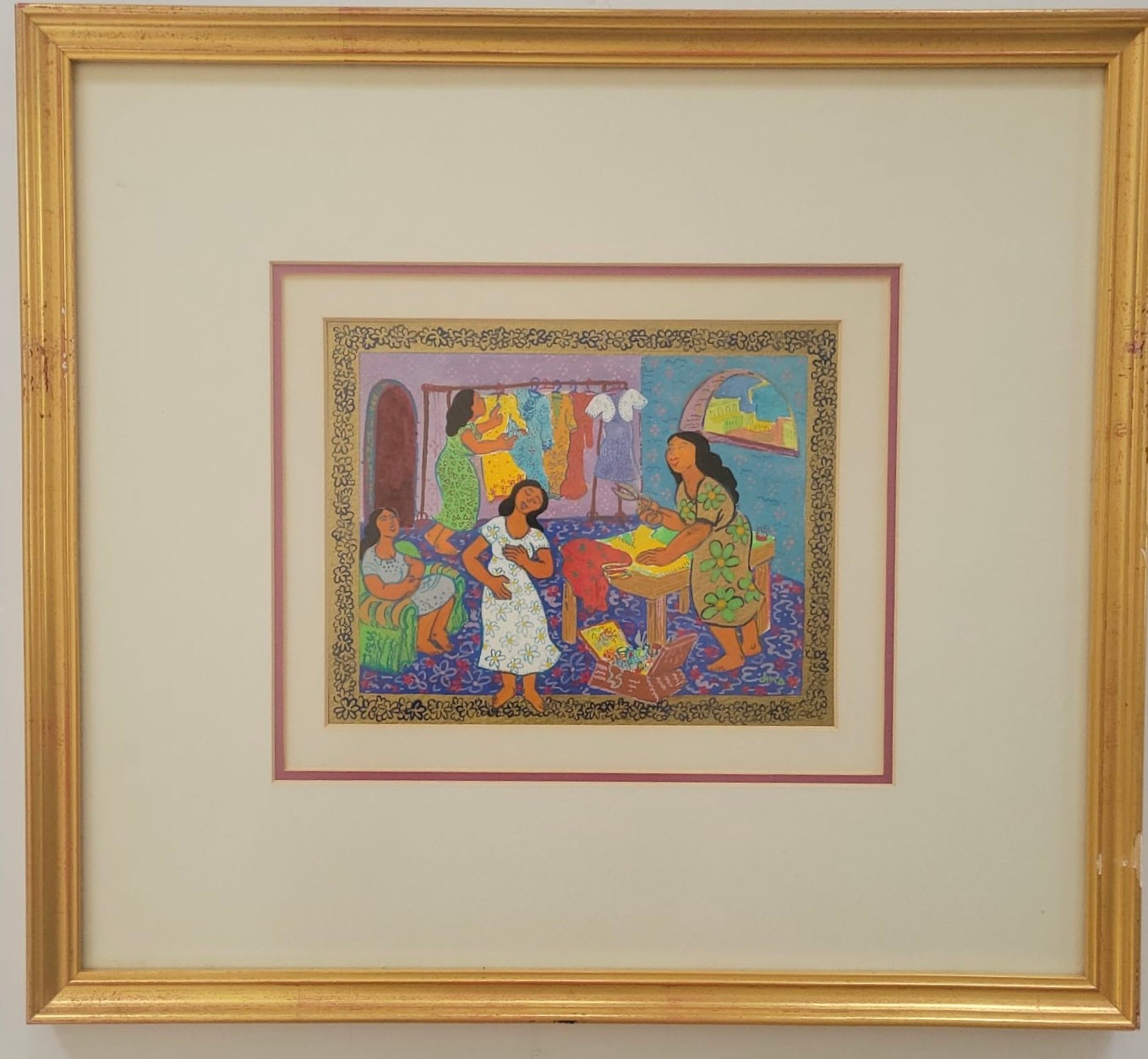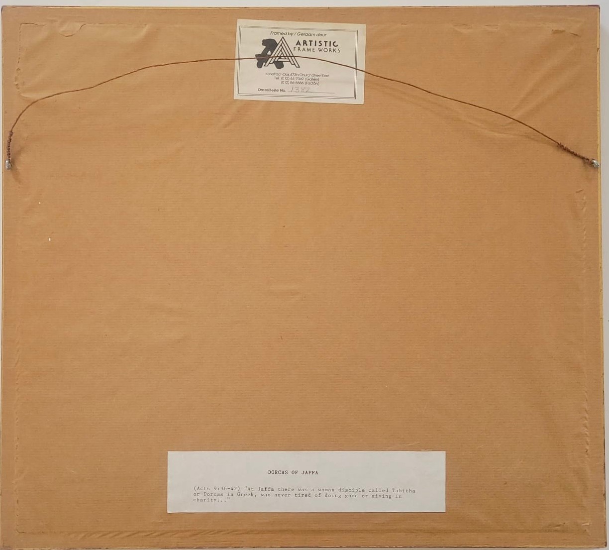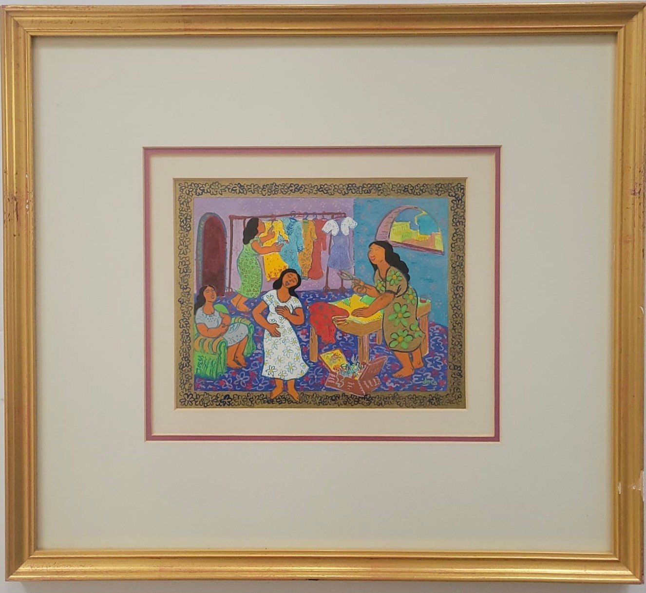 Serigraph titled "Dorcas of Jaffa" (also known as Tabitha)by Dina Cormic from her Heroic Women in the Scriptures series.Subject: It depicts the biblical story of Dorcas (Tabitha) from Acts 9:36–42, who was a disciple in Jaffa (Joppa) known for her "good works and acts of charity," specifically making tunics and other clothing for widows.