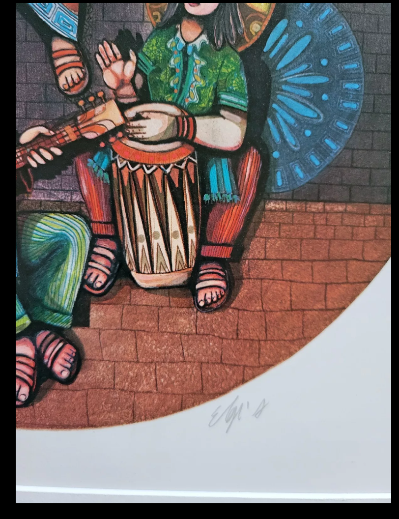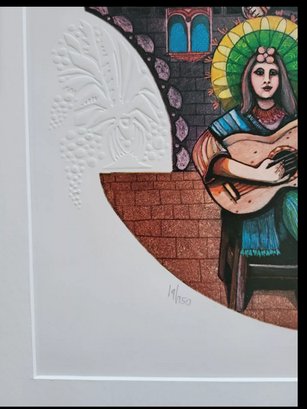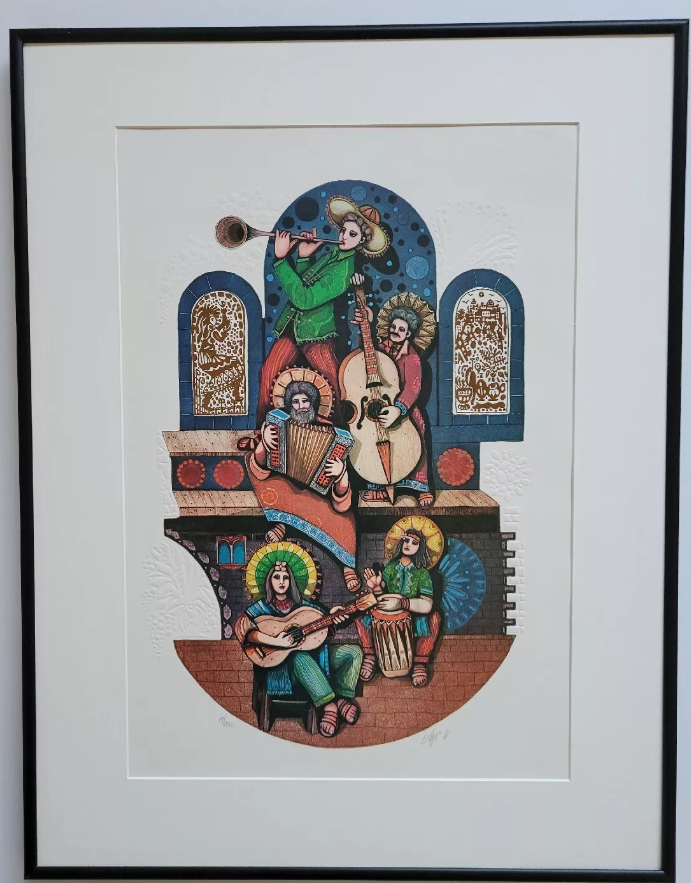 Experience the beauty and uniqueness of this limited edition print by AMRAM EBGI titled "The 5 Musician". This stunning piece features embossed foil accents that bring the image to life. The print is signed by the artist and is sure to be a valuable addition to any art collection. Perfect for art enthusiasts and collectors alike, this print is a must-have for those who appreciate the beauty of art. The print is of high quality and is sure to be a conversation starter in any room. Don't miss your chance to own a piece of art history with this limited edition print by AMRAM EBGI. Art Size 13X18. Frame size 18 3/4x24