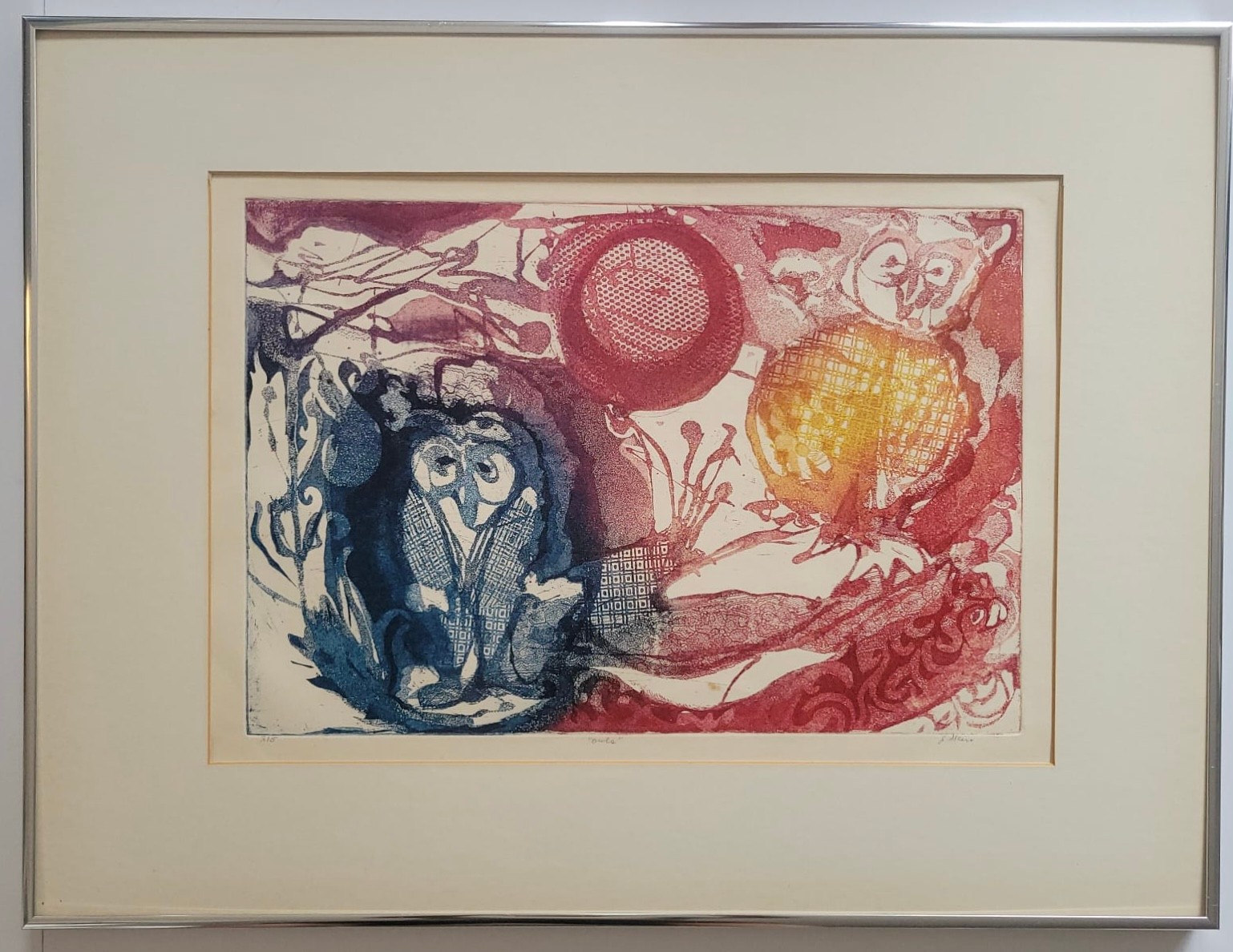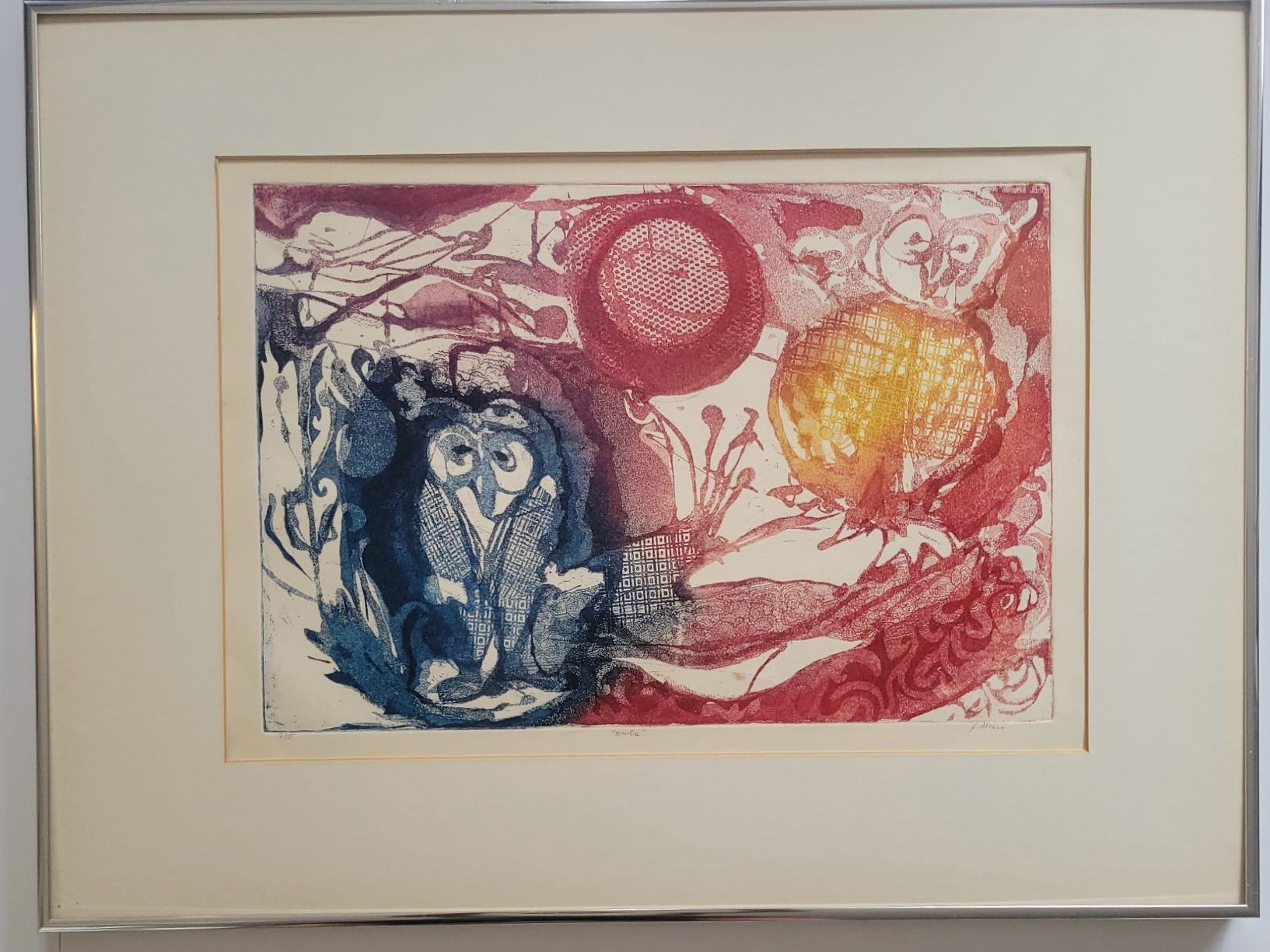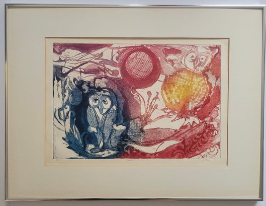Surrealist Pencil signed Etchig of Owls. The artwork likely utilizes a combination of etching and aquatint, common in mid-century printmaking to create textured color areas.