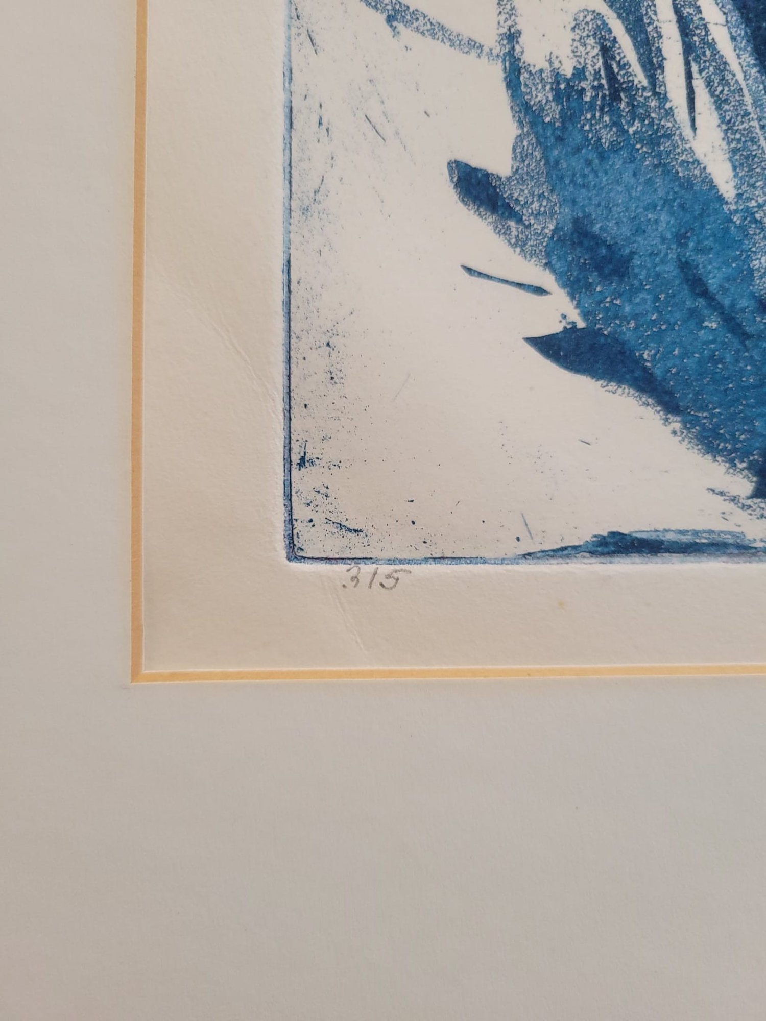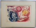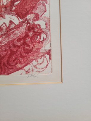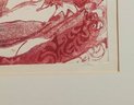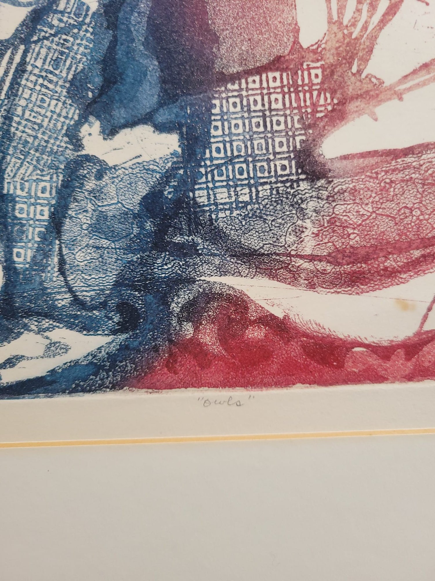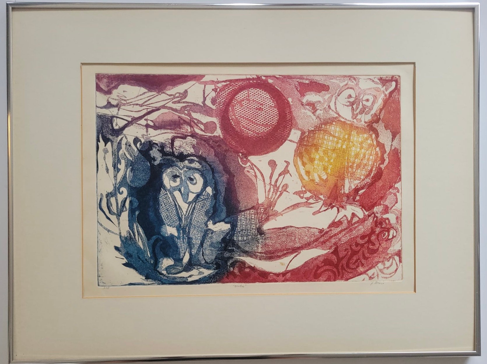 Surrealist Pencil signed Etchig of Owls. The artwork likely utilizes a combination of etching and aquatint, common in mid-century printmaking to create textured color areas.