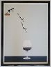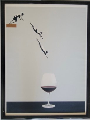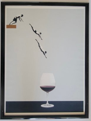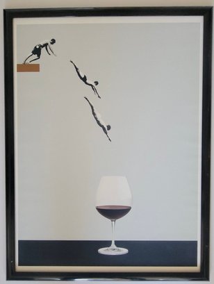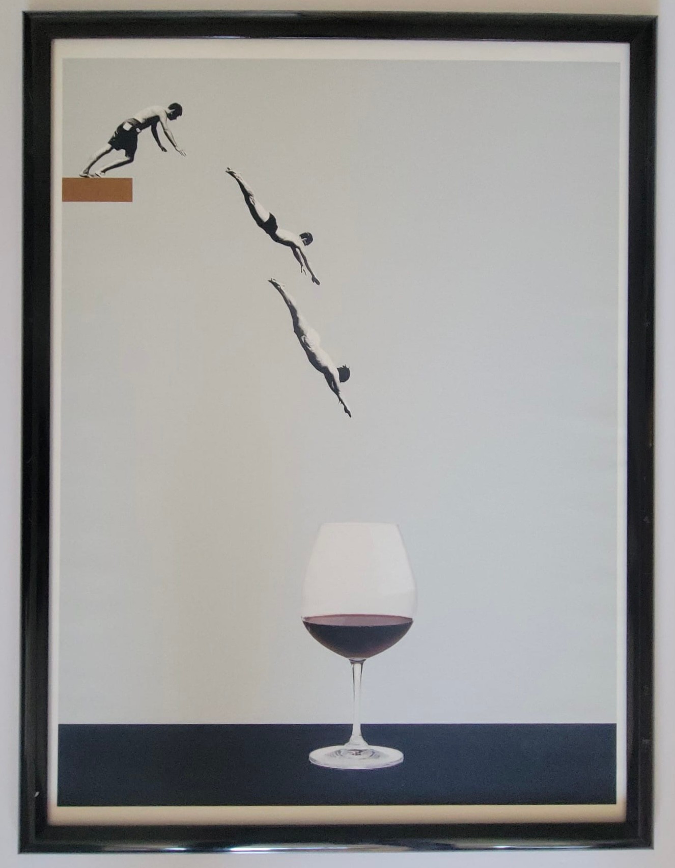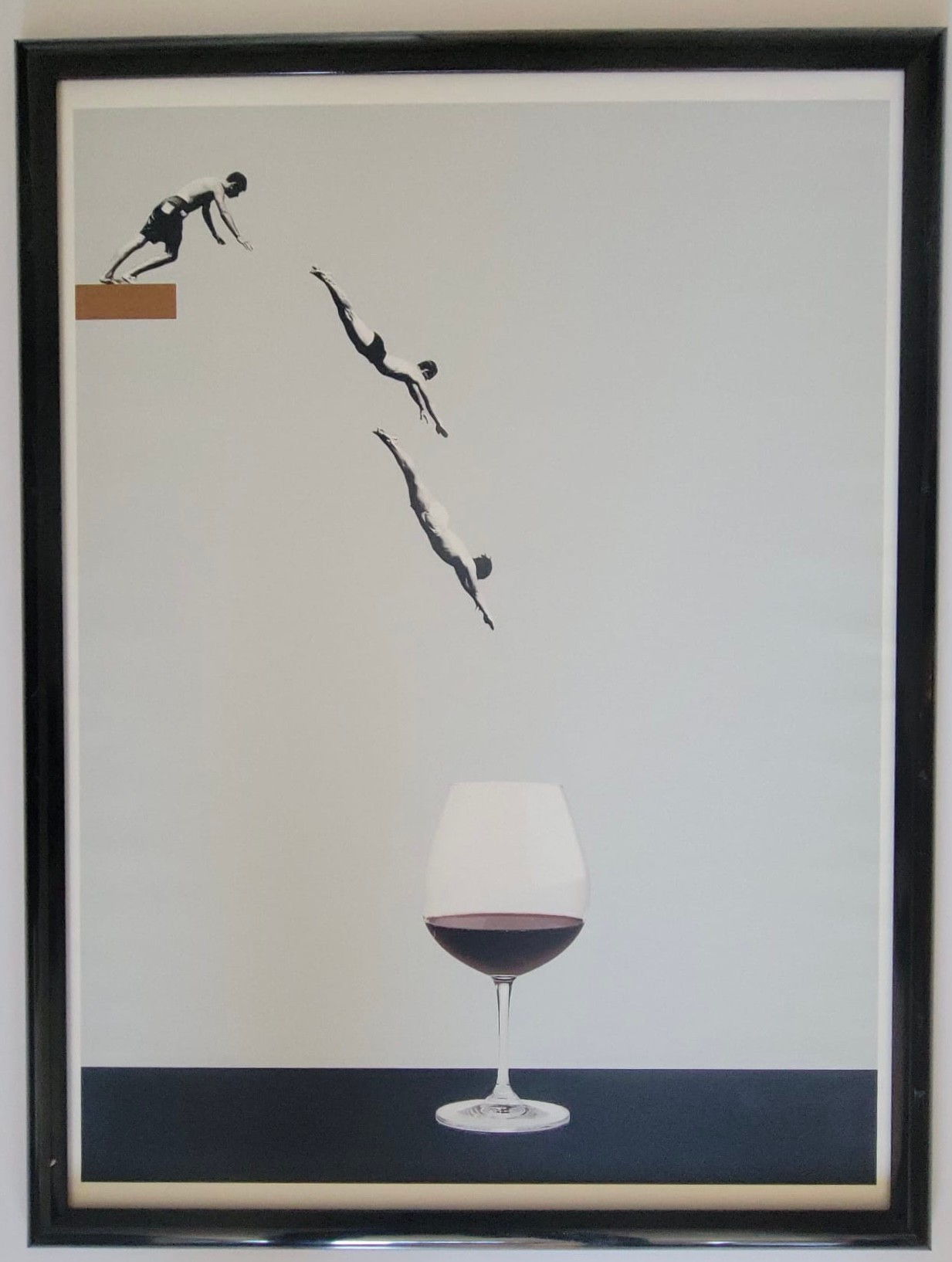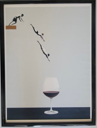 Surrealist Poster Print of Figures Diving into a wine glass. The piece features a whimsical scene of three figures diving from a board into a large glass of red wine, blending mid-century vintage aesthetics with modern surrealism.