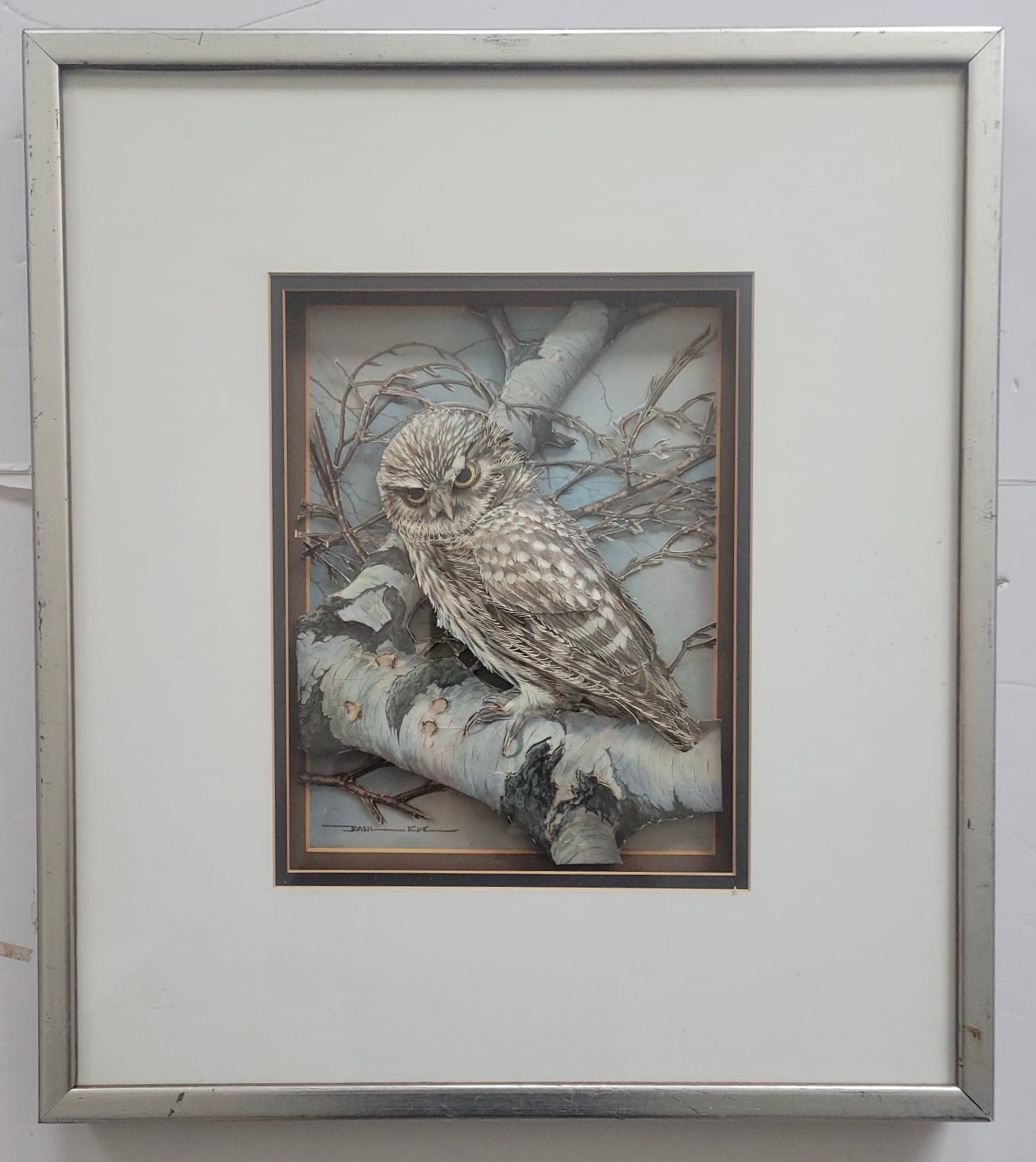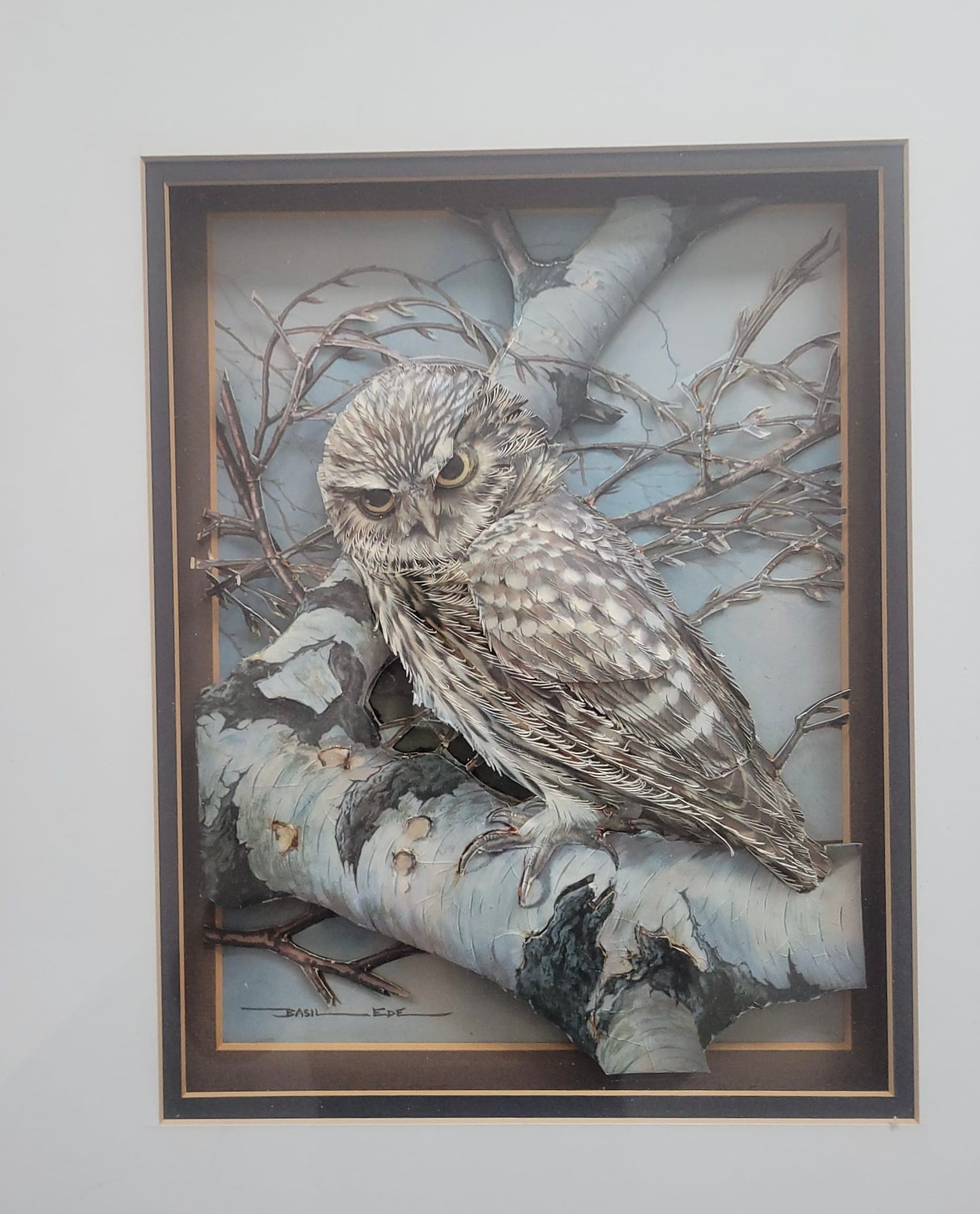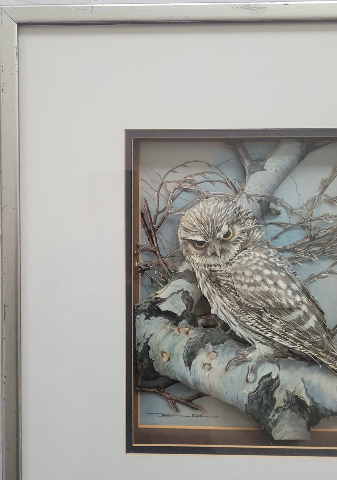 This is a vintage three-dimensional decoupage art piece titled "The Little Owl" by British wildlife artist Basil Ede (1931-2016). The artwork is known for its highly detailed, ornithologically precise depictions of birds. It utilizes a decoupage technique, often incorporating real feathers, to create a 3D effect within a shadow box frame.
