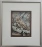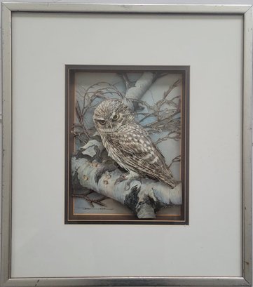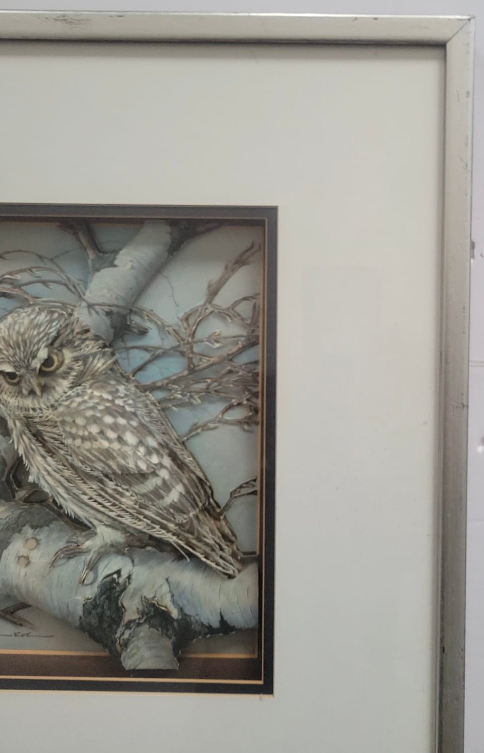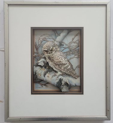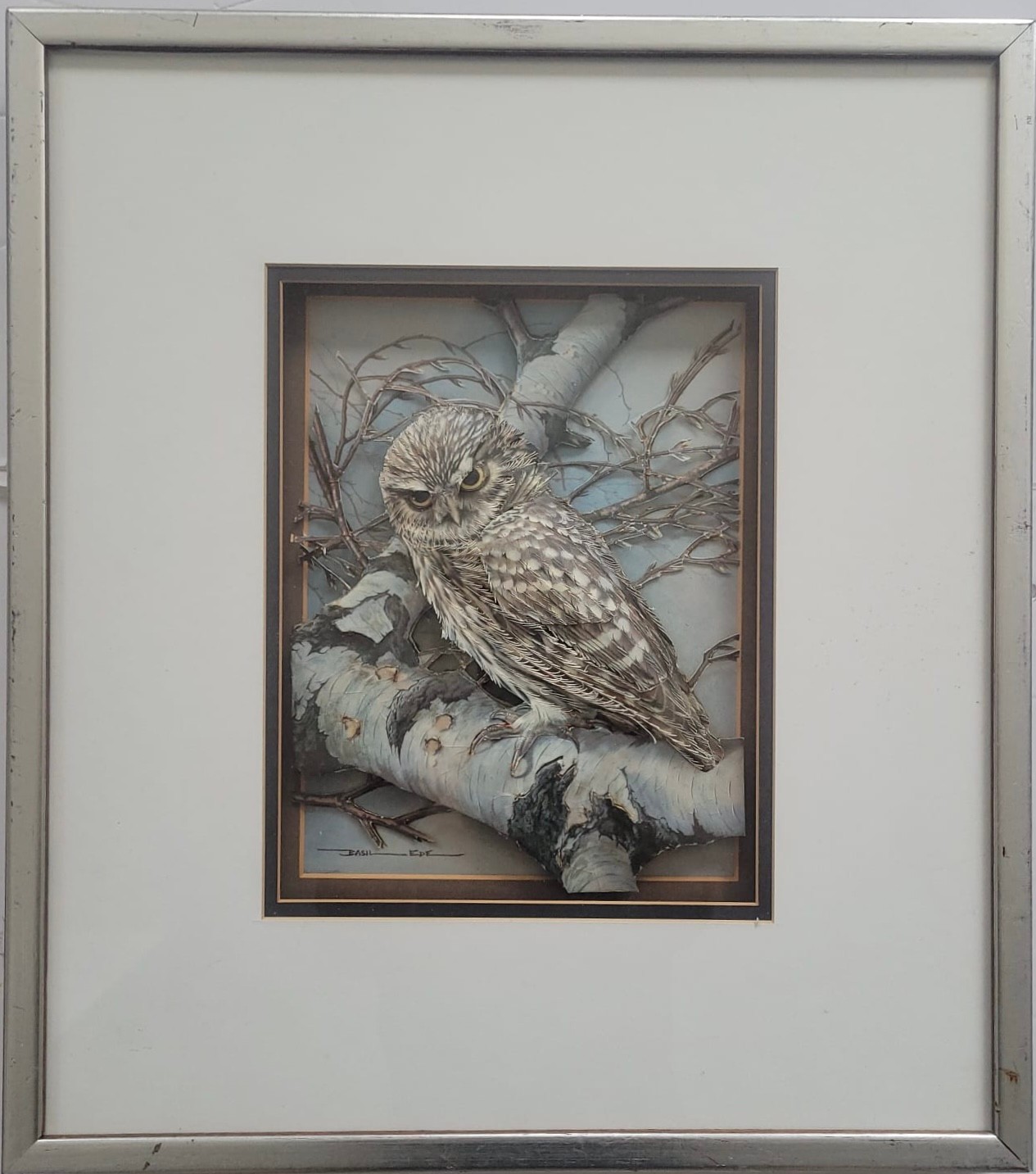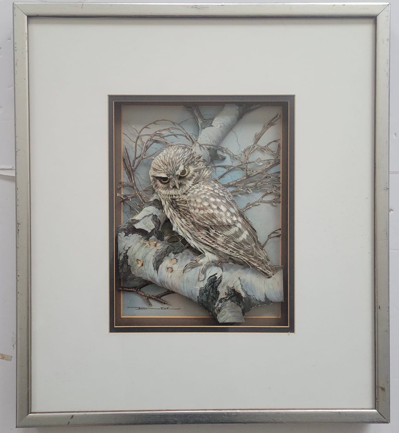 This is a vintage three-dimensional decoupage art piece titled "The Little Owl" by British wildlife artist Basil Ede (1931-2016). The artwork is known for its highly detailed, ornithologically precise depictions of birds. It utilizes a decoupage technique, often incorporating real feathers, to create a 3D effect within a shadow box frame.