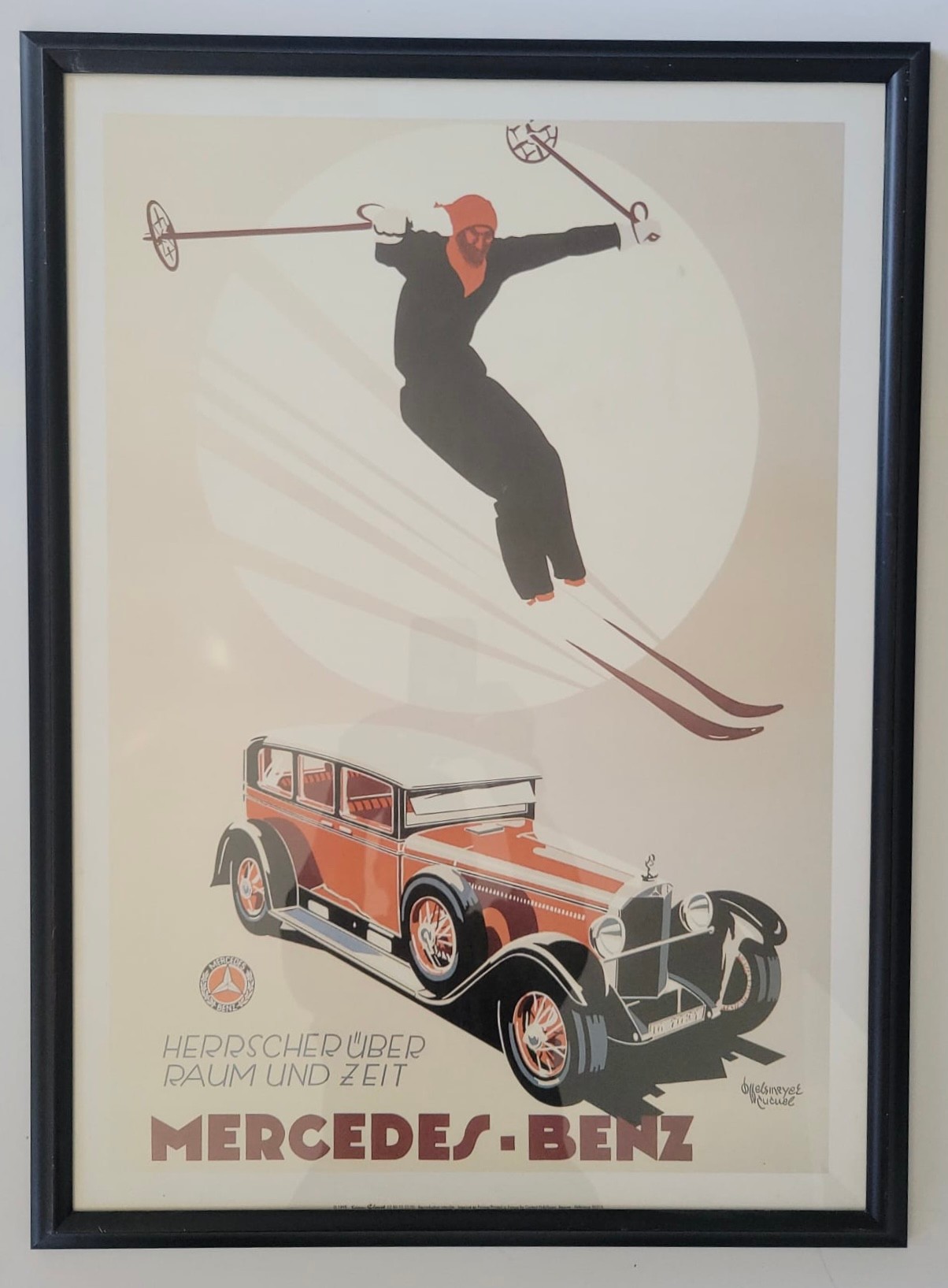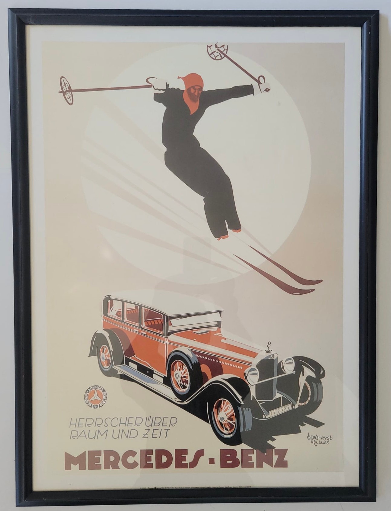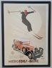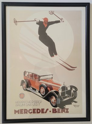 It features a skier jumping over a classic Mercedes-Benz car, symbolizing the brand's power and speed.