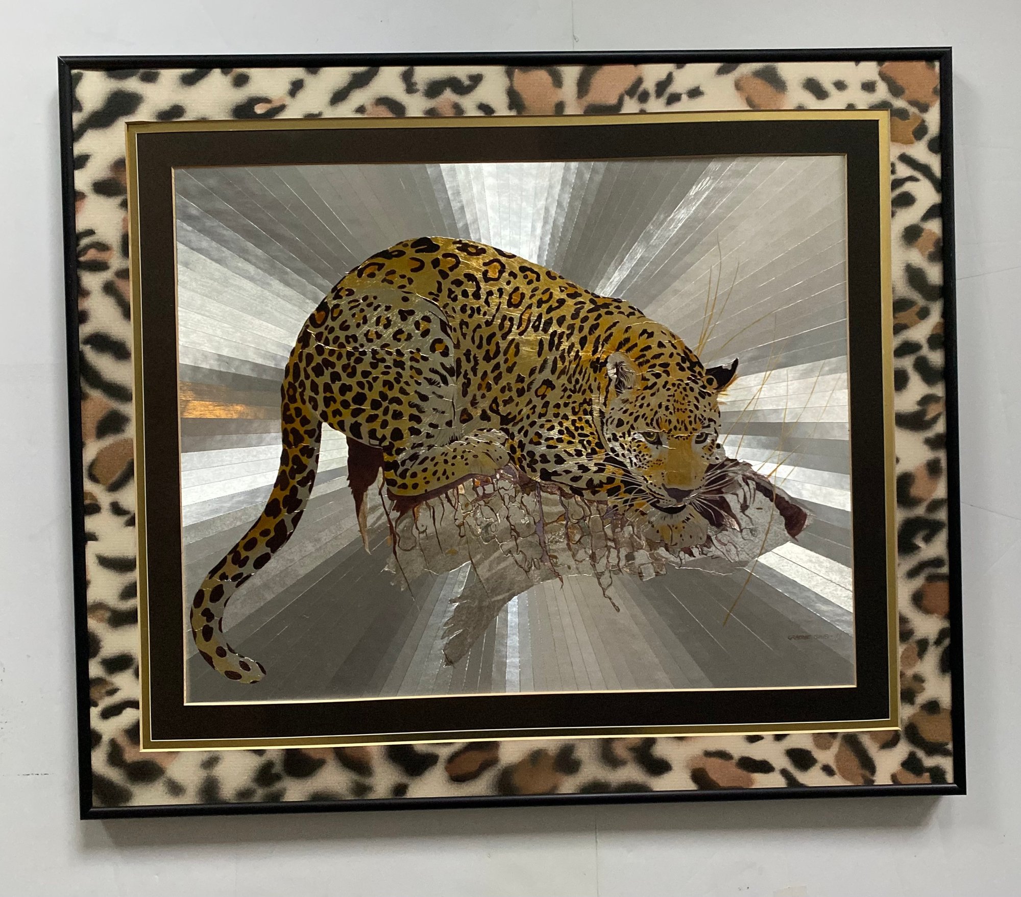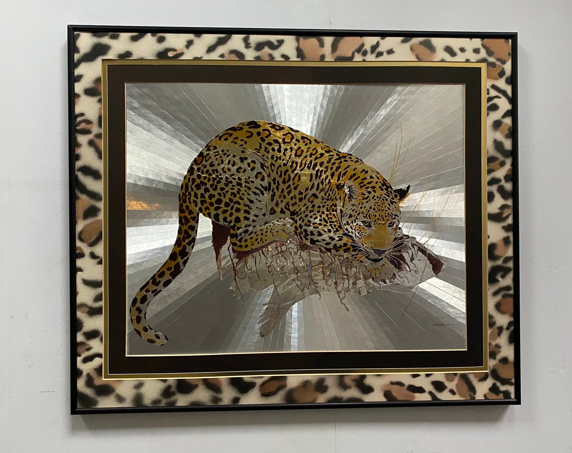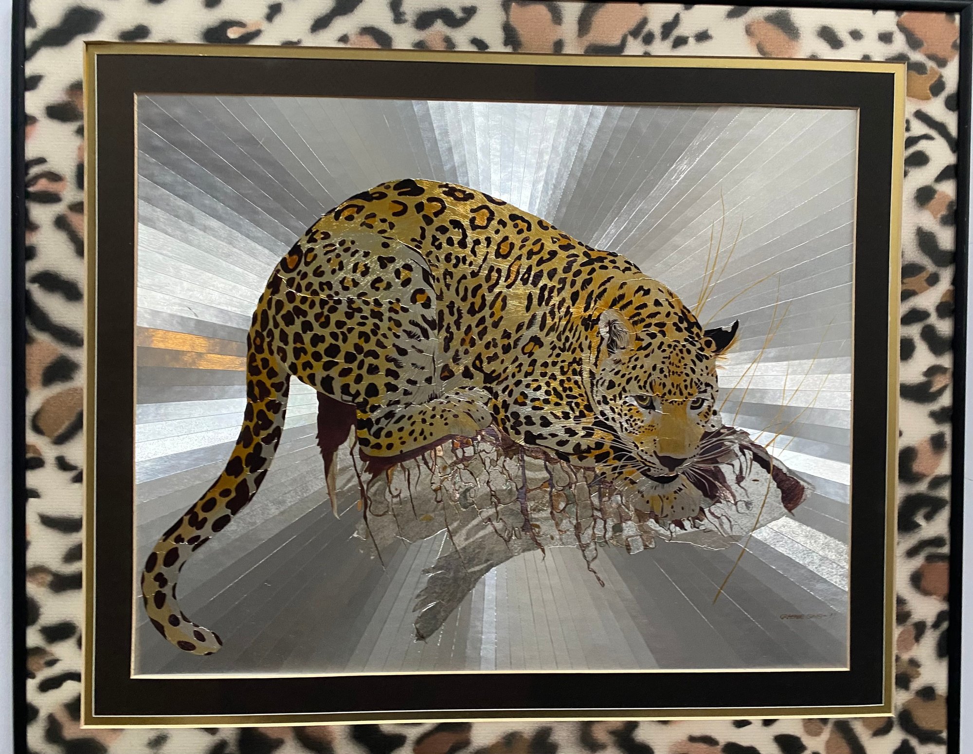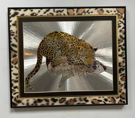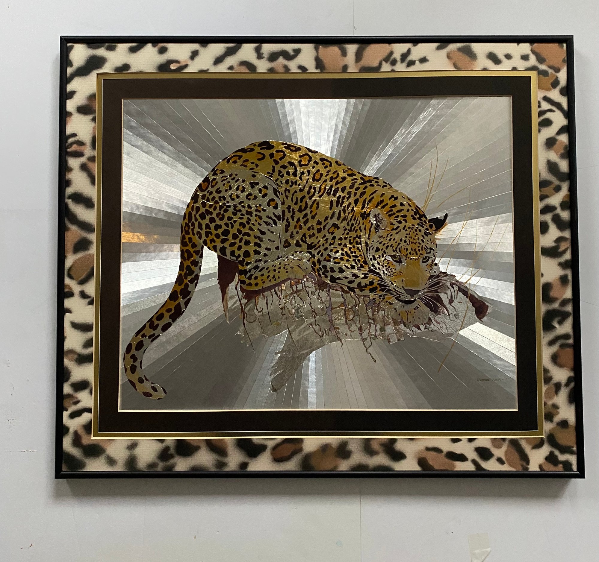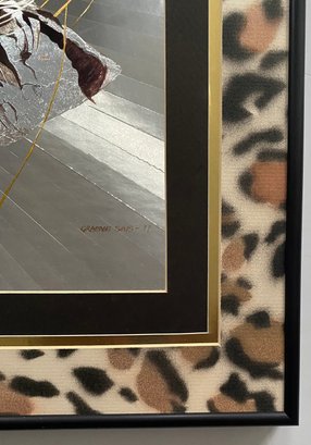 Features: Vintage Graeme Sims Reflective Leopard tArtwork Signed and dated 1977. Triple Mats with a black metal Frame, good condition. Art size 20X16. Frame 25 1/2 x 21 3/4