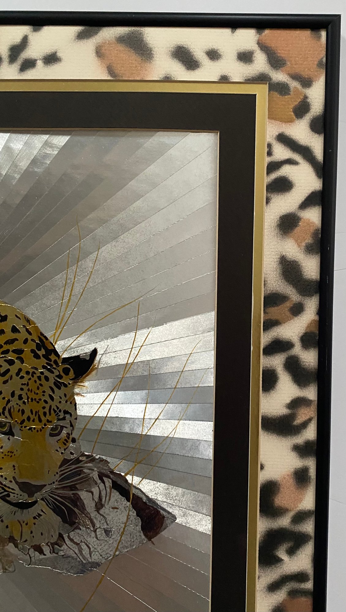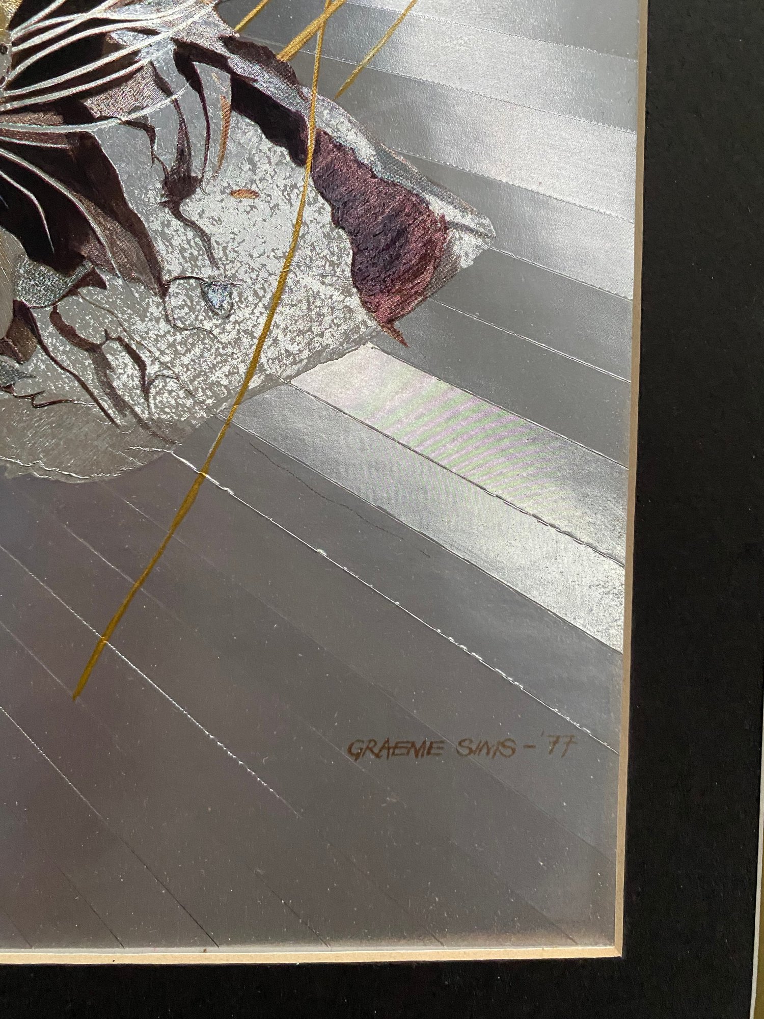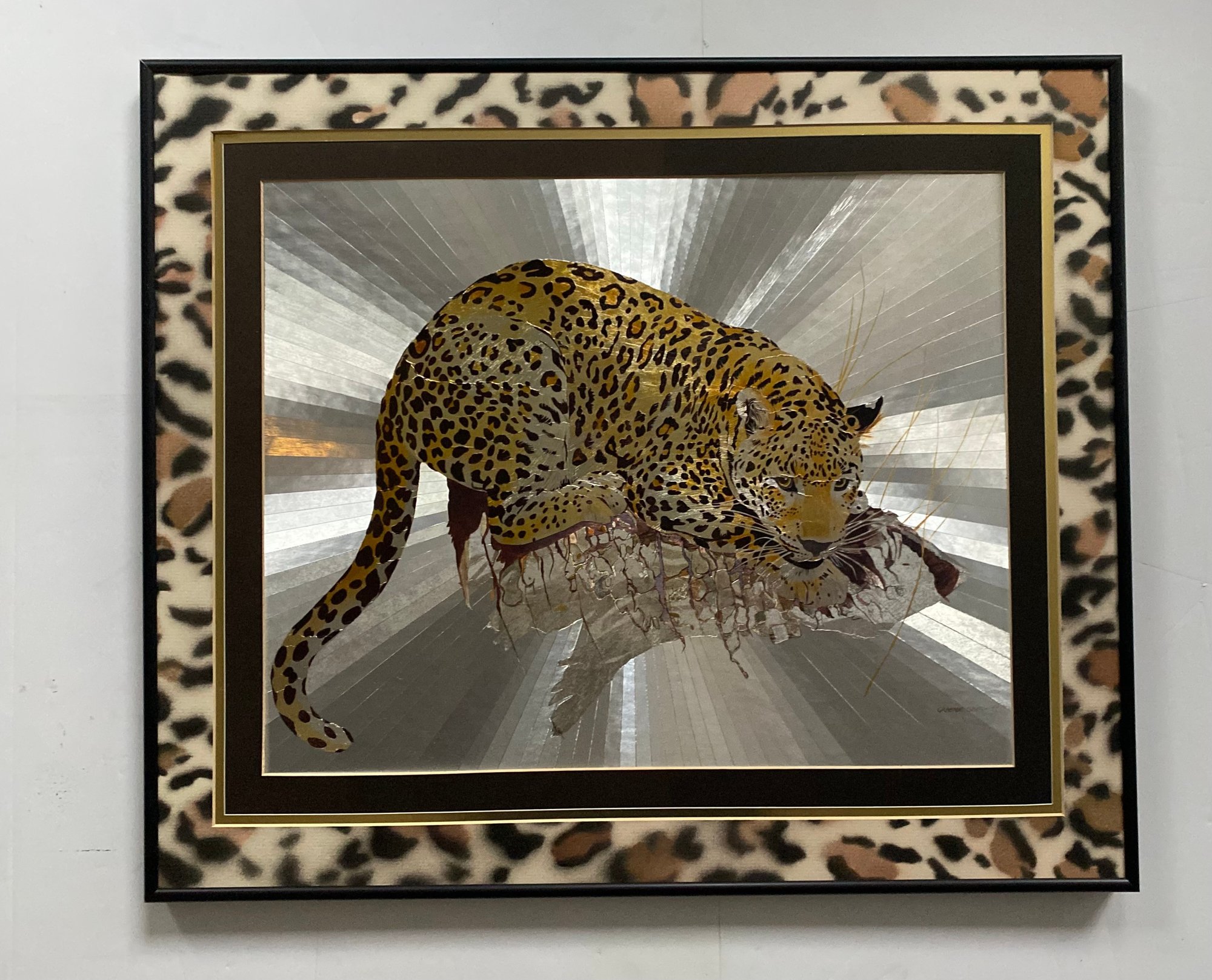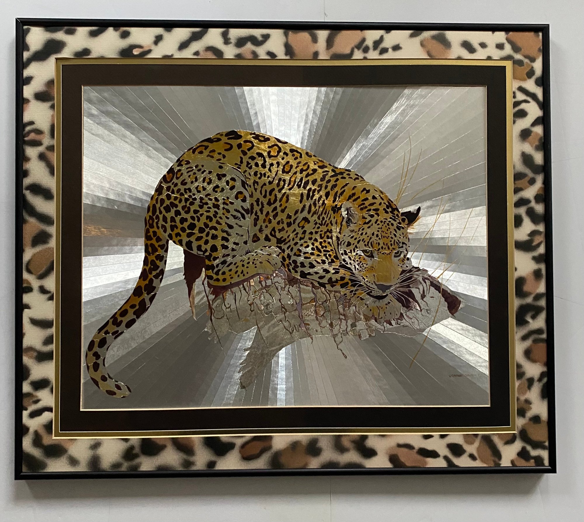 Features: Vintage Graeme Sims Reflective Leopard tArtwork Signed and dated 1977. Triple Mats with a black metal Frame, good condition. Art size 20X16. Frame 25 1/2 x 21 3/4