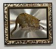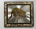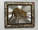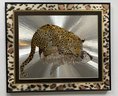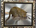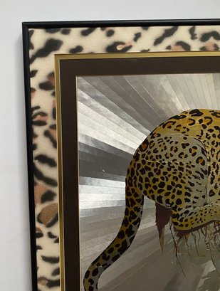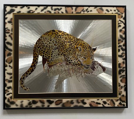 This framed artwork, titled "Reflective Leopard" by Graeme Sims and dated 1977, features a striking depiction of a leopard against a reflective, possibly metallic, background that creates a sense of depth and movement. This vintage foil art print, showcasing the agility and beauty of the leopard, is a unique addition for collectors or those seeking to enhance their decor with a touch of nature-inspired art from the 1970s.