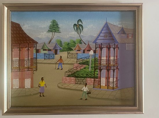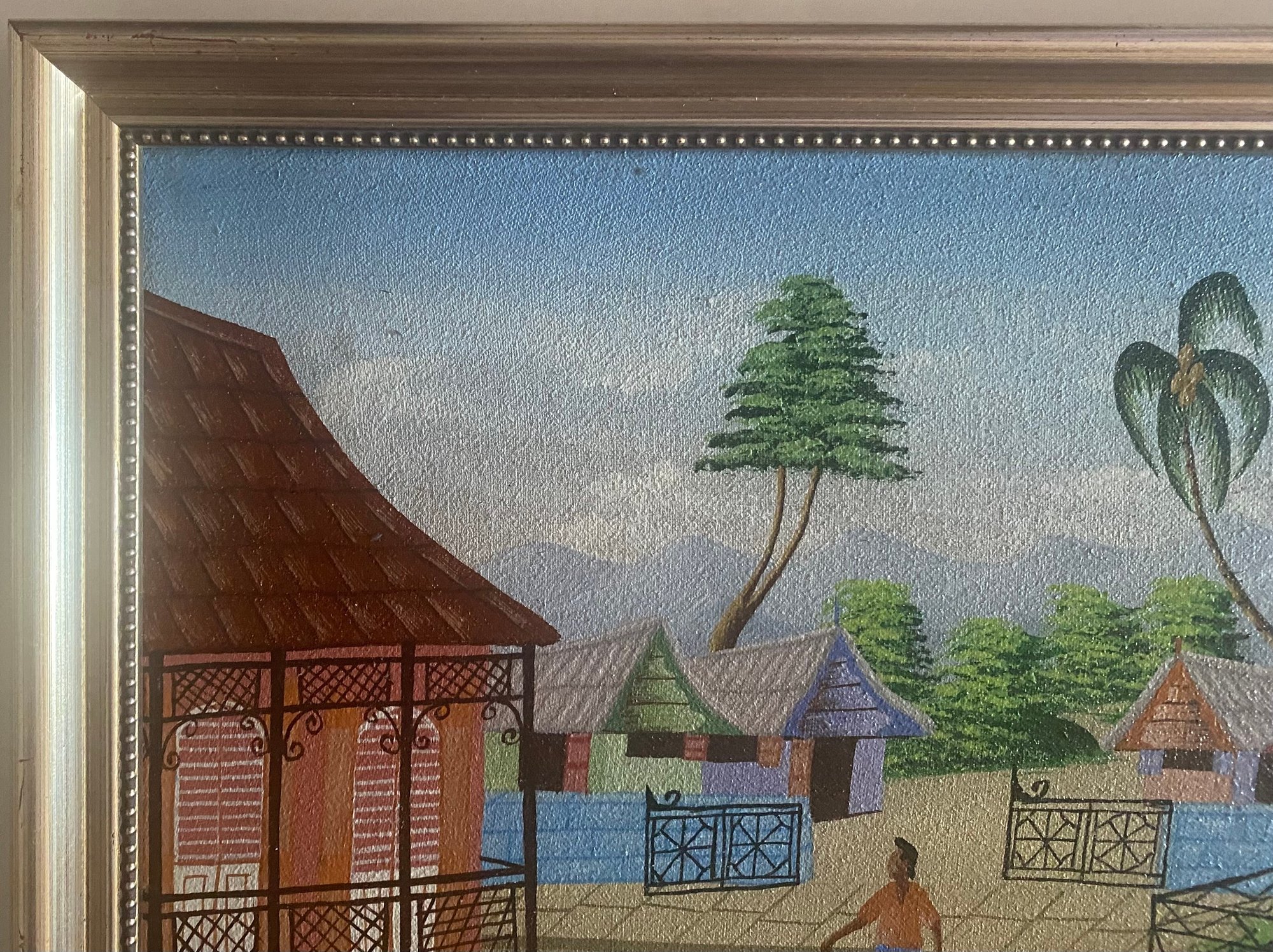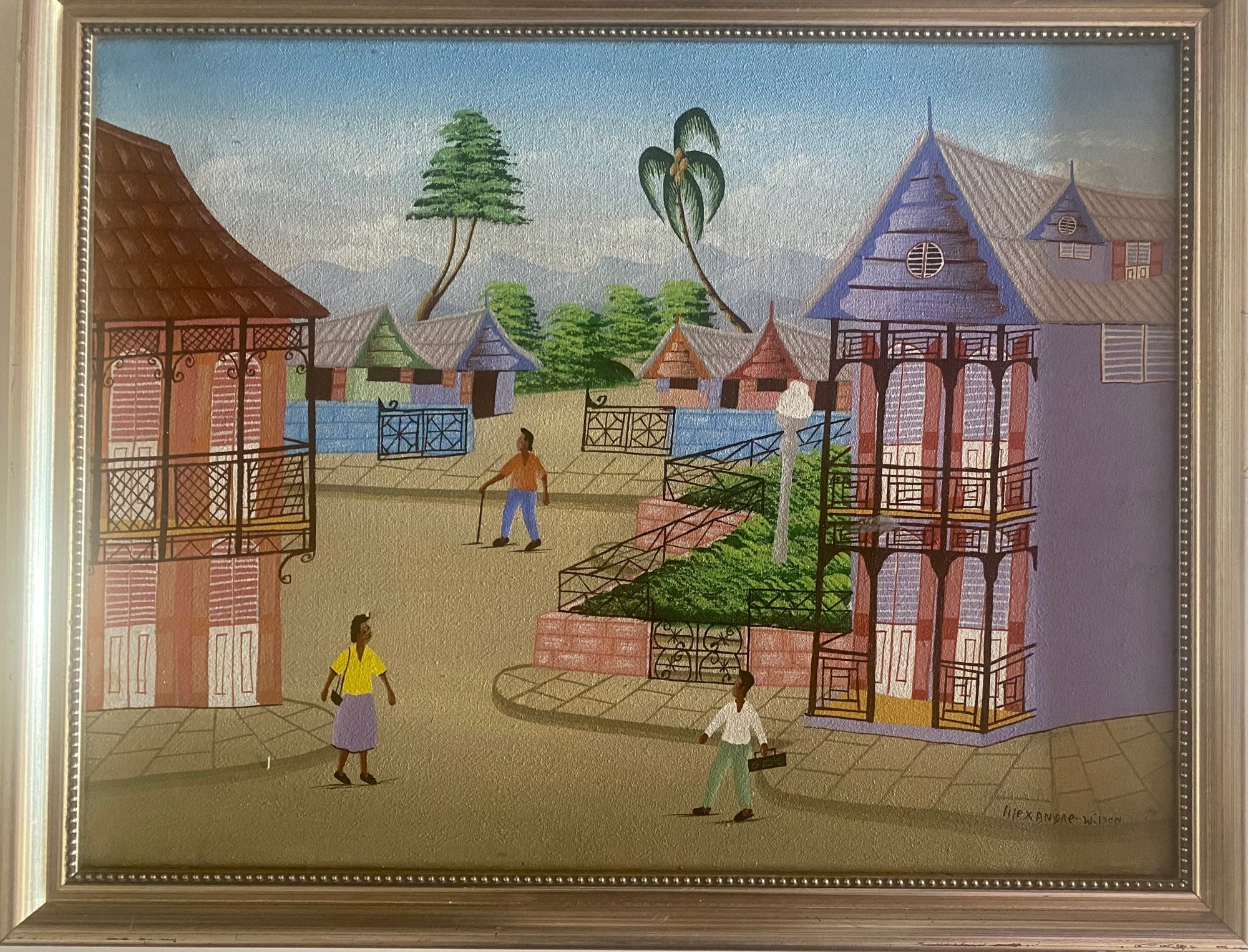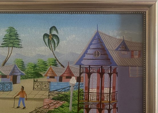 A colorful village scene with people walking on a dirt road, surrounded by houses with intricate balconies and fences. The sky is a bright blue, and there are palm trees and other foliage in the background.