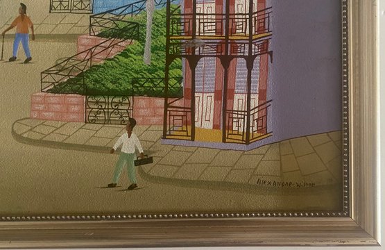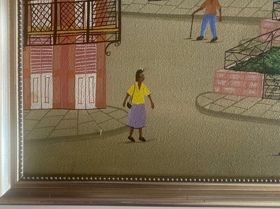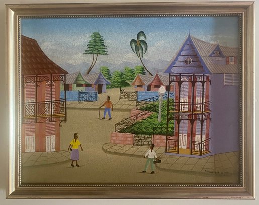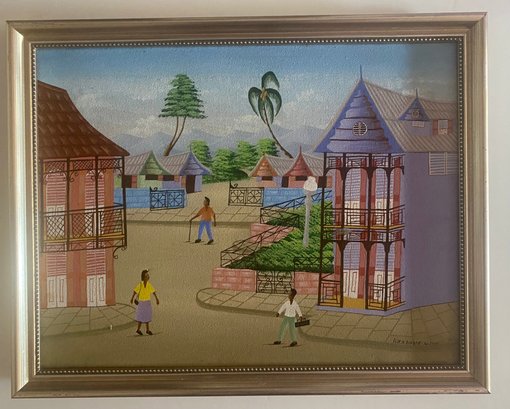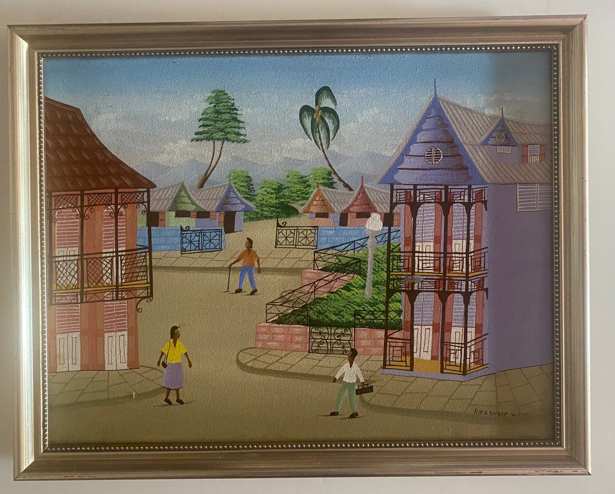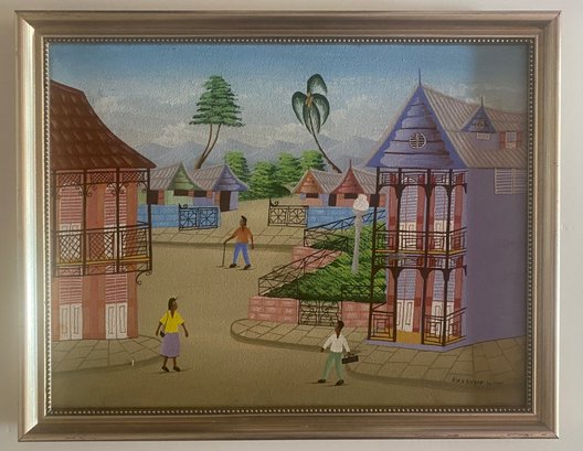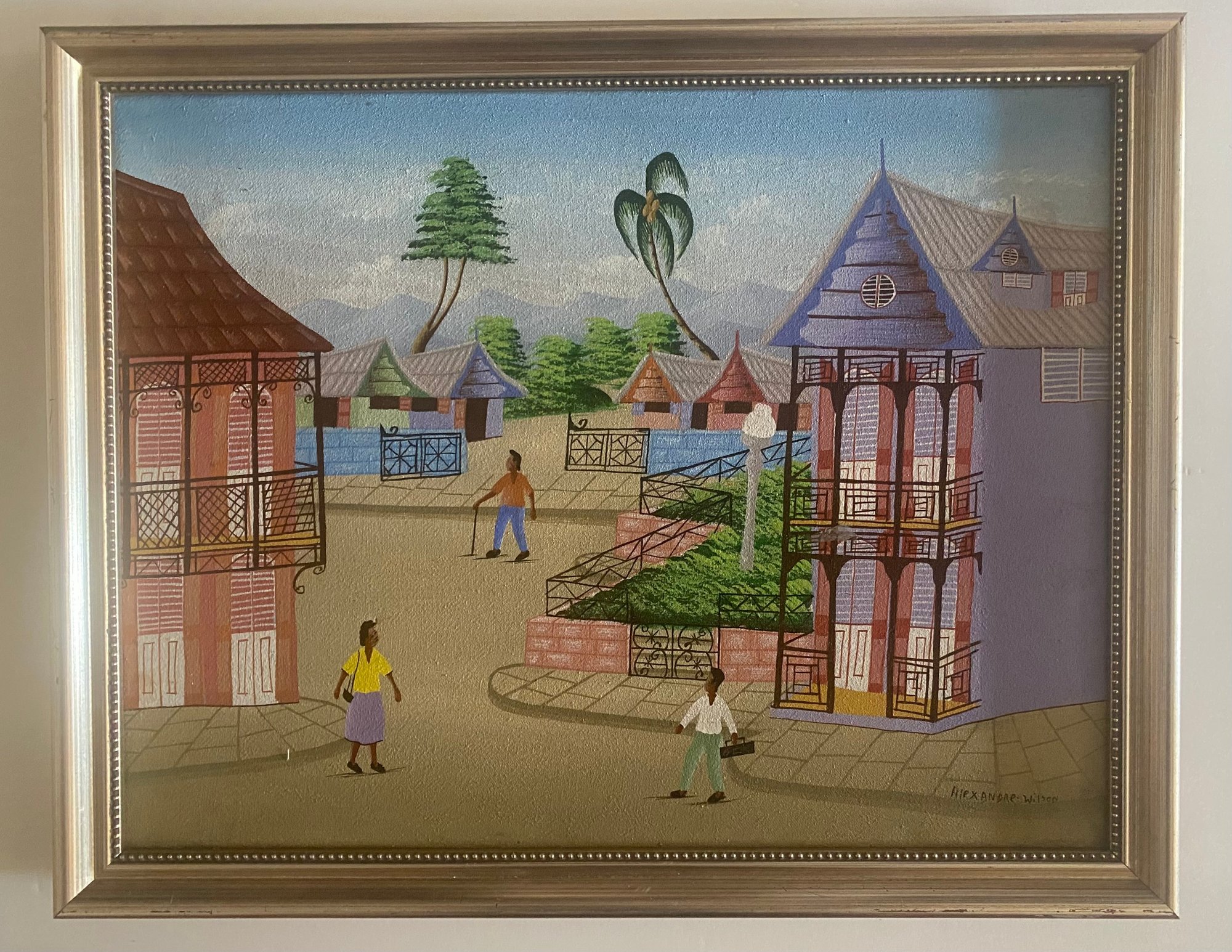 A colorful village scene with people walking on a dirt road, surrounded by houses with intricate balconies and fences. The sky is a bright blue, and there are palm trees and other foliage in the background.