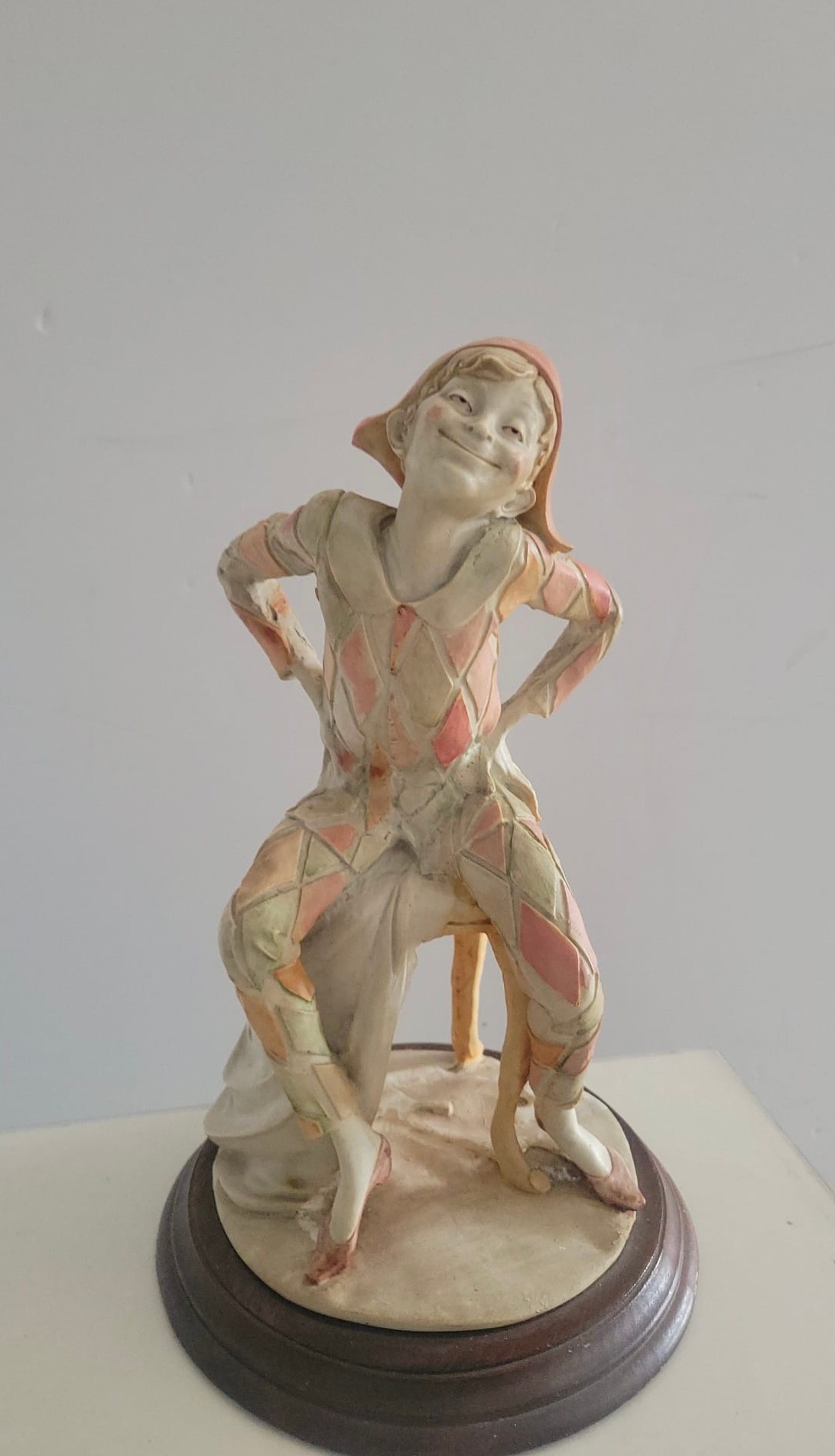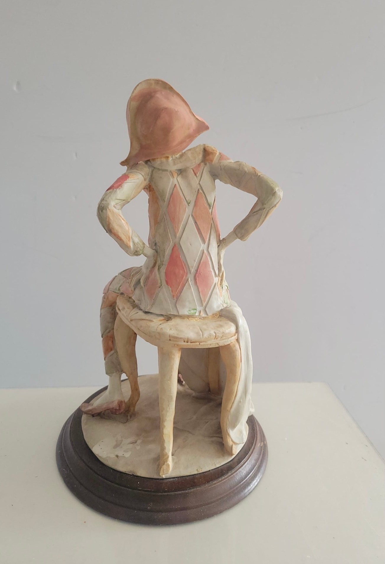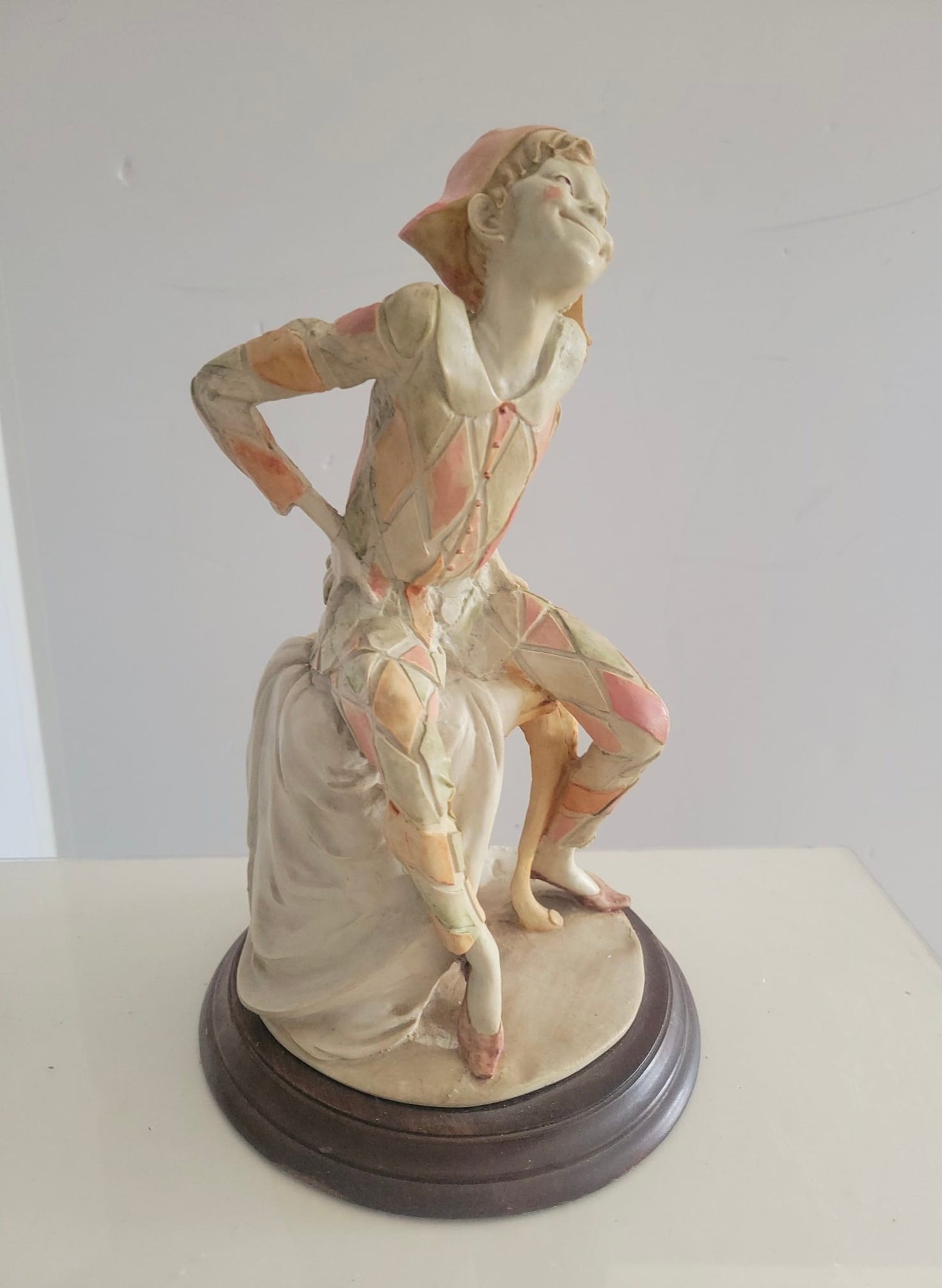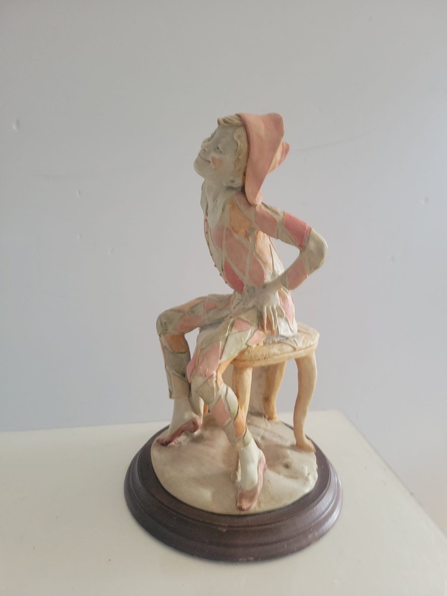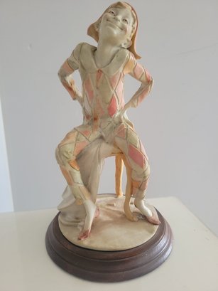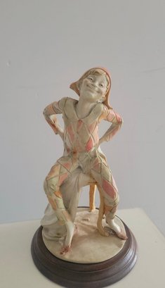 Vintage Giuseppe Armani Capodimonte figurine depicting a seated harlequin jester.