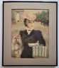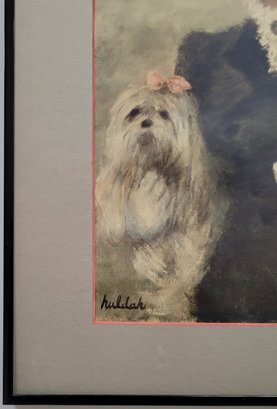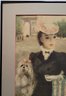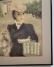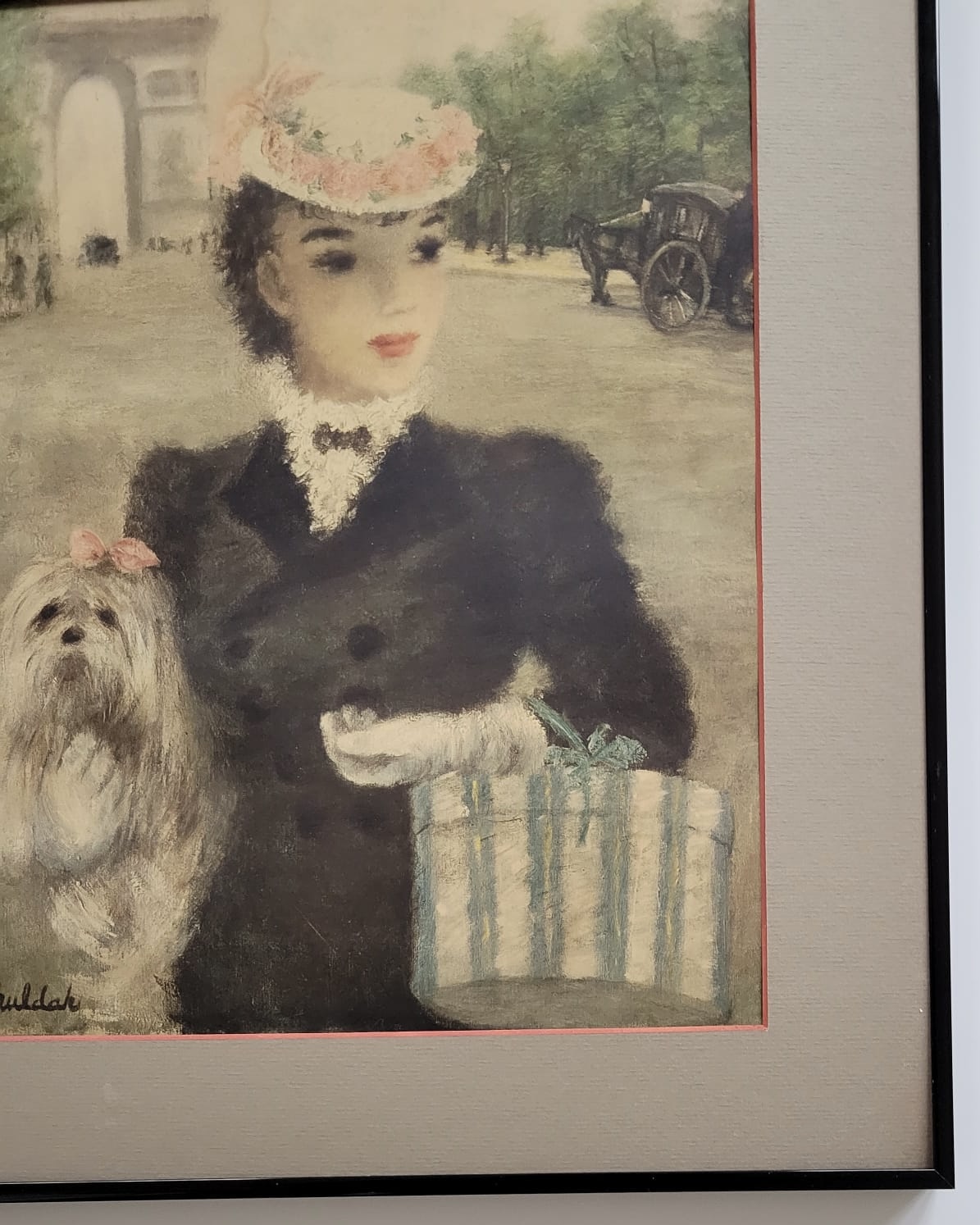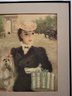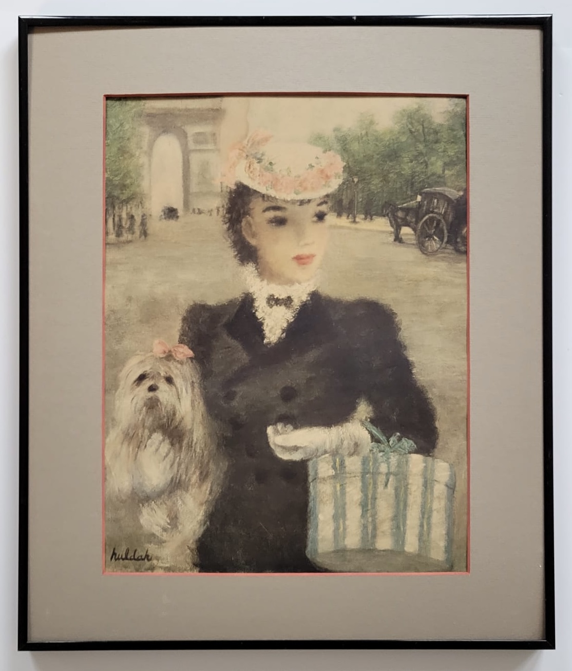 This image seems to depict a woman in a fashionable outfit, accompanied by a small dog, set against the backdrop of an archway, possibly the Arc de Triomphe. The signature "Hulda" suggests that the artist is named Hulda. The style suggests it may be a vintage or impressionistic artwork. Single Mat With Black Metal Frame. Frame Size 15 1/2x 18 1/4
