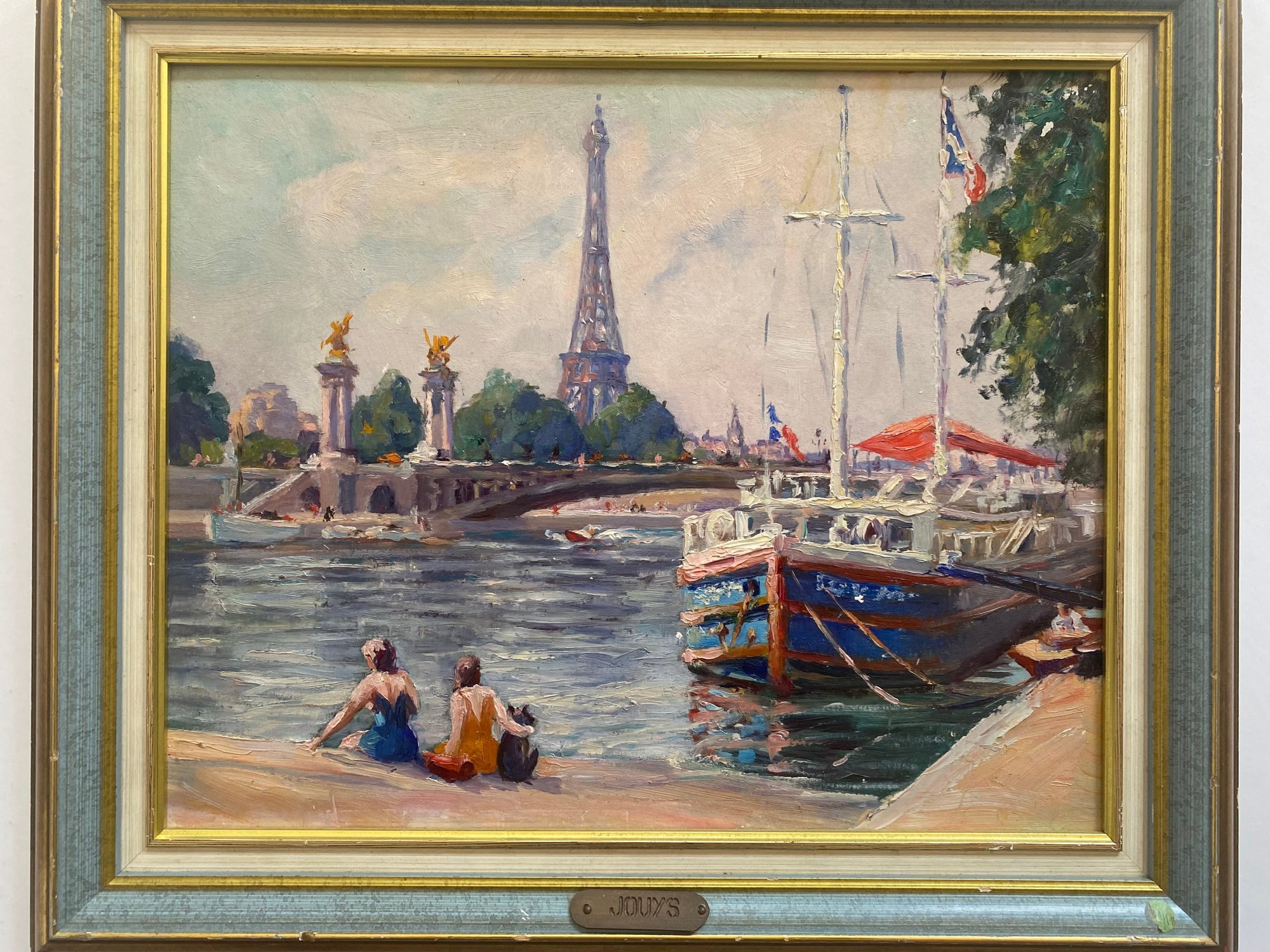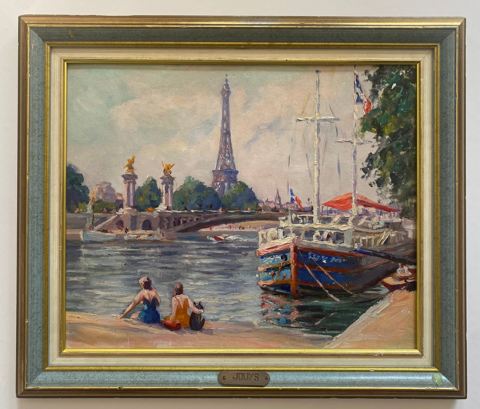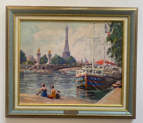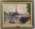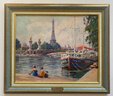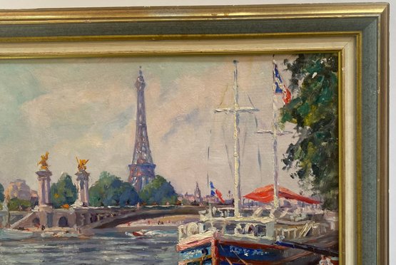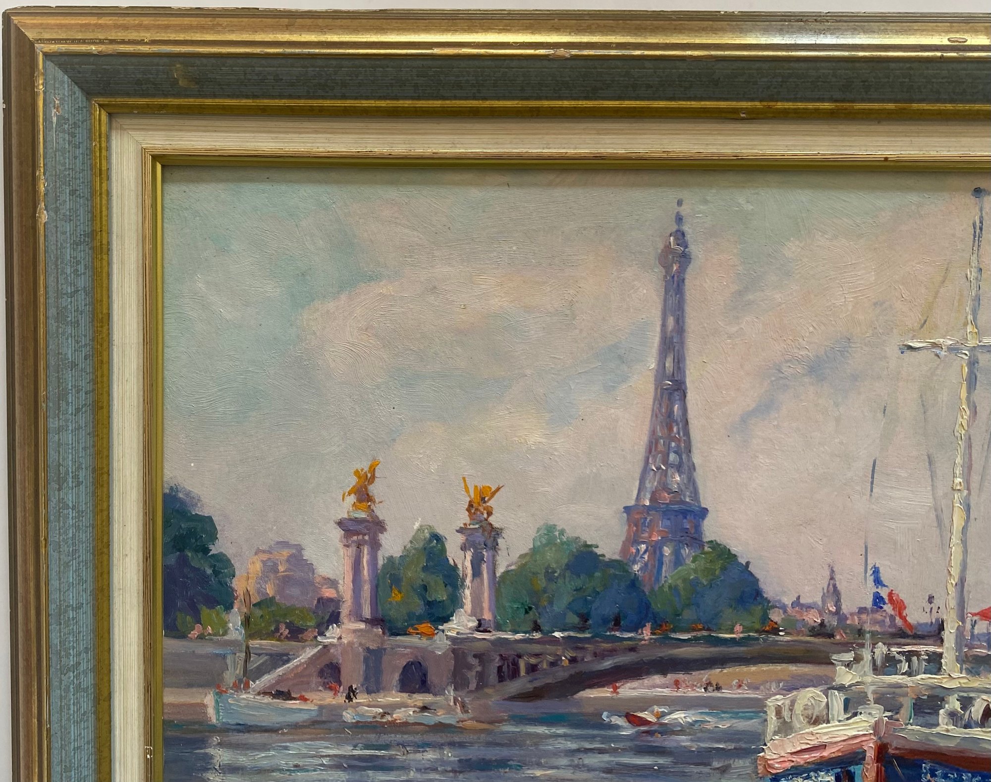 Vintage Impressionist Painting on Board of France Scene. This painting depicts a scene at the Pont Alexandre III (Alexander III Bridge) in Paris, with the Eiffel Tower visible in the background.