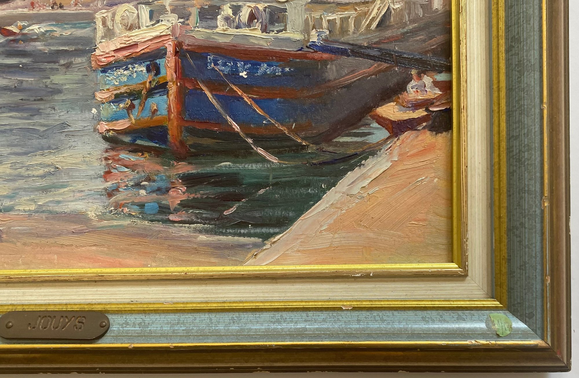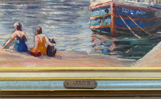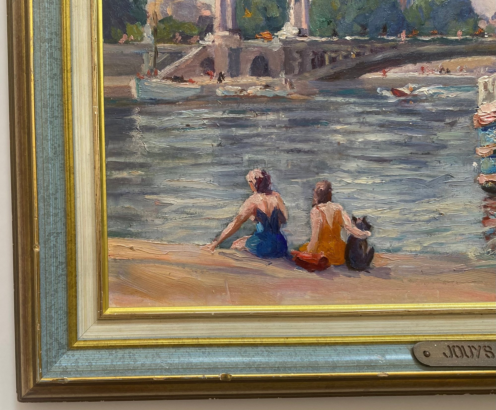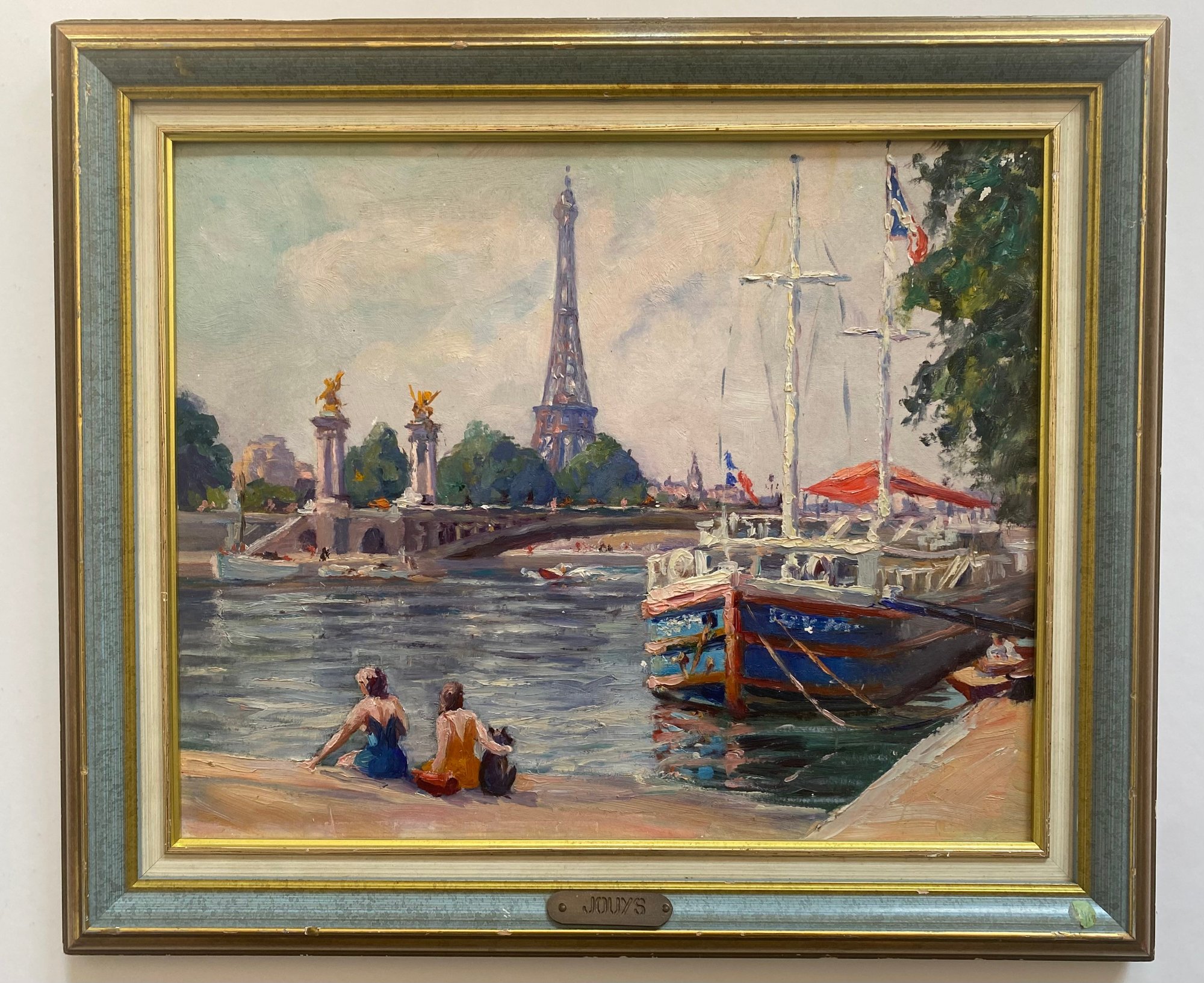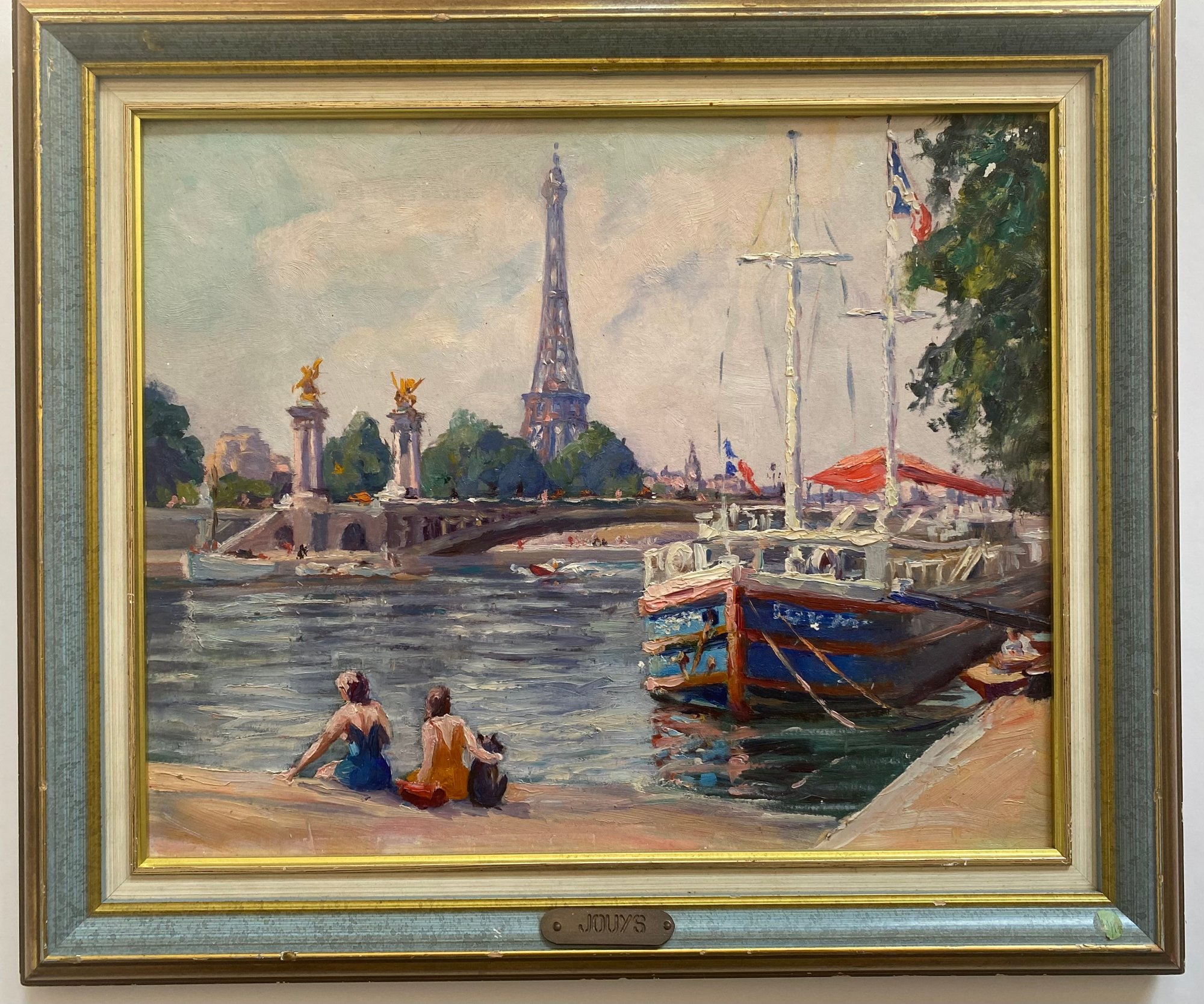 Vintage Impressionist Painting on Board of France Scene. This painting depicts a scene at the Pont Alexandre III (Alexander III Bridge) in Paris, with the Eiffel Tower visible in the background.