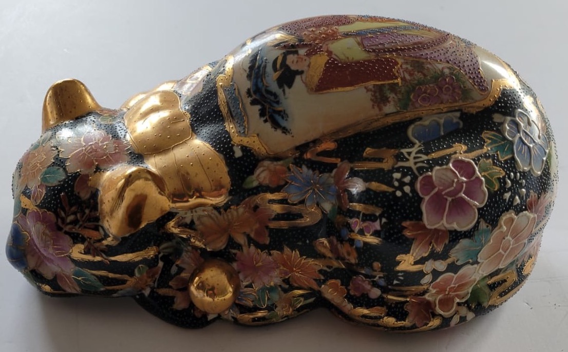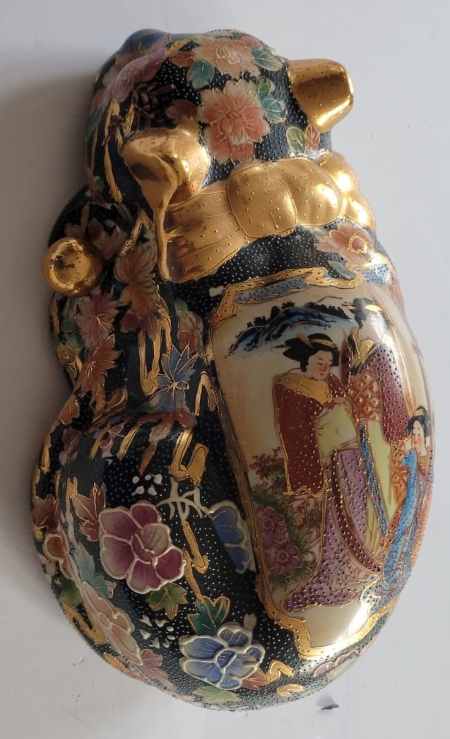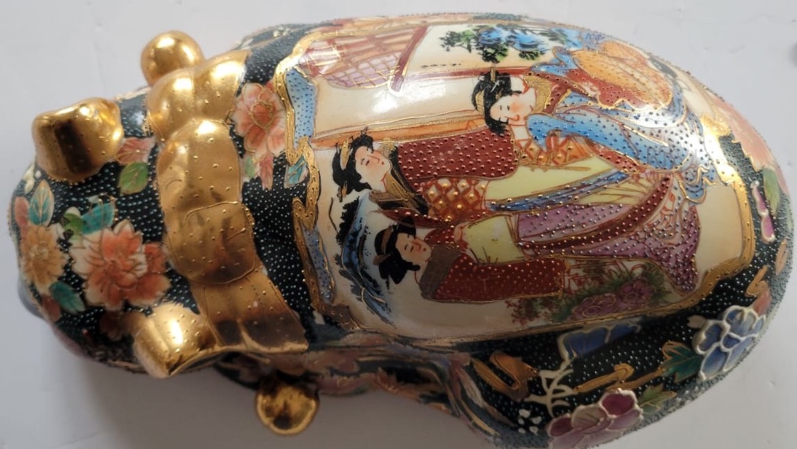 This intricate artwork is a stunning example of traditional Japanese Satsuma-style pottery. Featuring hand-painted depictions of elegant figures in traditional attire, the piece is adorned with gold accents and detailed floral mofifs on a textured black background. The craftsmanship highlights rich cultural narratives and a keen attention to detail, making it a valuable collector’s item or a beautiful centerpiece for any decor. Its unique blend of artistry and heritage ensures it will captivate admirers and enthusiasts alike.