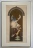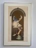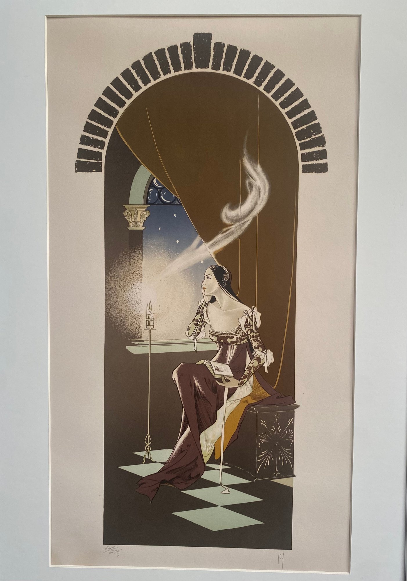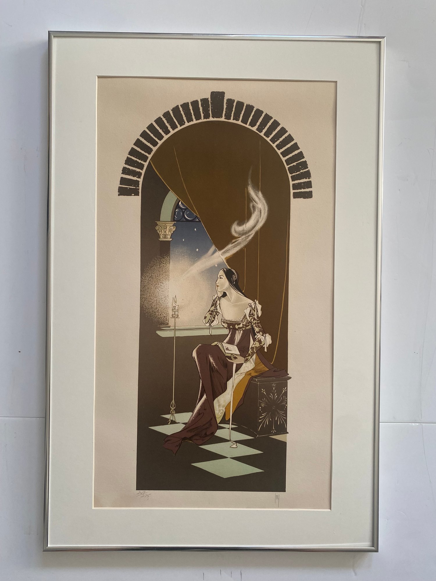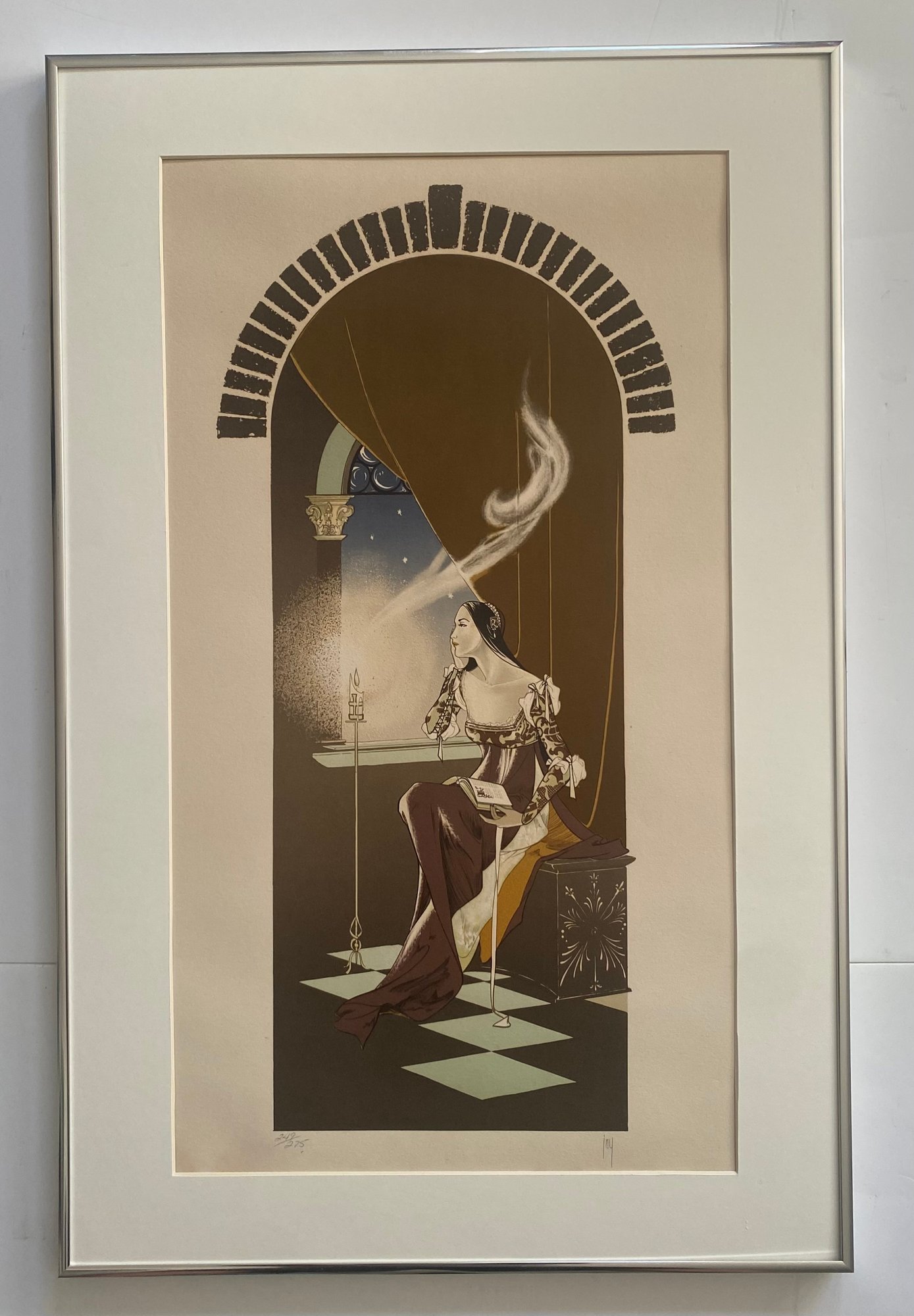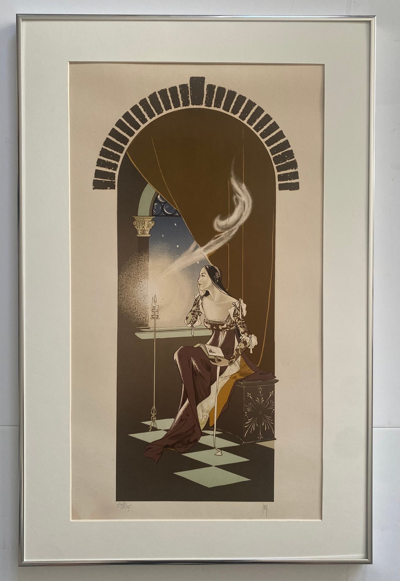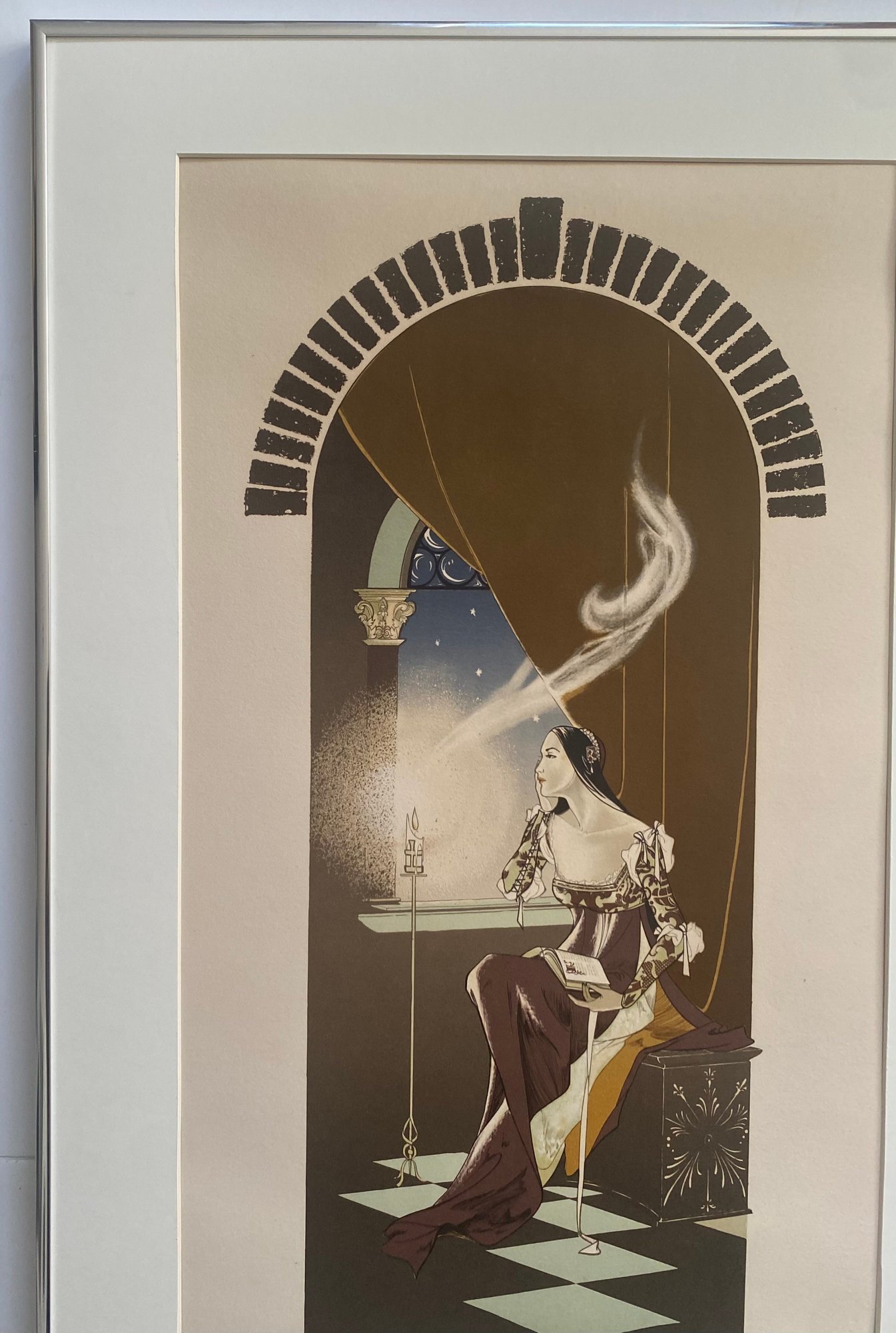 The print depicts a woman seated by a window in what appears to be a tower or arched alcove.