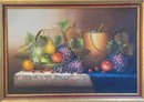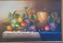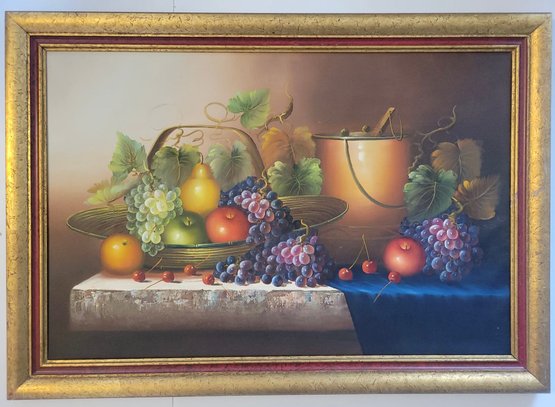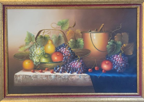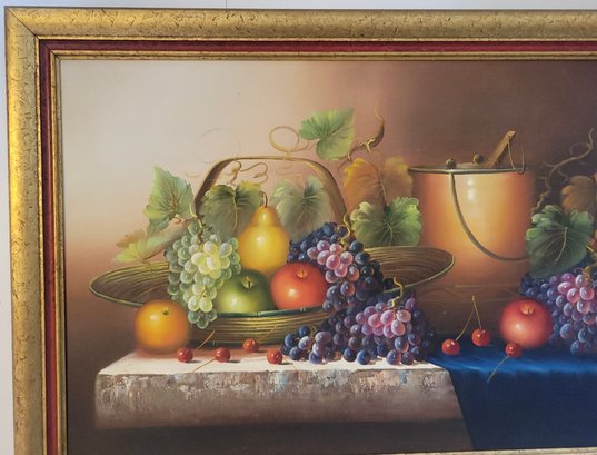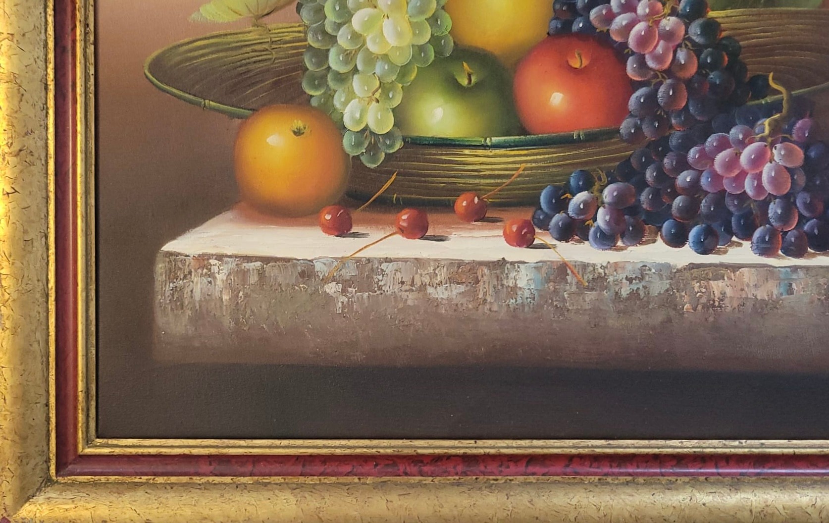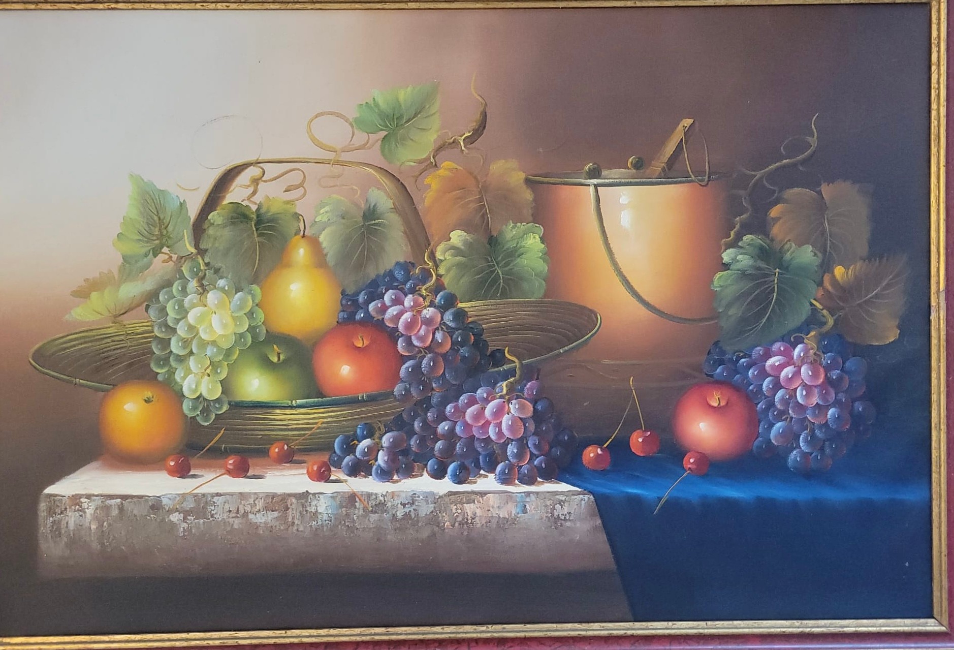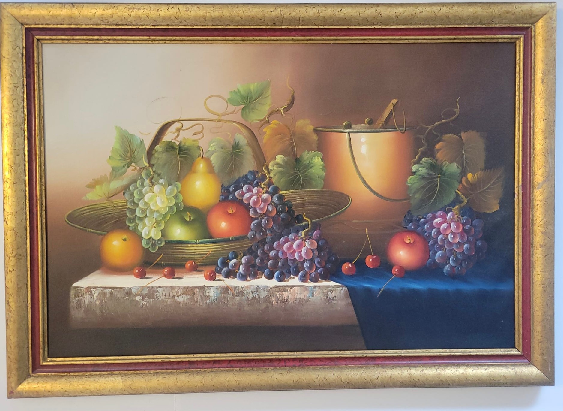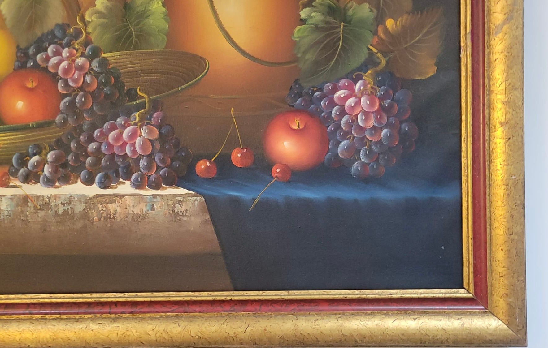 Vintage oil painting on canvas features a classic still life scene with a fruit basket and jug.