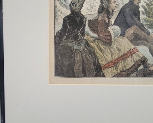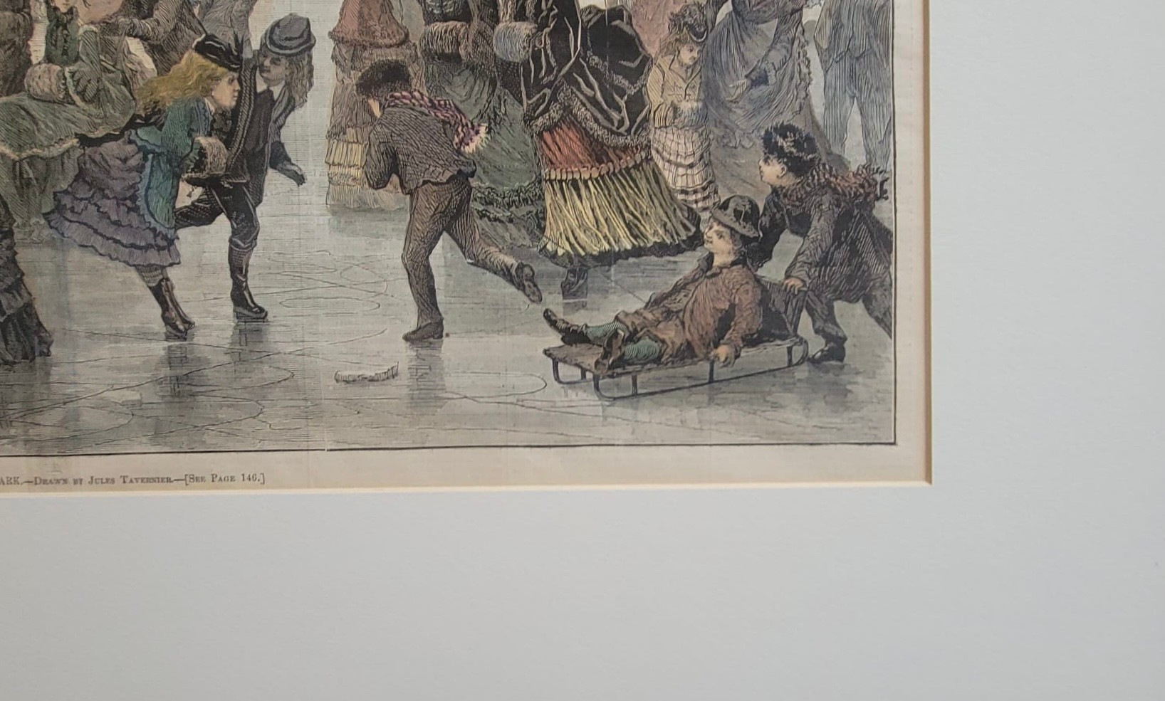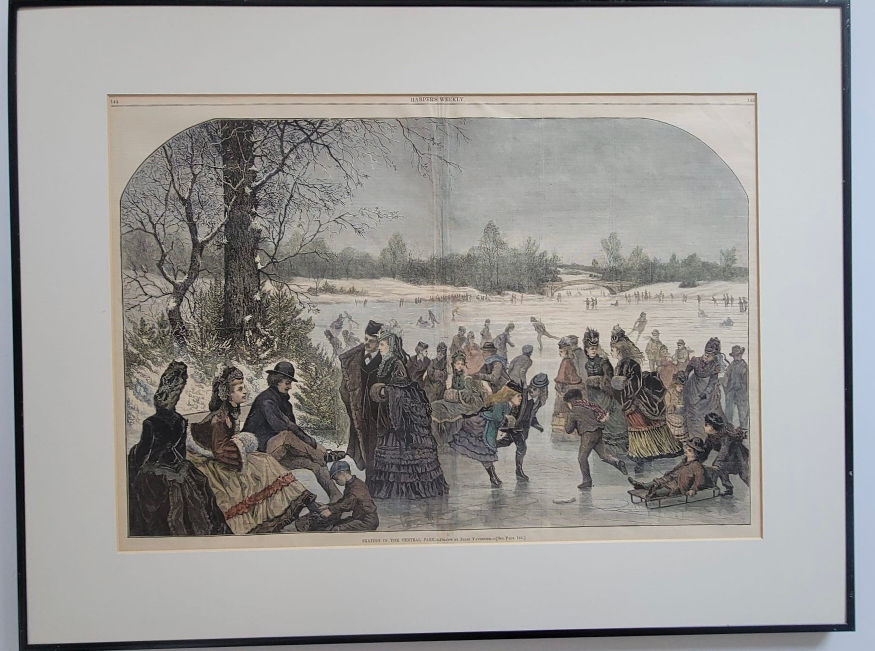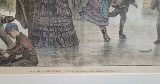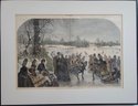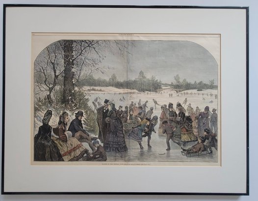 Vintage print is titled "Skating in the Central Park" (1872), an illustration by Jules Tavernier. It was originally published as a double-page centerfold in Harper's Weekly on February 17, 1872.