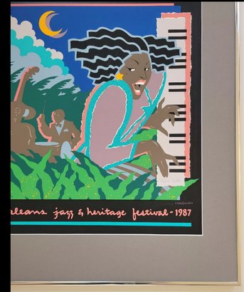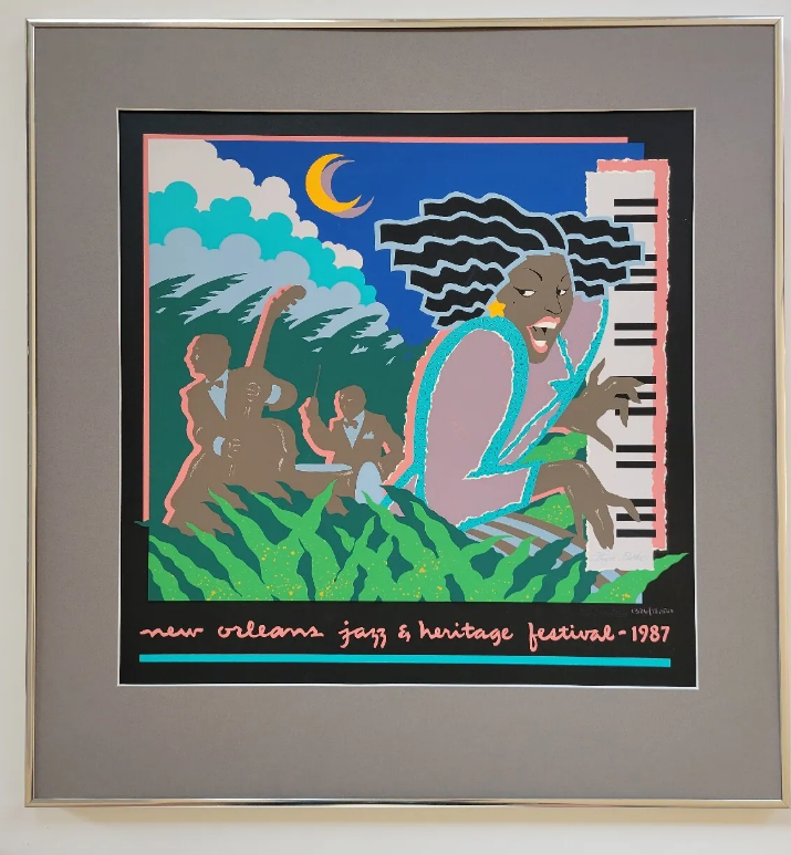 This vintage silkscreen print from 1987 depicts the Orleans Jazz Heritage and is a limited edition piece. It has been hand signed and is a beautiful addition to any art collection. The print features vibrant colors and intricate details that capture the essence of jazz music. Created with the silkscreen technique, this piece is a unique work of art that celebrates the jazz culture of New Orleans. The print is in excellent condition and is ready to be displayed in your home or office. Vintage SILKSCREEN 1987 Orleans Jazz Heritage , Limited Edition , Hand signed.Good condition, single mat, silver metal frame. Art size ( 18 1/2 x 18 1/2 ). Frame size ( 24 × 25 )