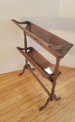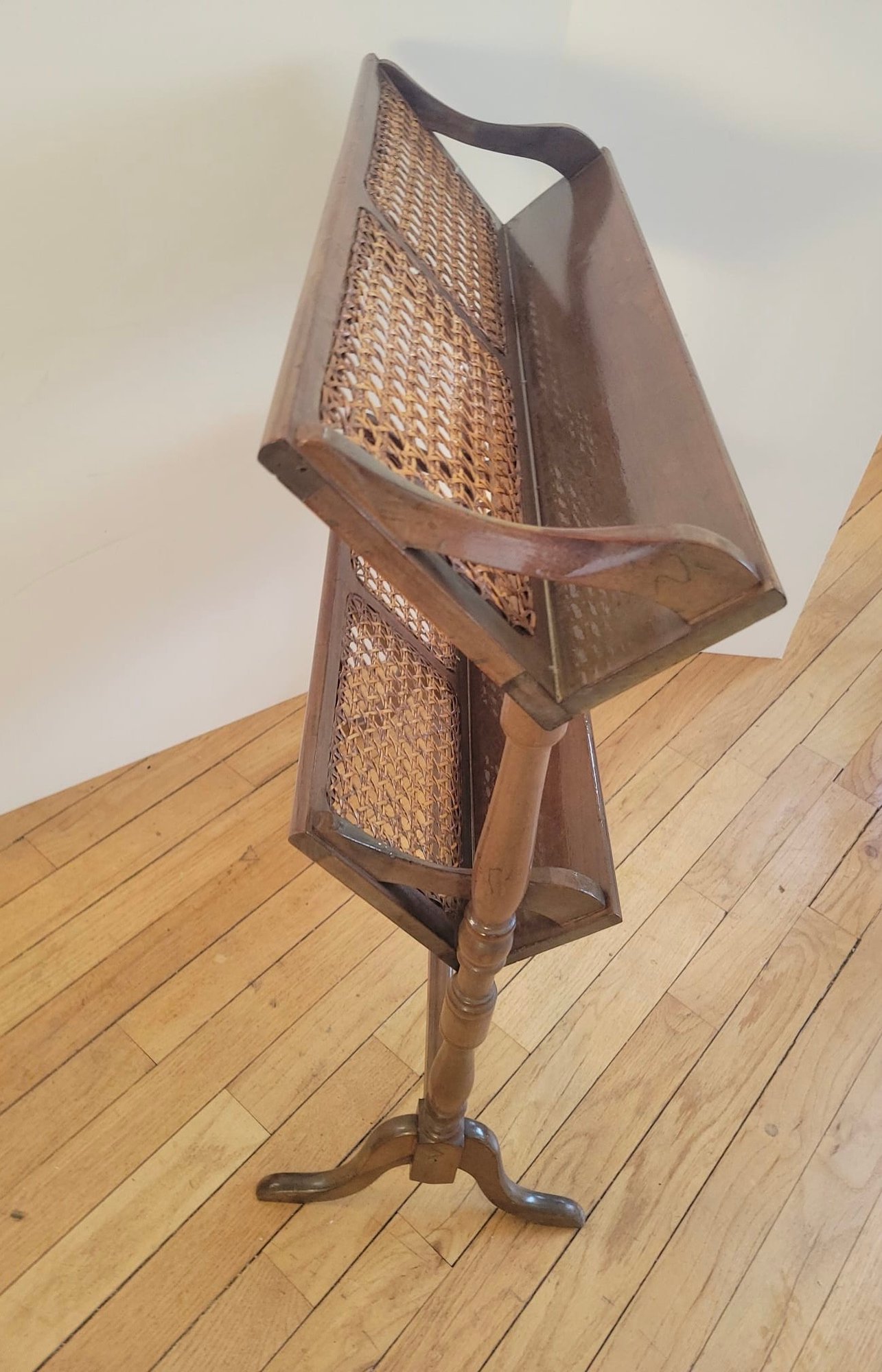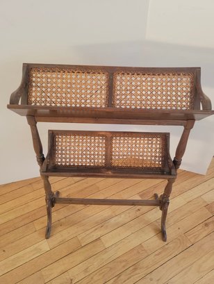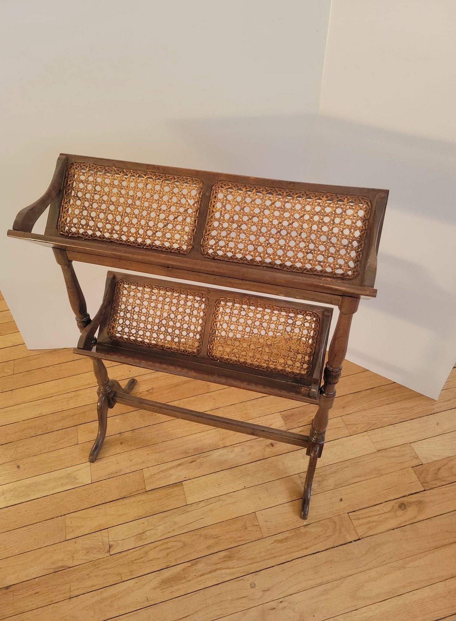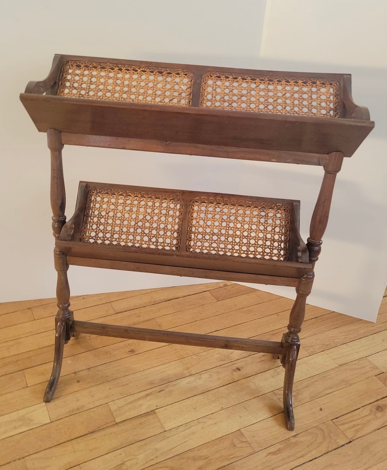 This vintage wood and wicker 2-layer magazine rack is a mid-century style piece designed for holding newspapers, books, or magazines.
