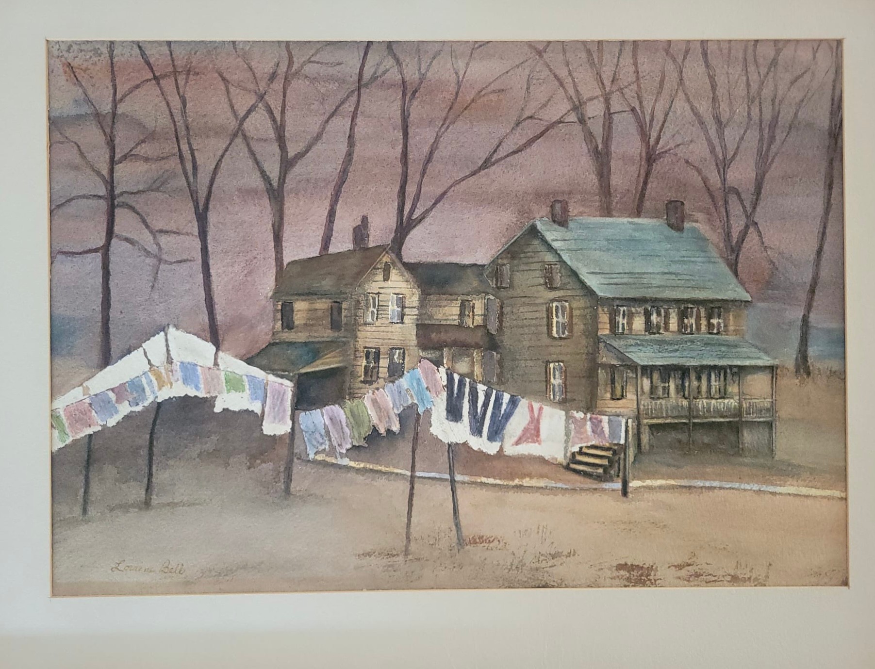 Water color of Rustic House by Lorraine Bell. Lorraine Bell, often referred to as "The Wandering Artist," is a self-taught mixed media artist known for her focus on illustrated art journals and urban sketching.