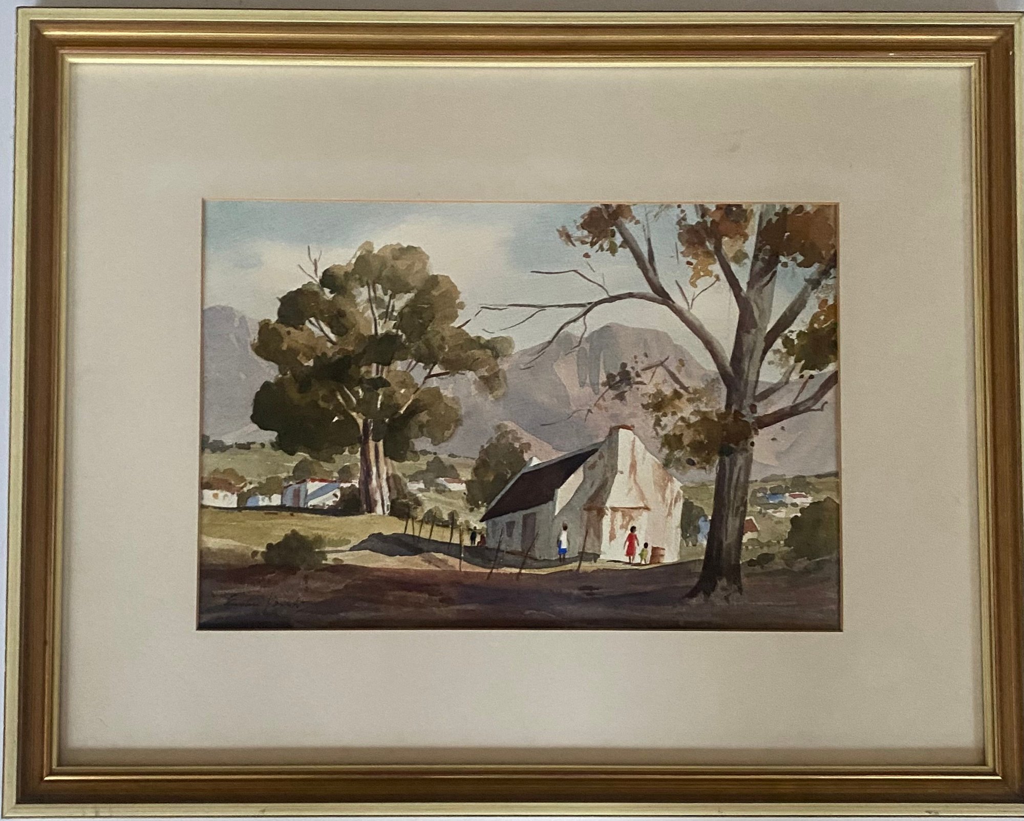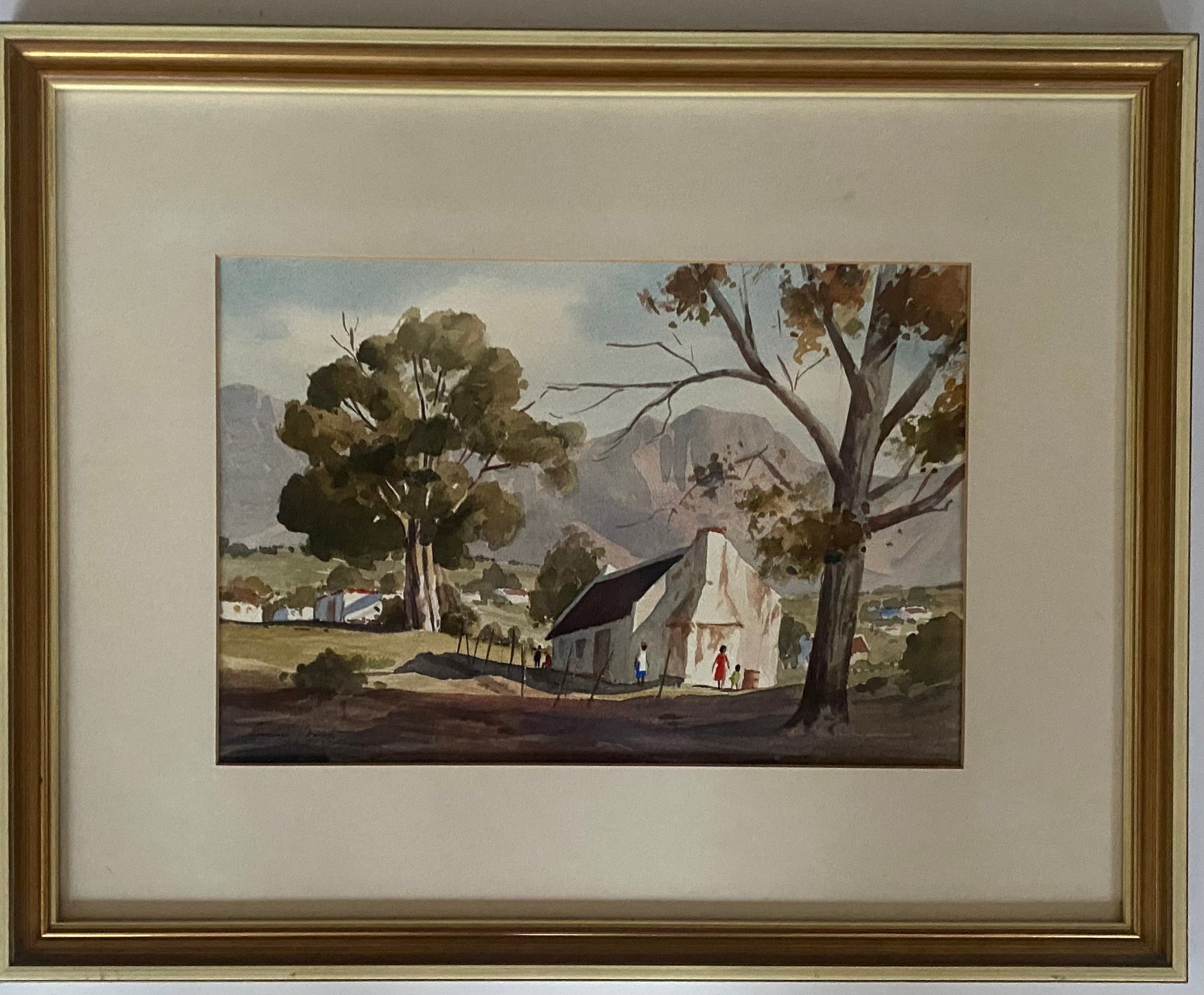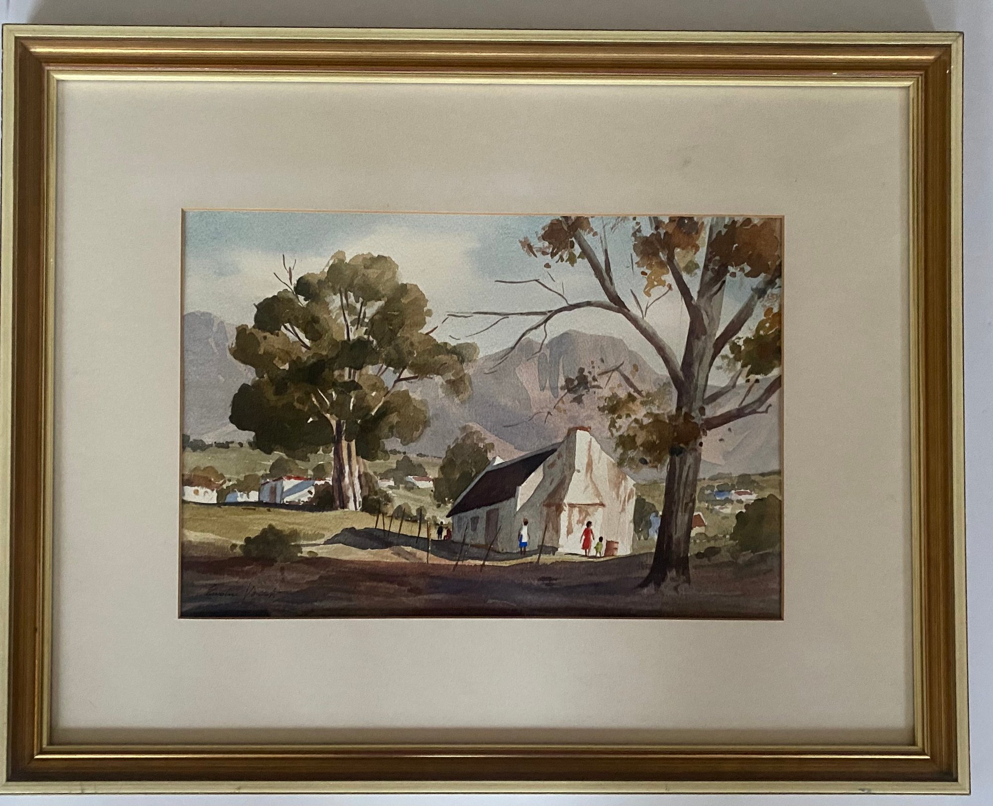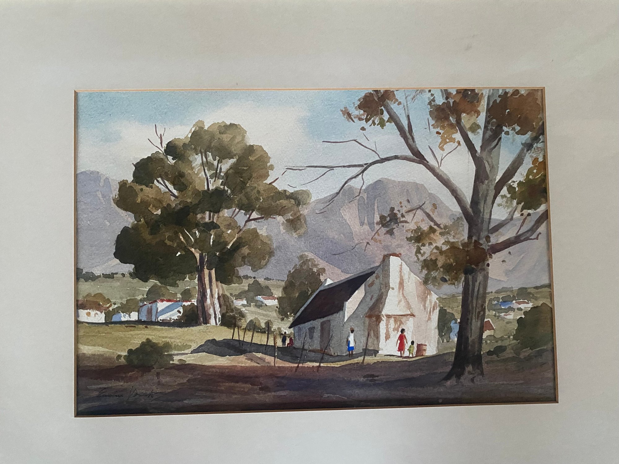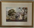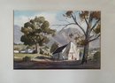 Original watercolor painting depicting a rural landscape scene, possibly of a barn or house in a summer setting. The artwork features a prominent white, single-story building with a dark roof, likely a barn or a farmhouse. The scene includes large trees on both sides and mountains in the background.