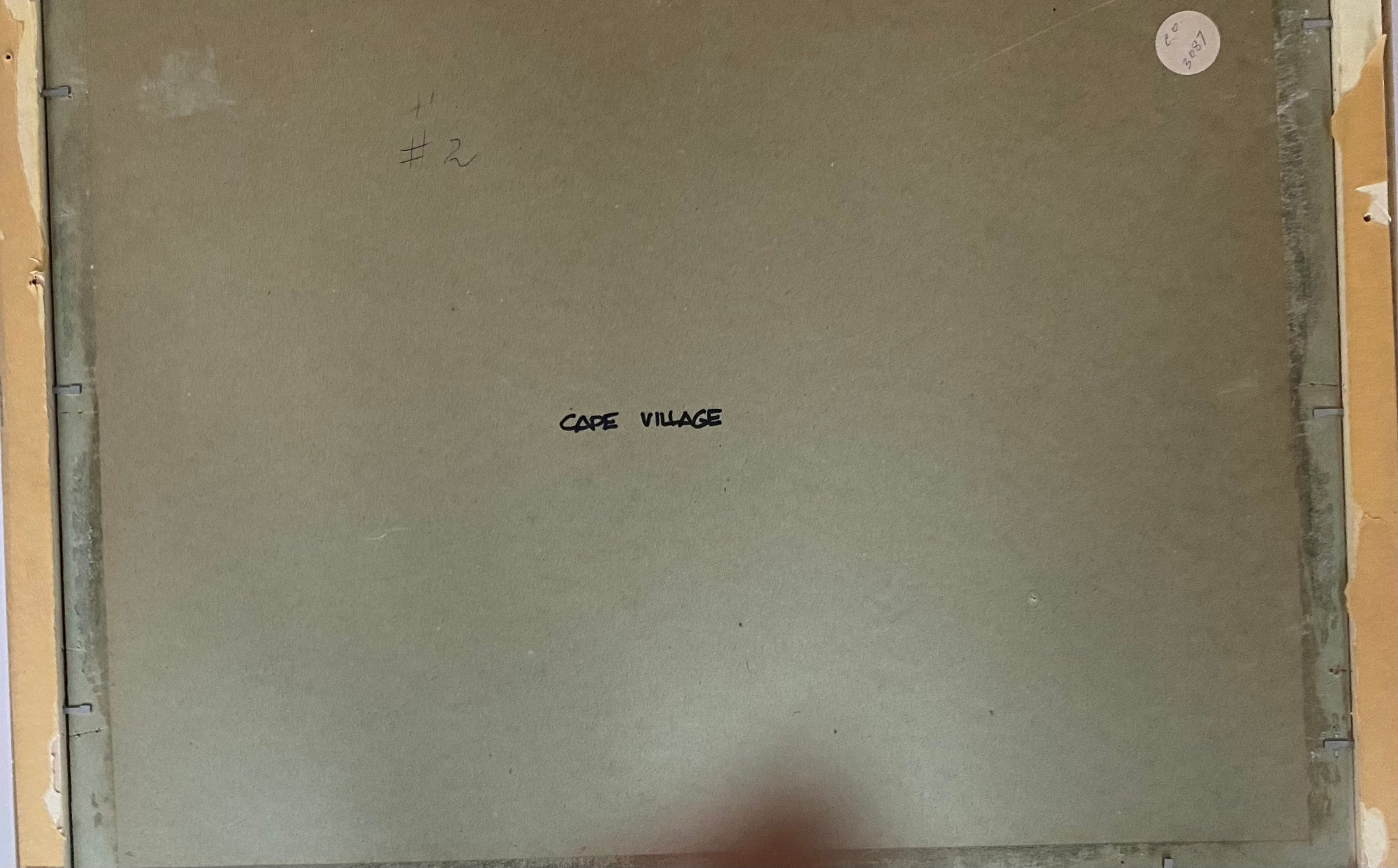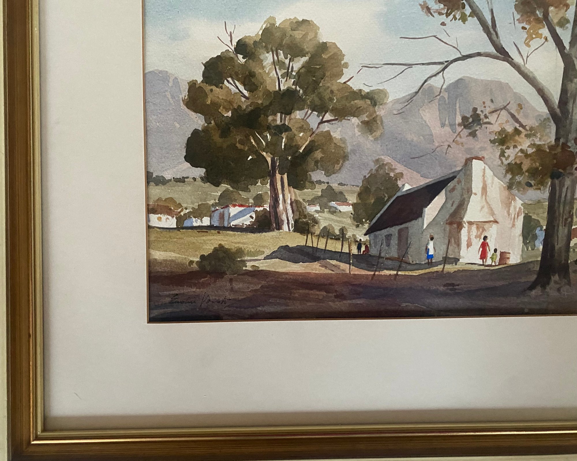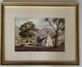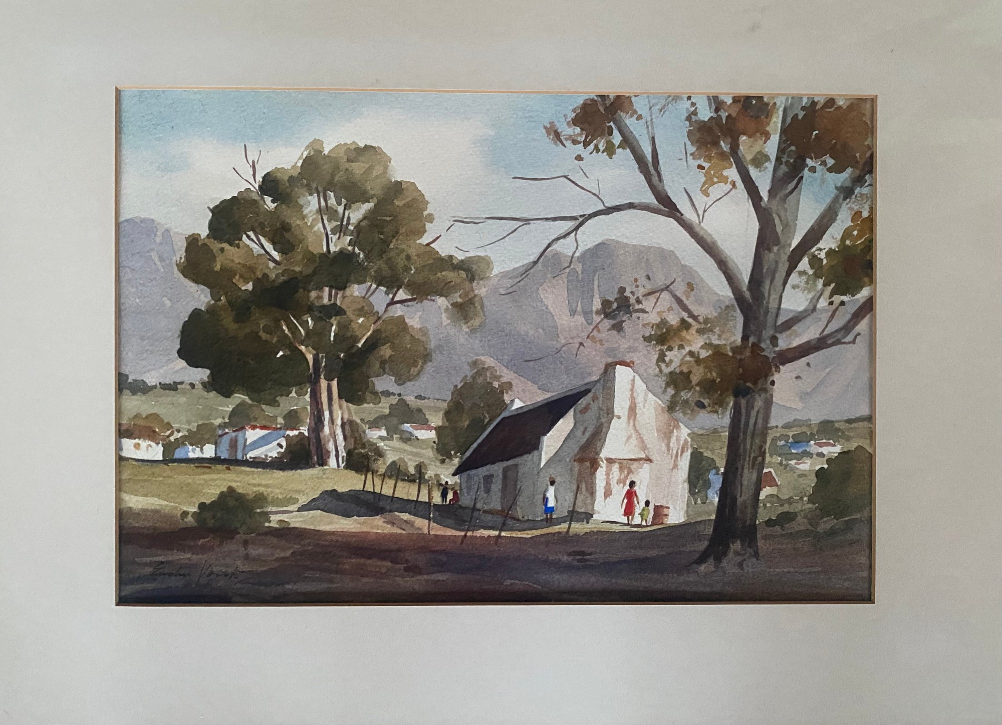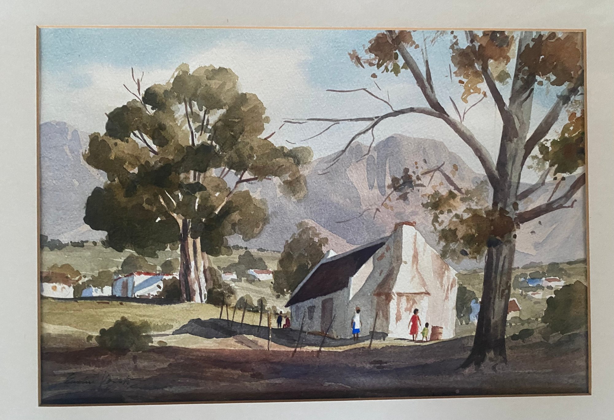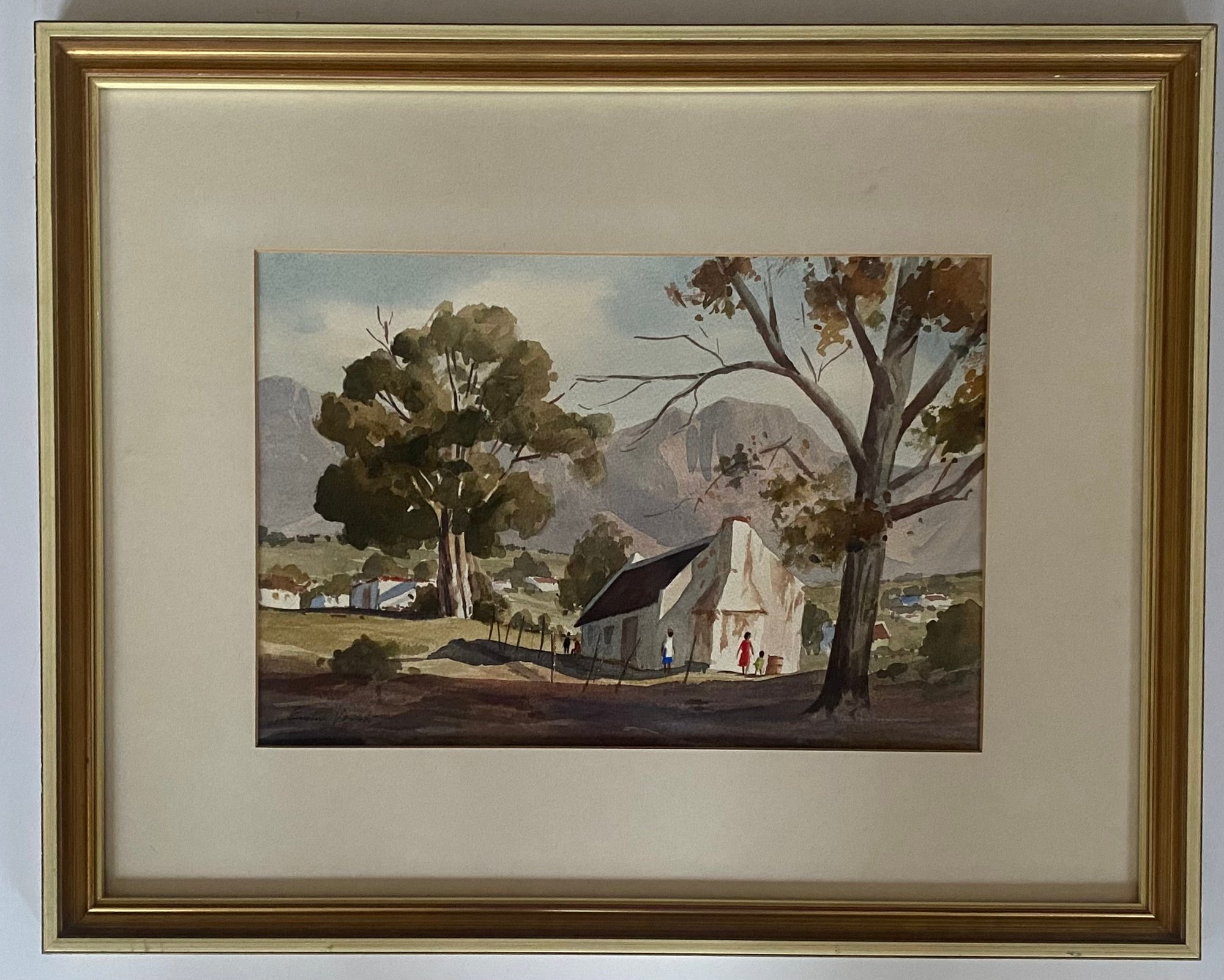Original watercolor painting depicting a rural landscape scene, possibly of a barn or house in a summer setting. The artwork features a prominent white, single-story building with a dark roof, likely a barn or a farmhouse. The scene includes large trees on both sides and mountains in the background.