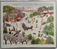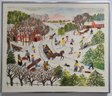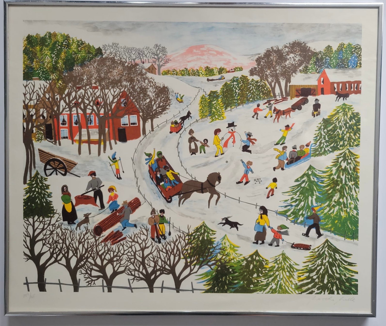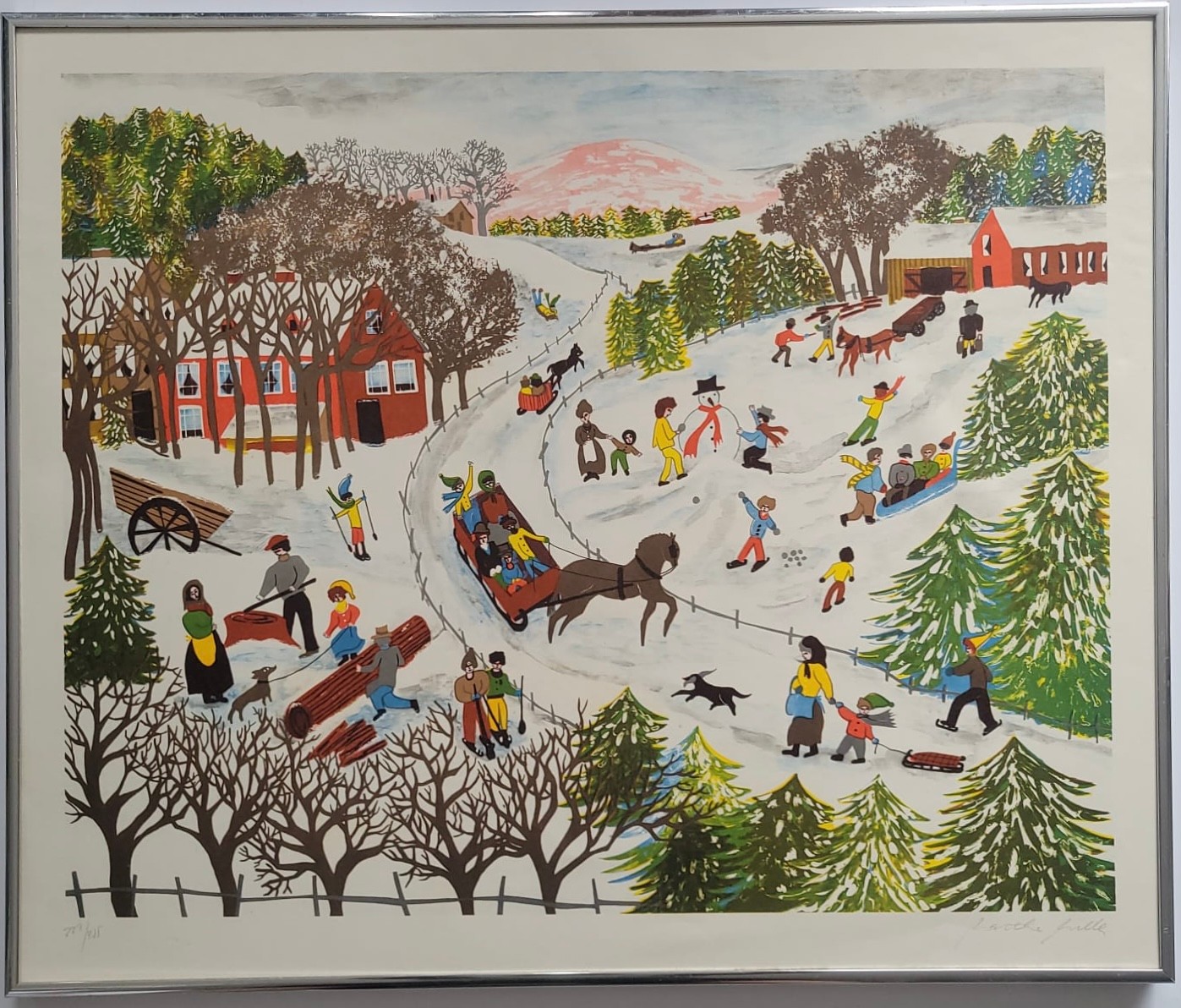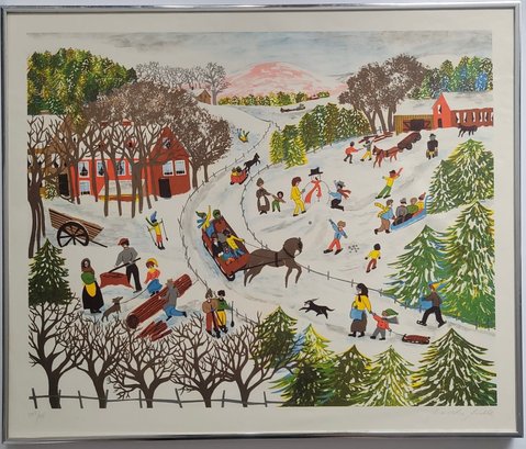 Winter Folk Art Print by Garthe Gille pencile signed and Numbered, The scene depicts a lively, snow-covered landscape filled with various outdoor winter activities typical of Americana folk art style.