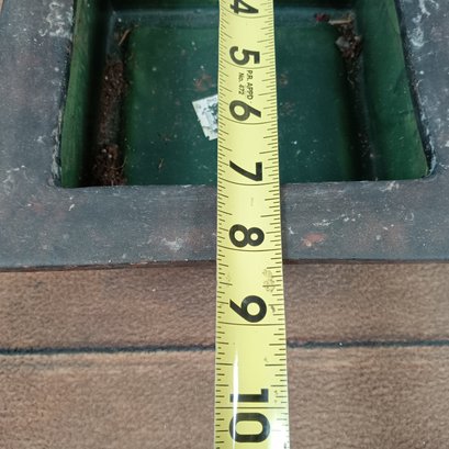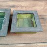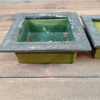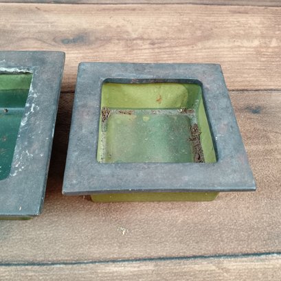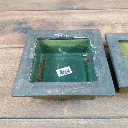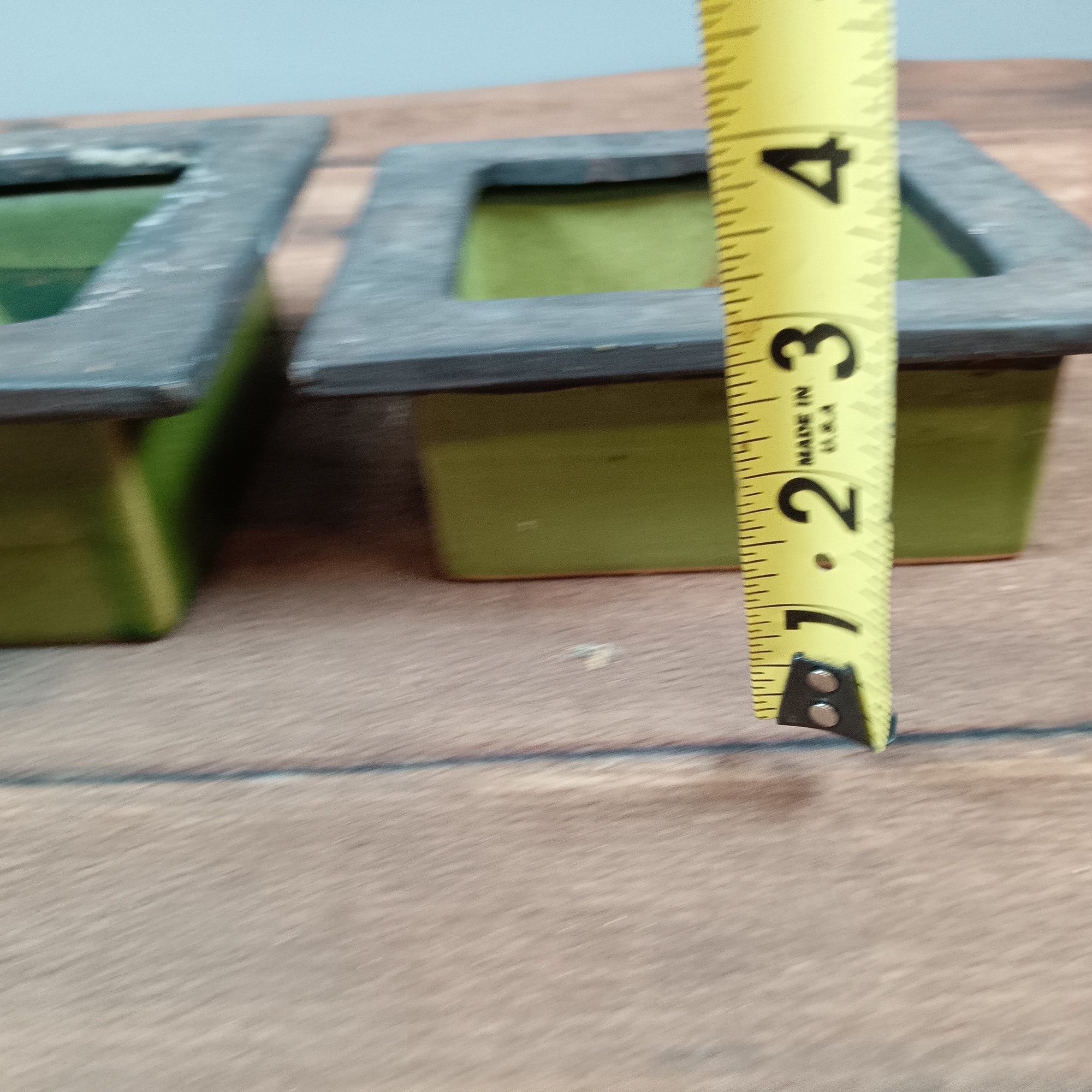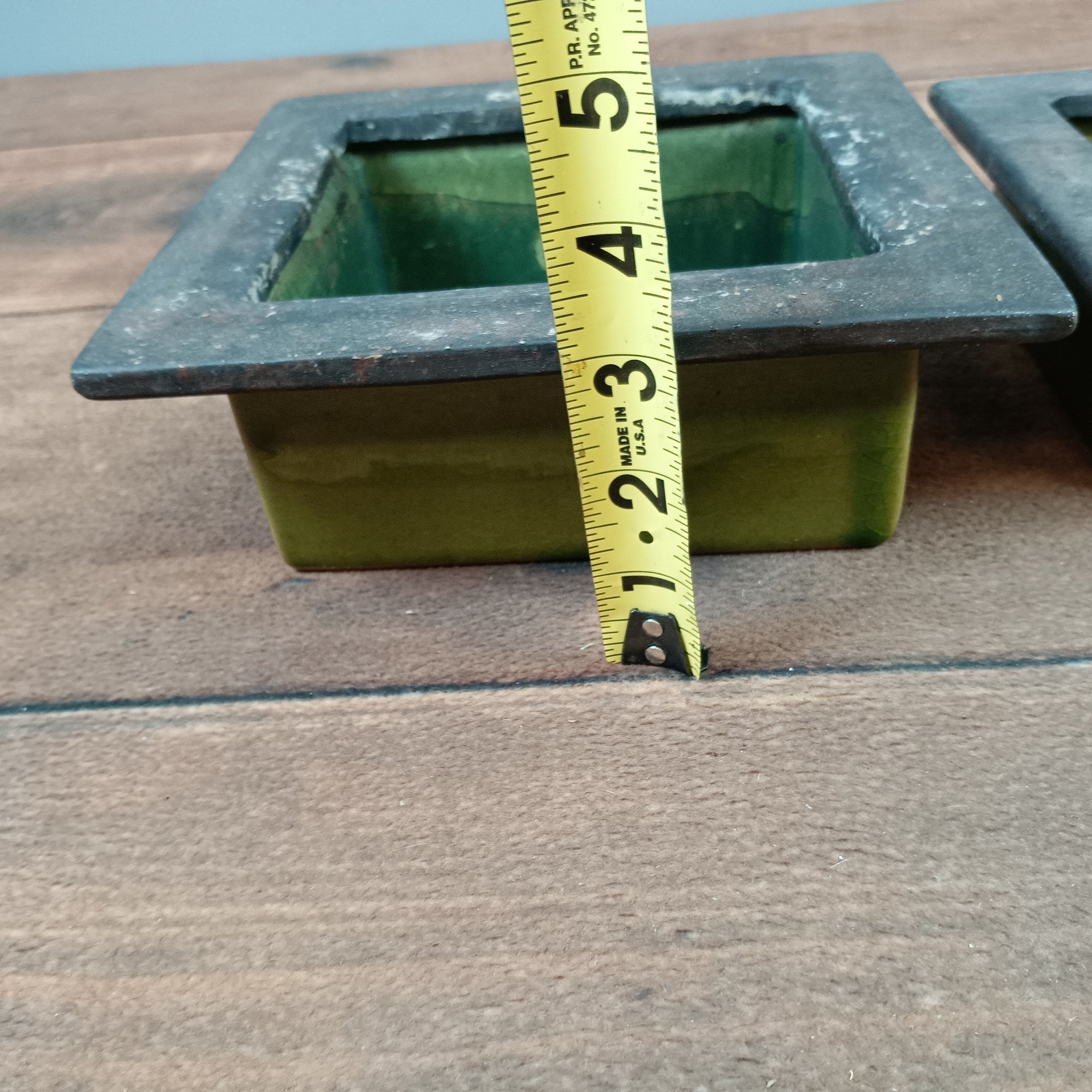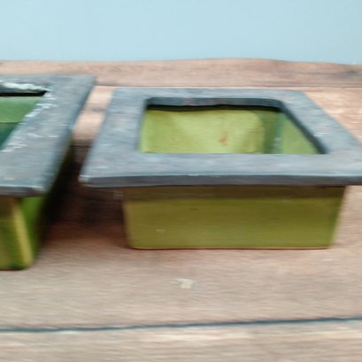 PAIR OF VINTAGE SQUARE CERAMIC PLANTERS with wrought iron lip