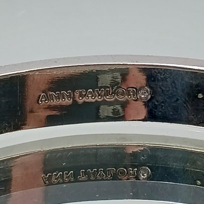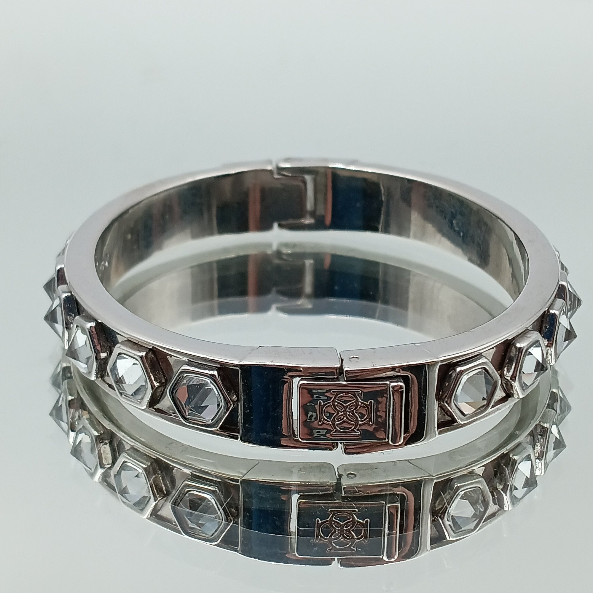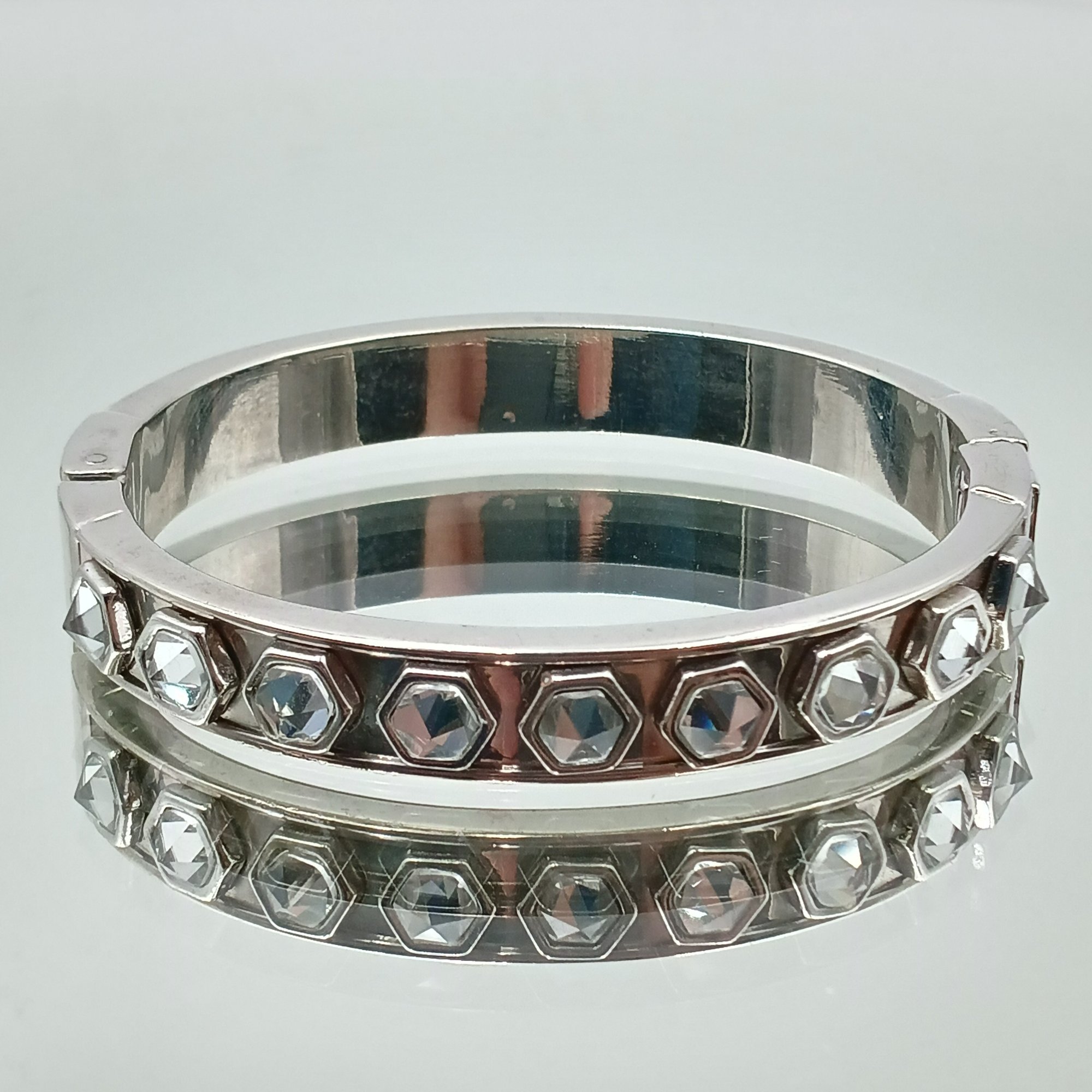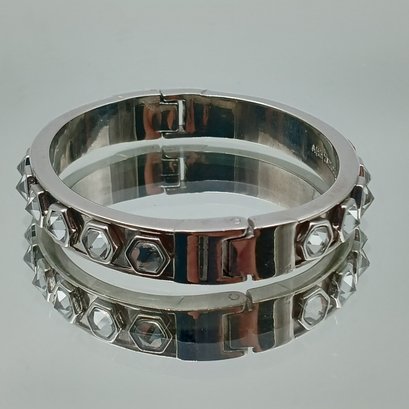 This elegant silver-tone hinged bangle from Ann Taylor features a row of sparkling, rose-cut crystals set within geometric hexagonal frames