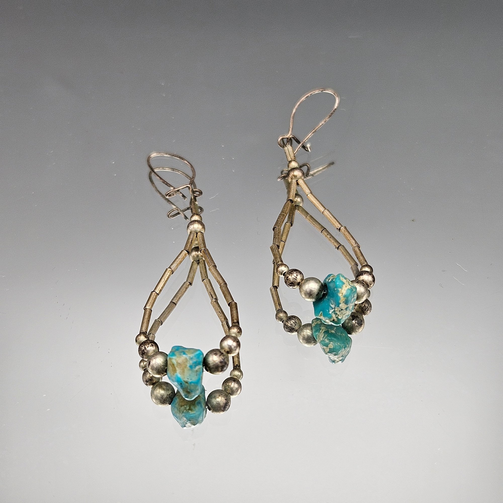 Navajo Liquid Sterling Silver Turquoise Nugget Dangle hoop earrings