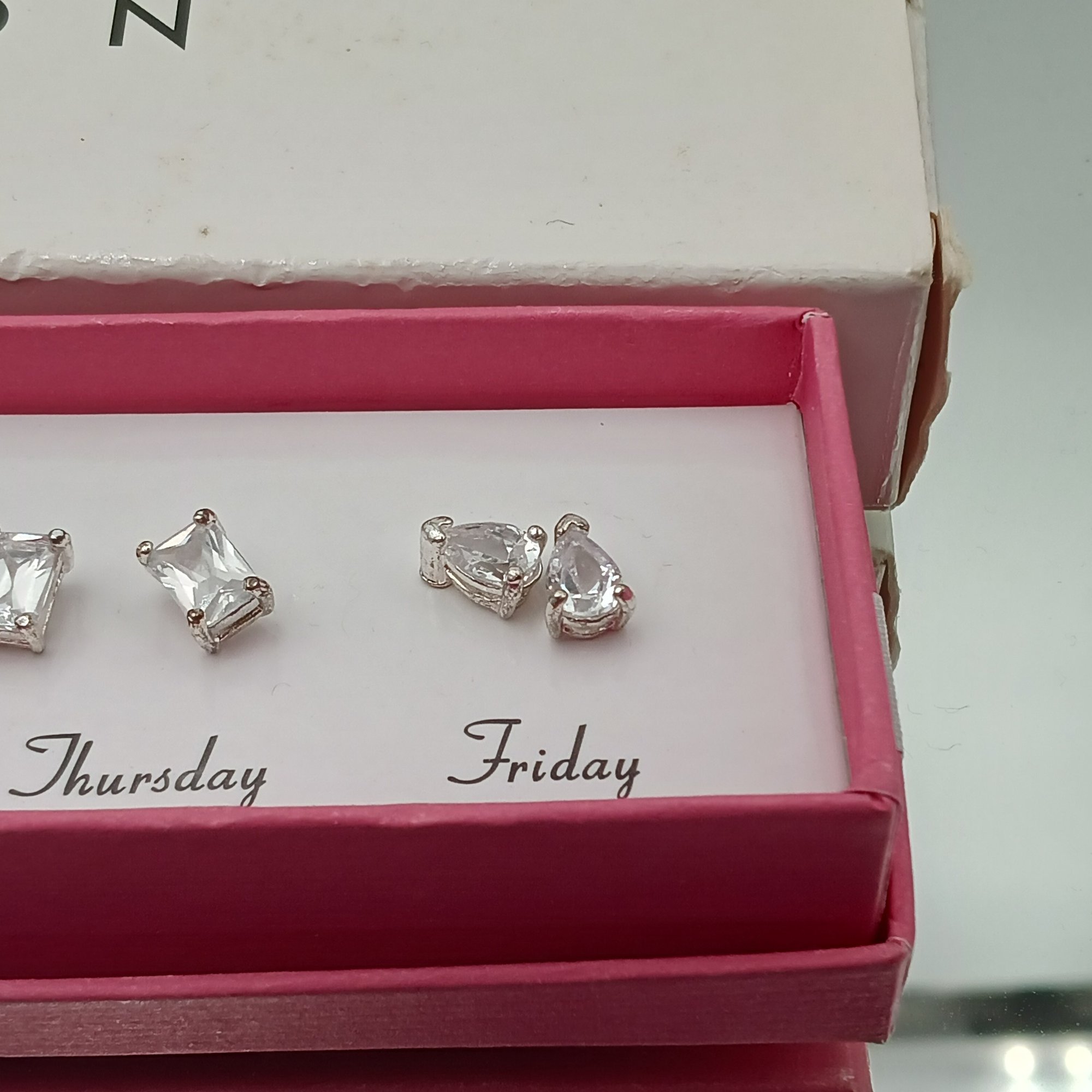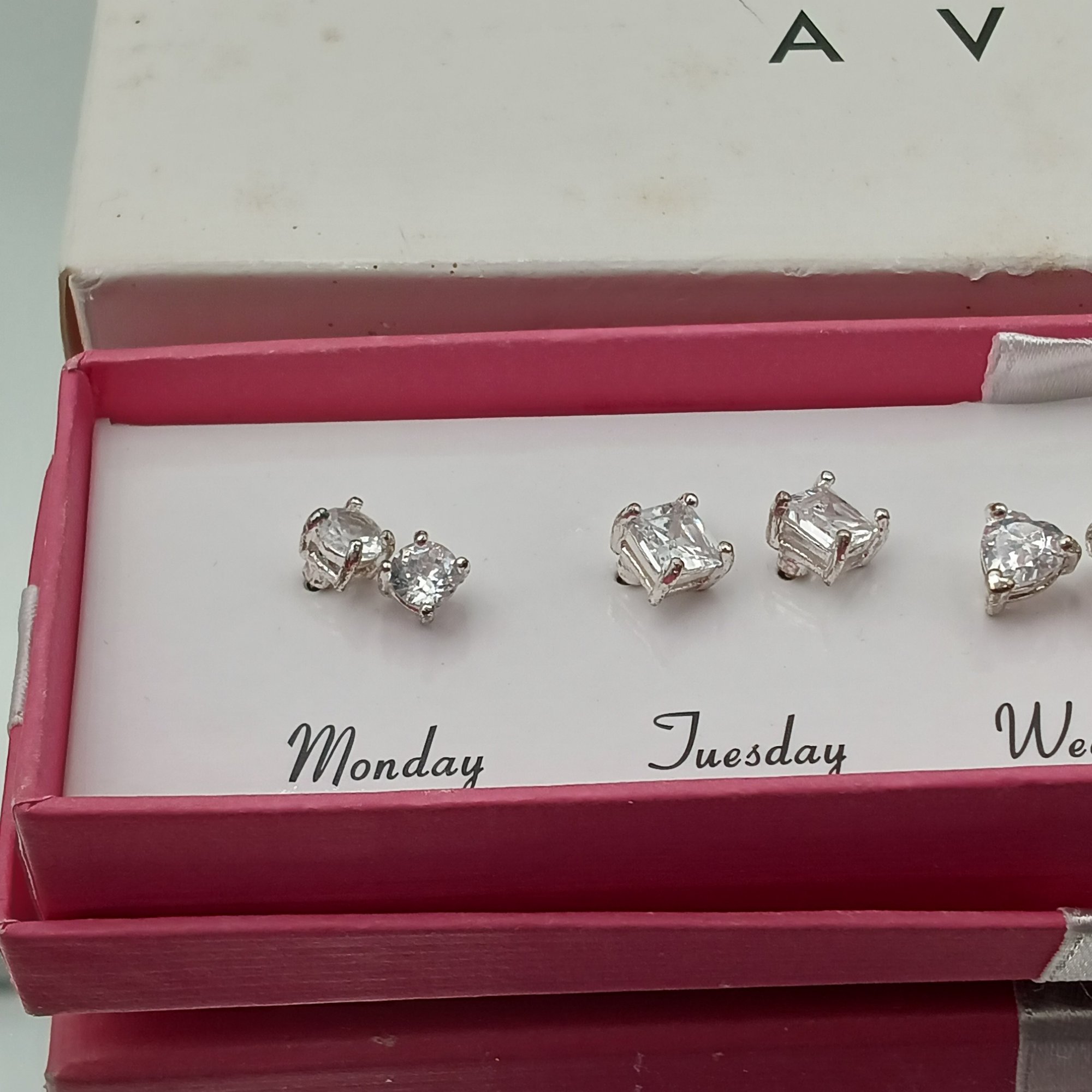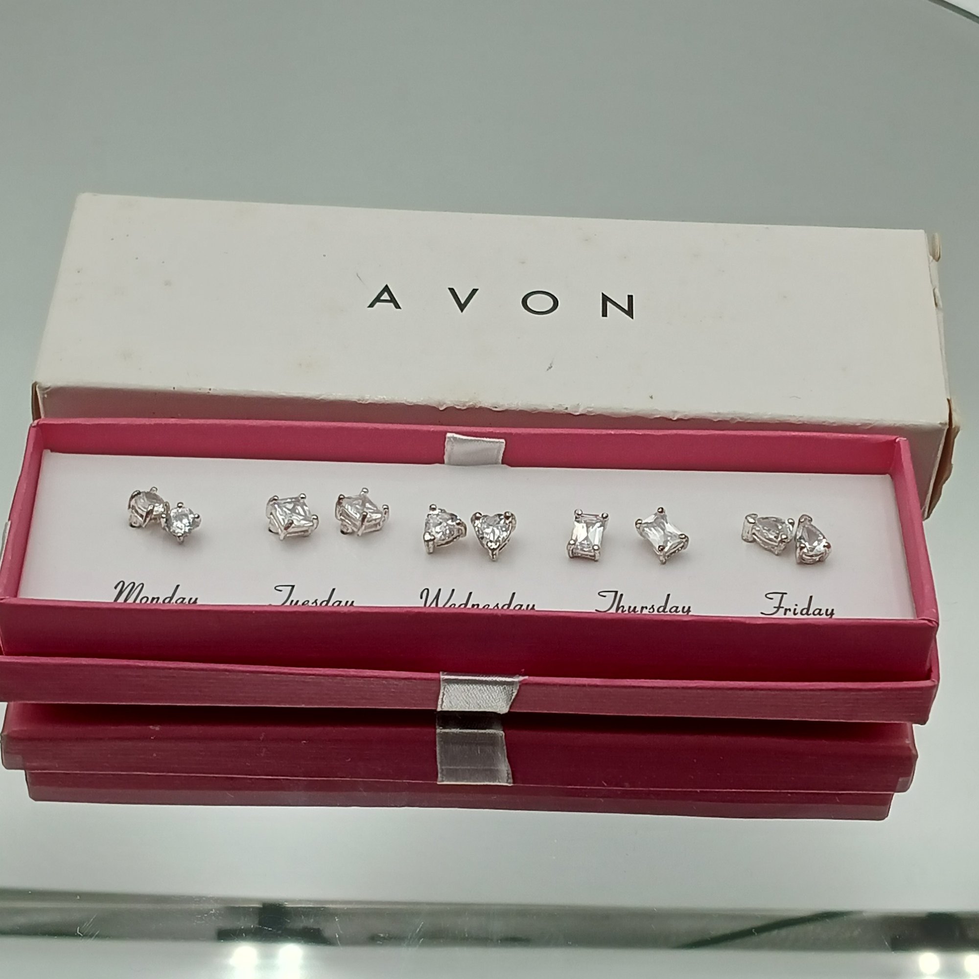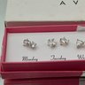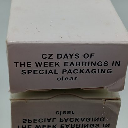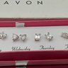 This vintage 2007 Avon jewelry set includes five pairs of clear cubic zirconia stud earrings in various shapes, specifically designed to be worn from Monday through Friday.