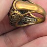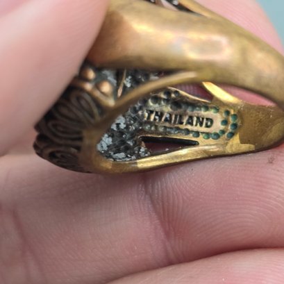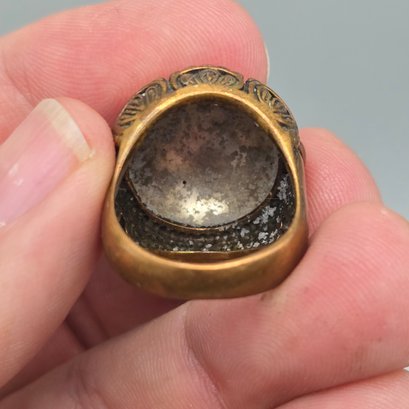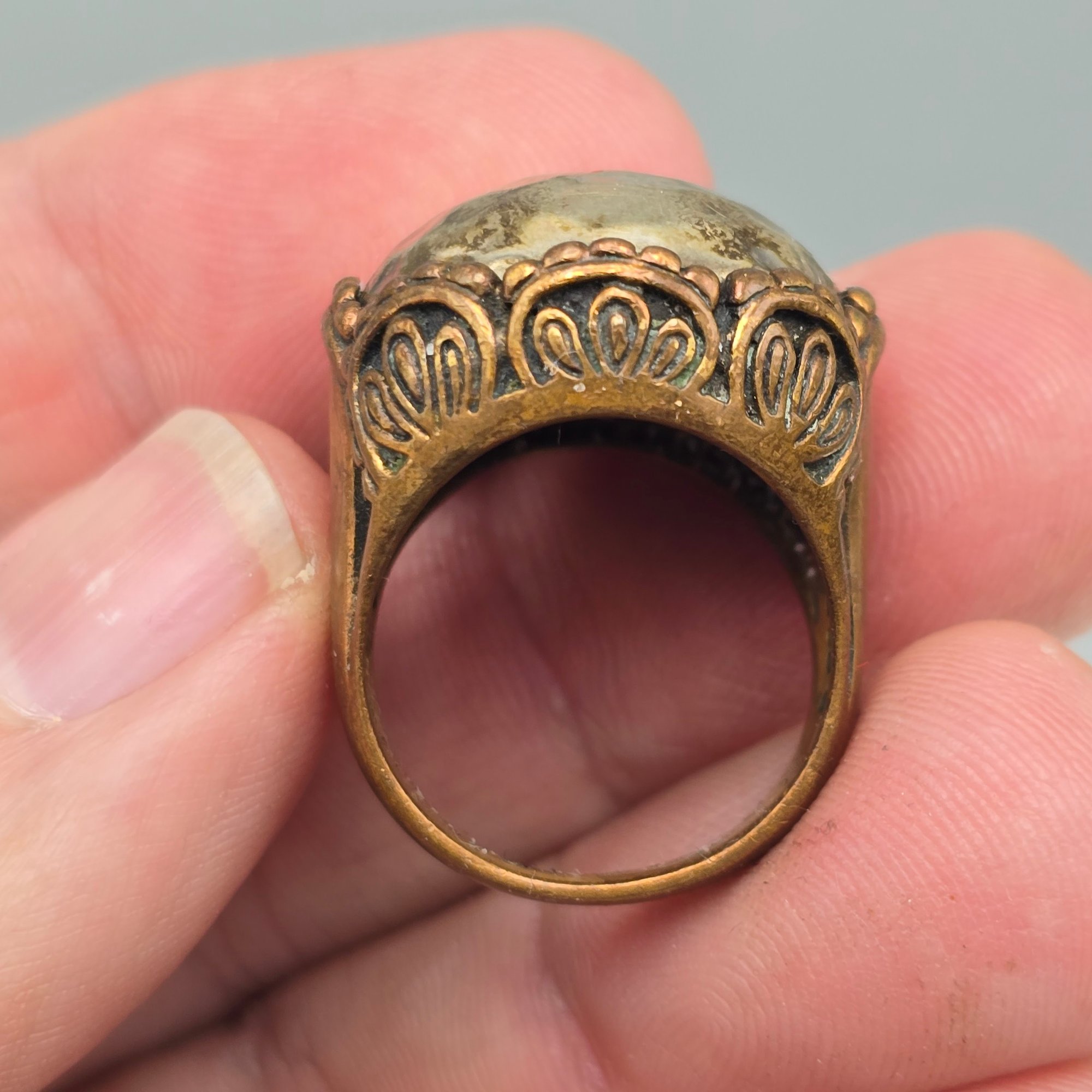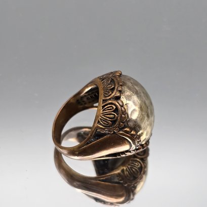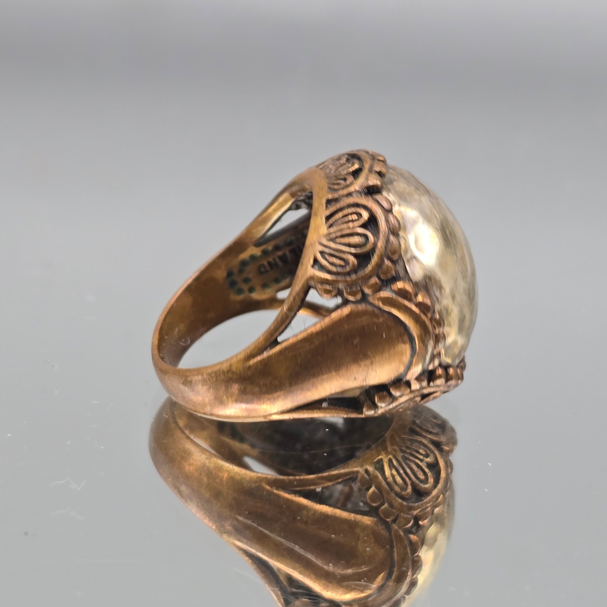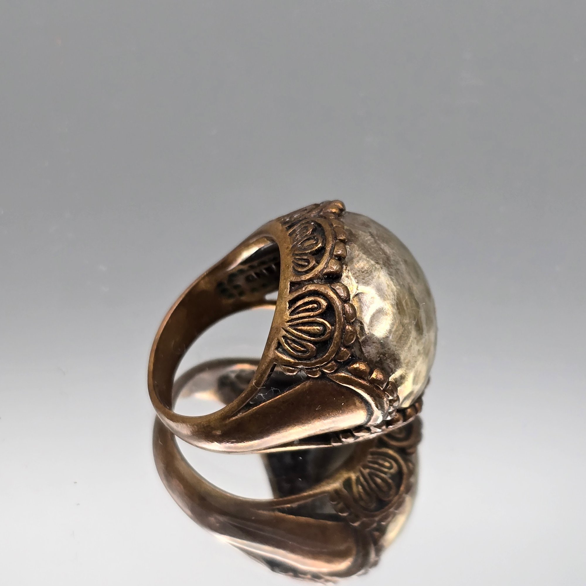 This vintage-style ring by Barse is crafted from 925 sterling silver with a bronze-tone finish and features a prominent hammered metal dome set within an ornate, openwork gallery.