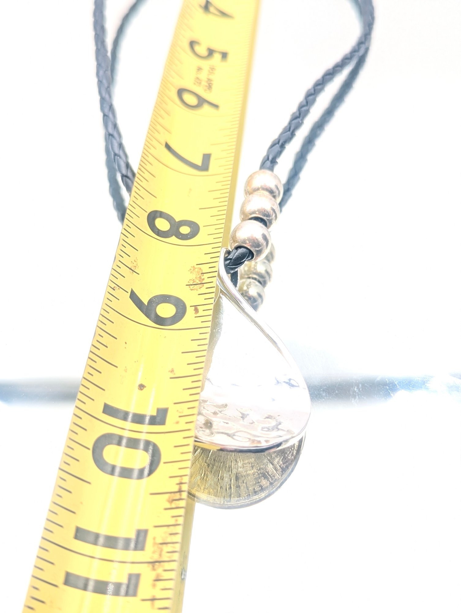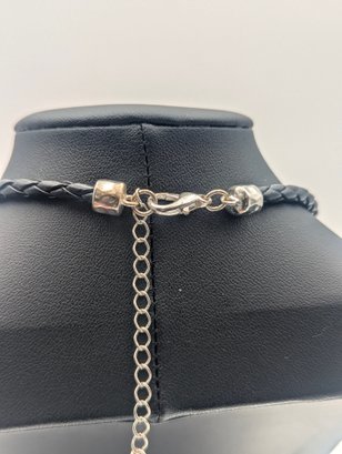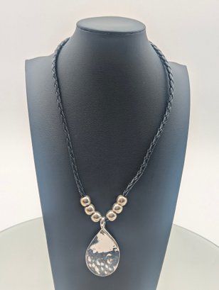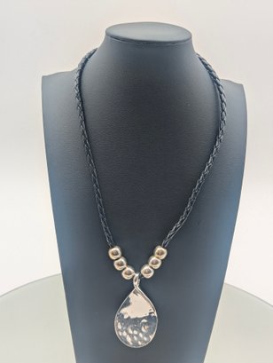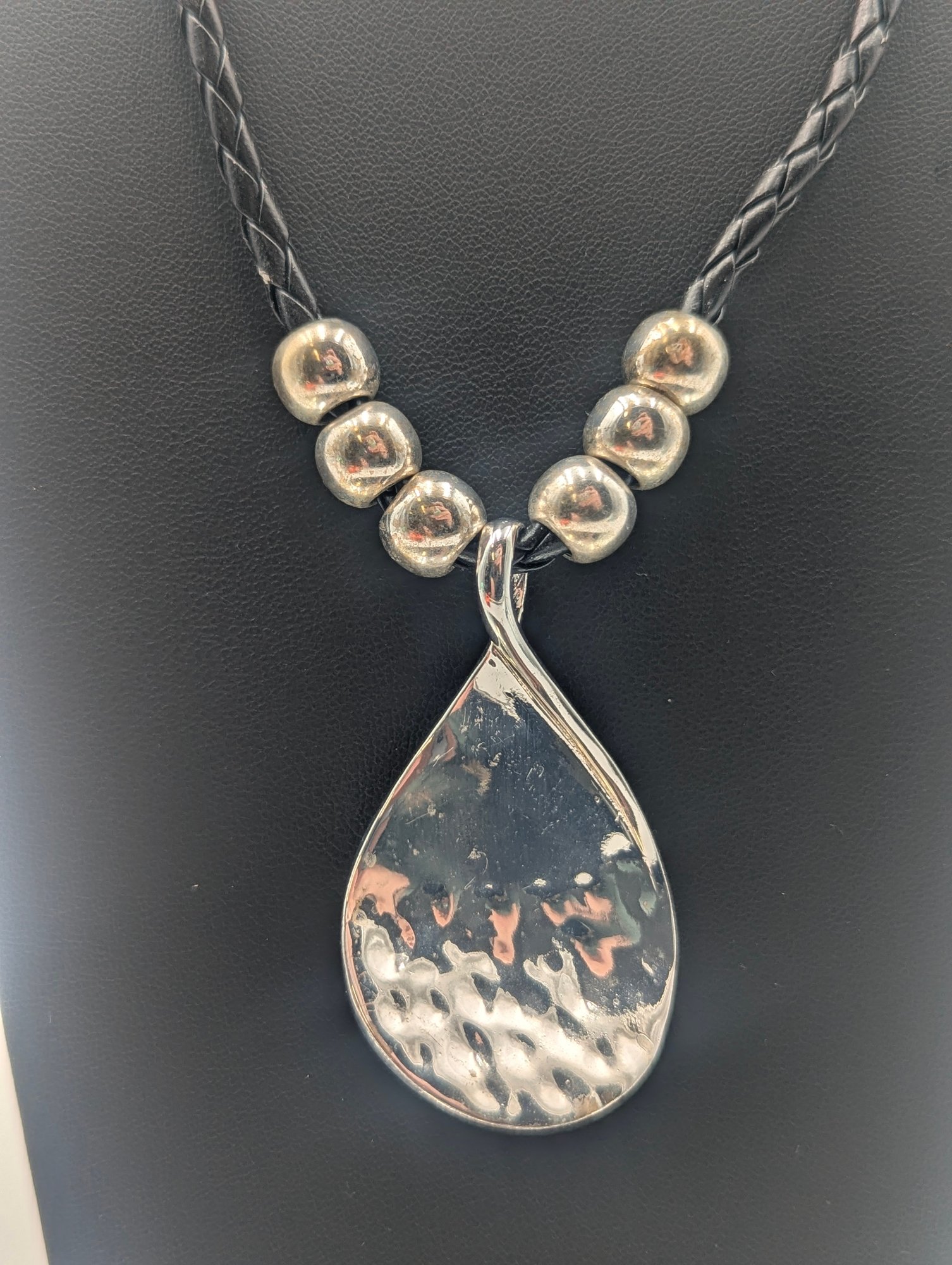 Black Braided Cord Necklace With Silver-Tone Hammered Teardrop Pendant