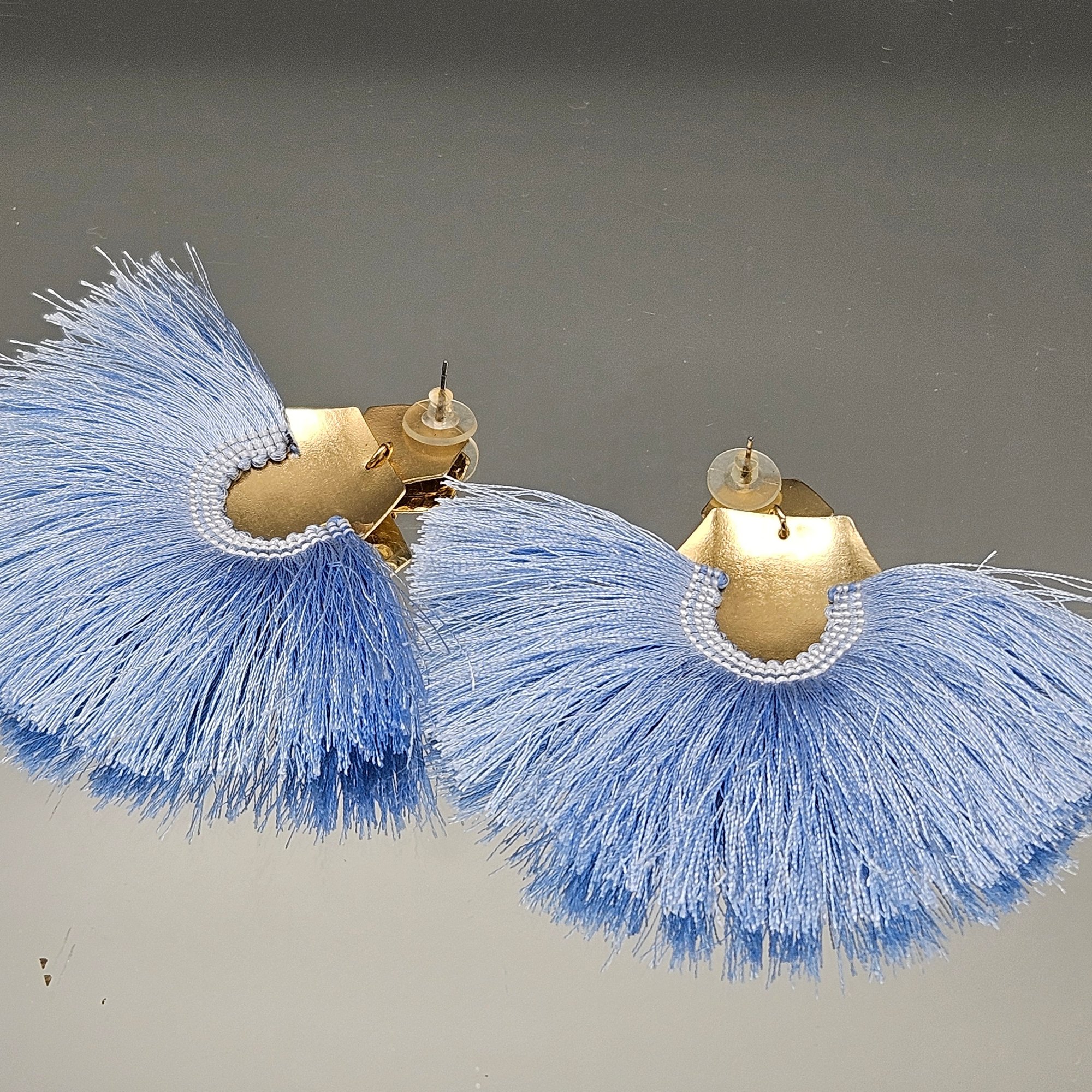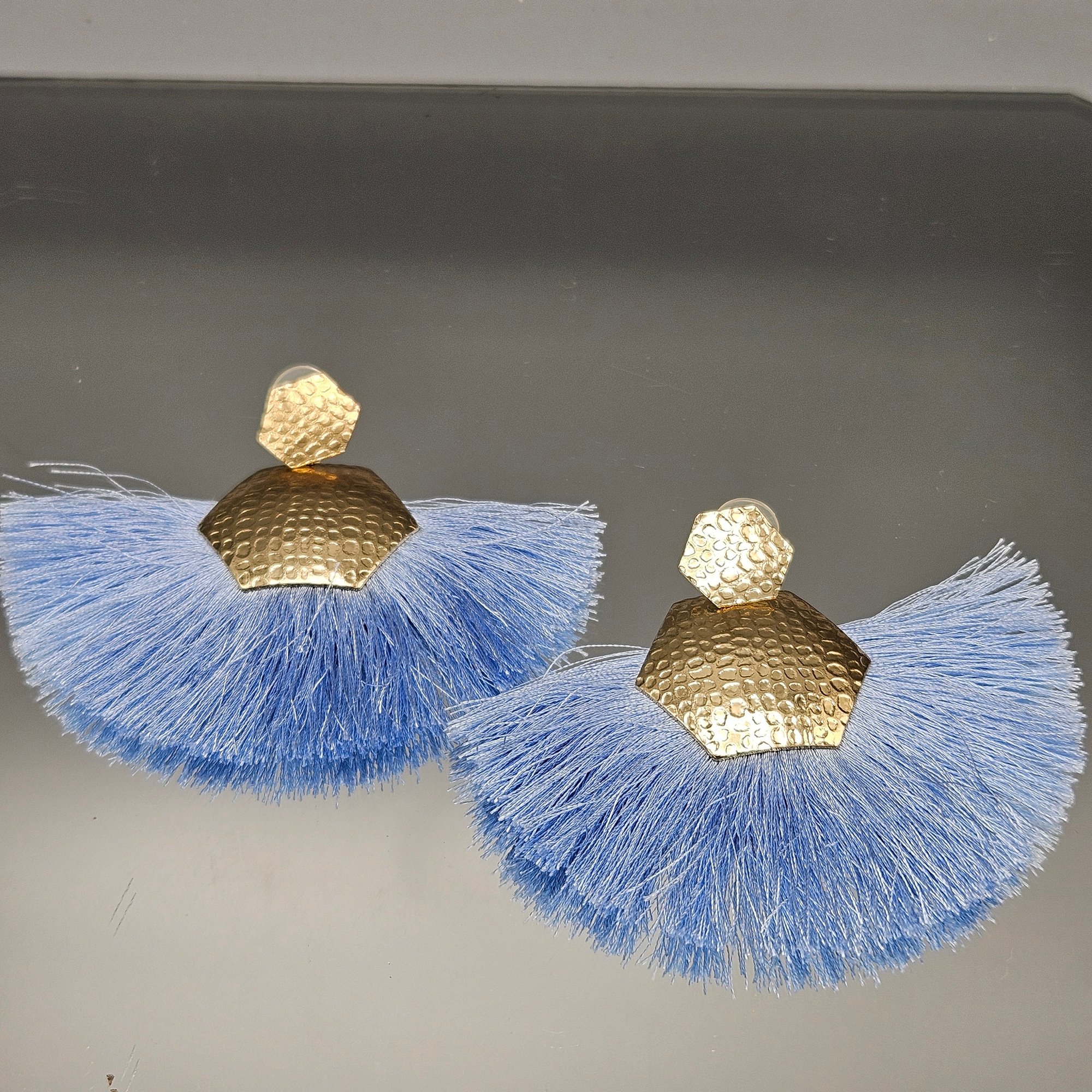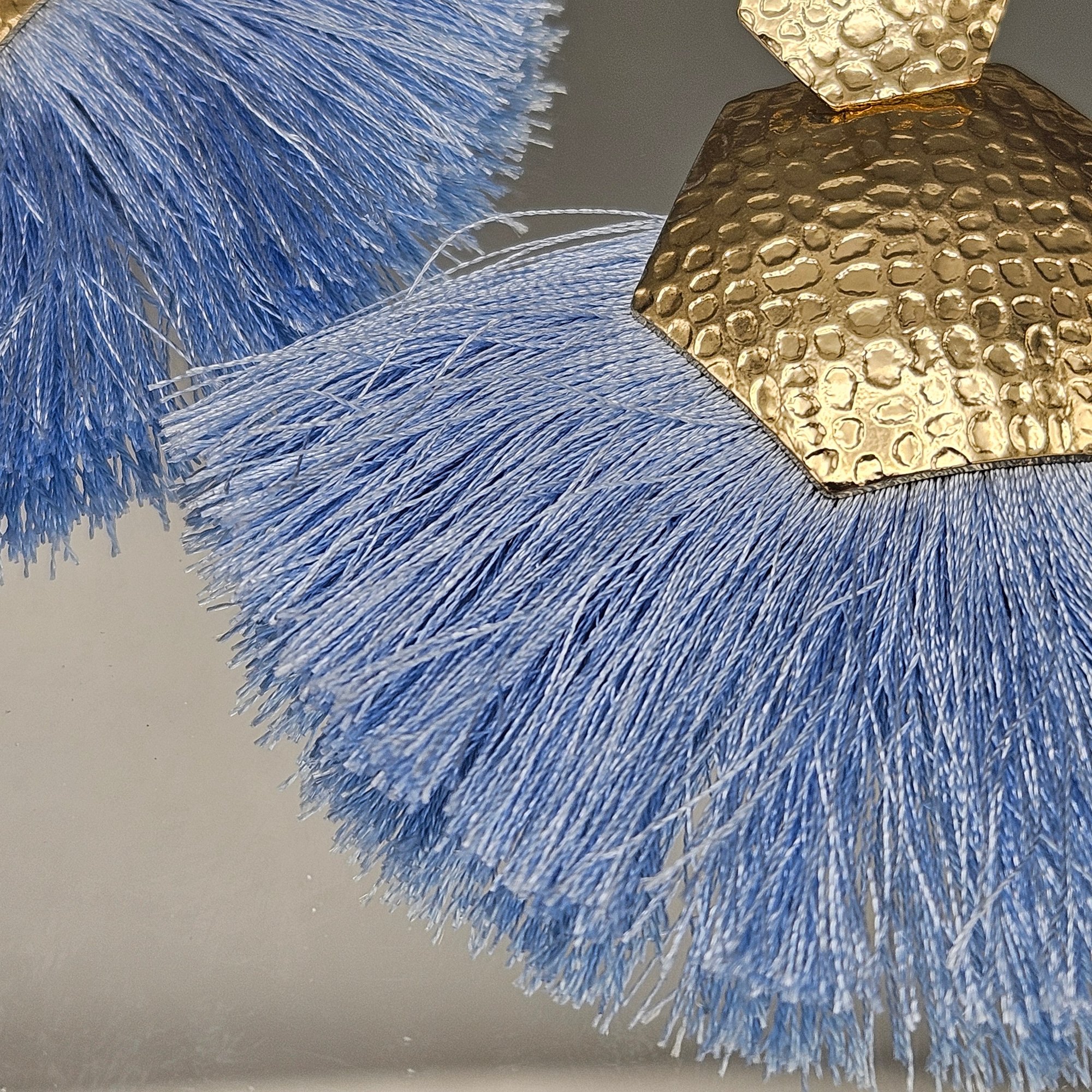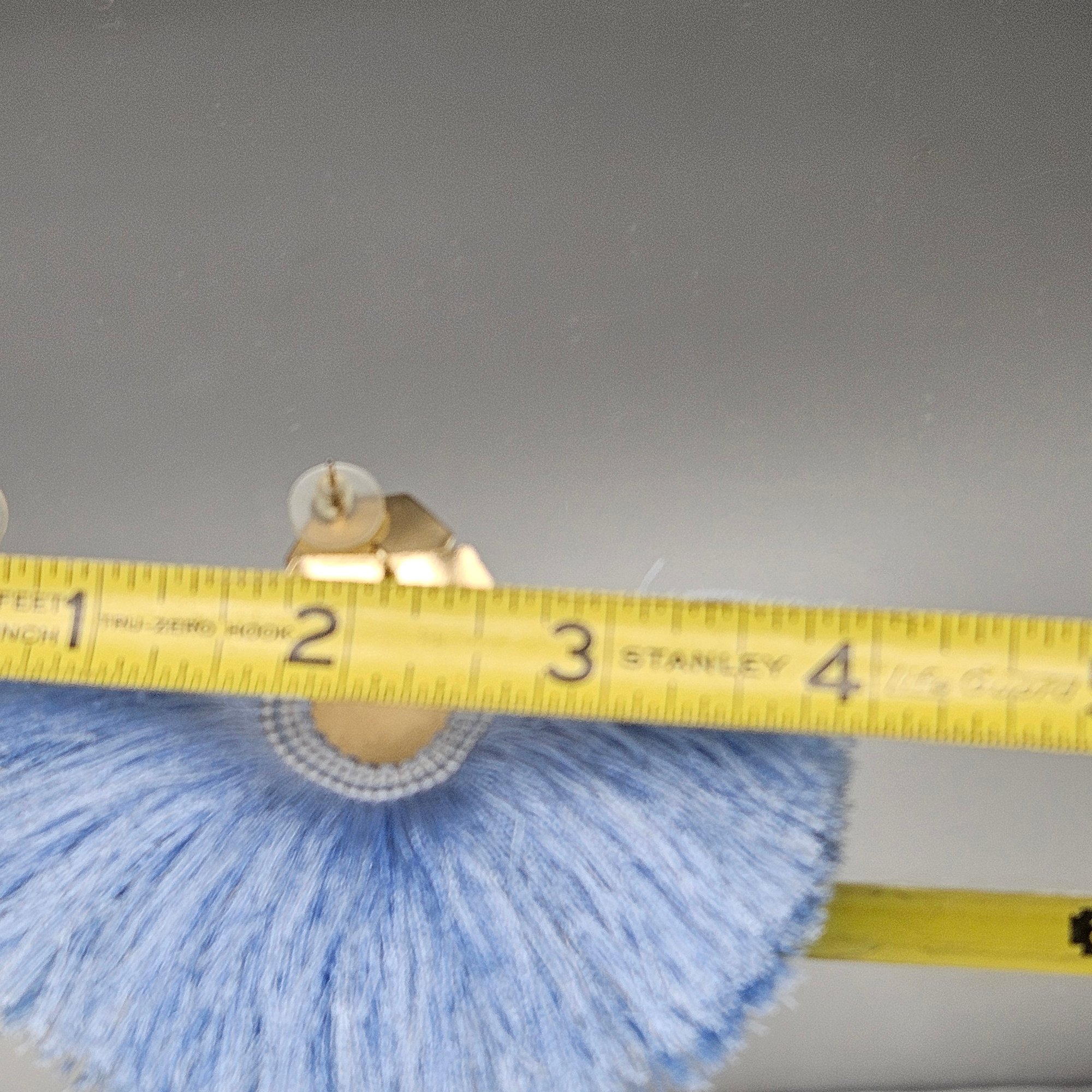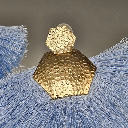 Blue Tassel Fringe Earrings Gold Tone Geometric Studs