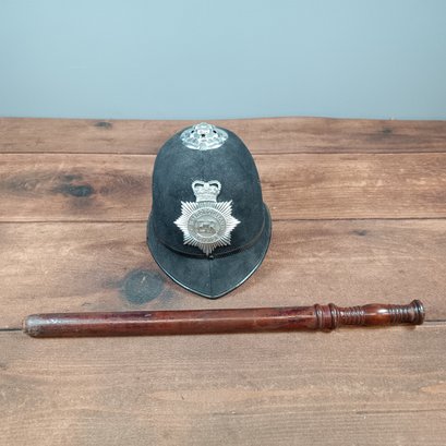 authenitic metopolitiain police hlmet with wooden club, 20in tall