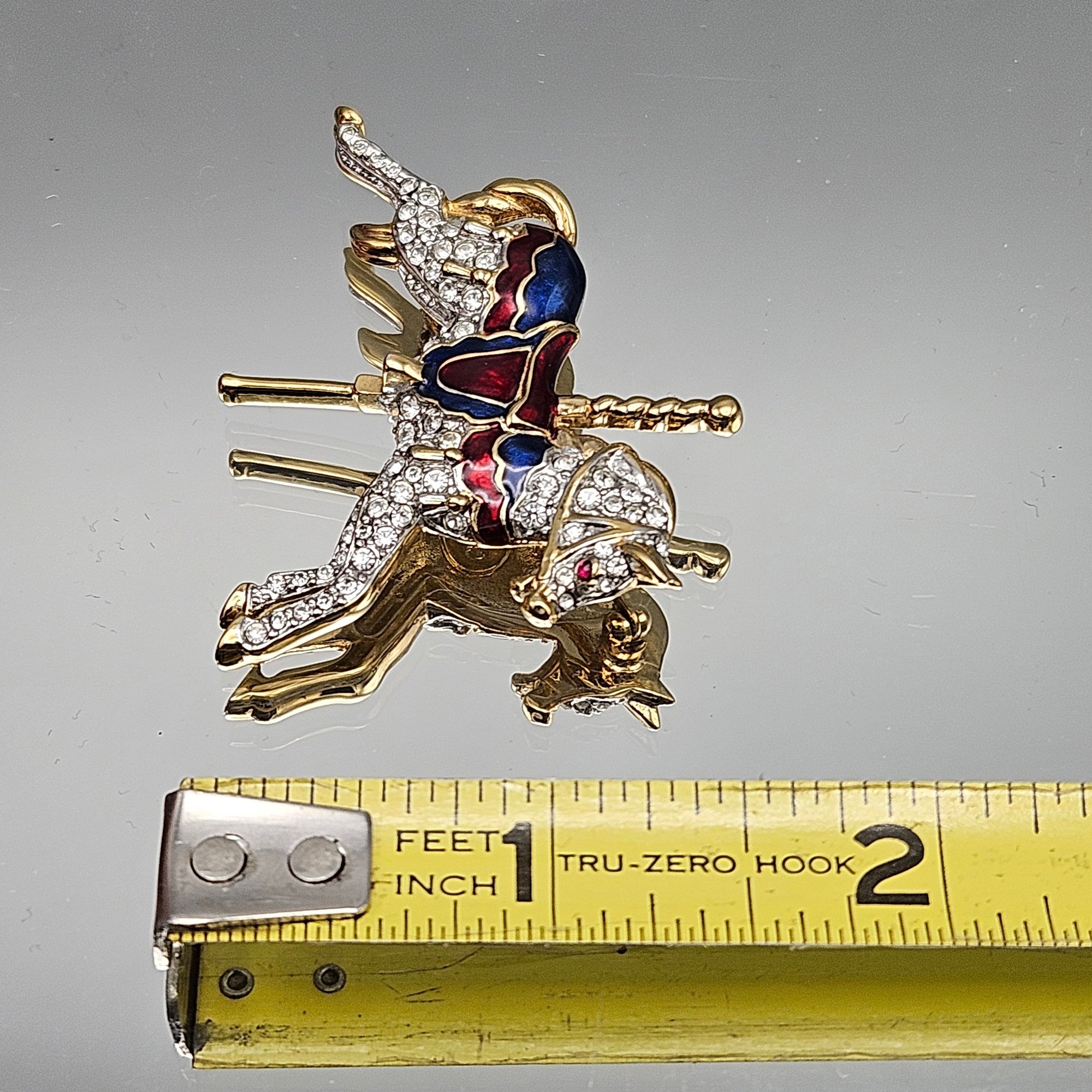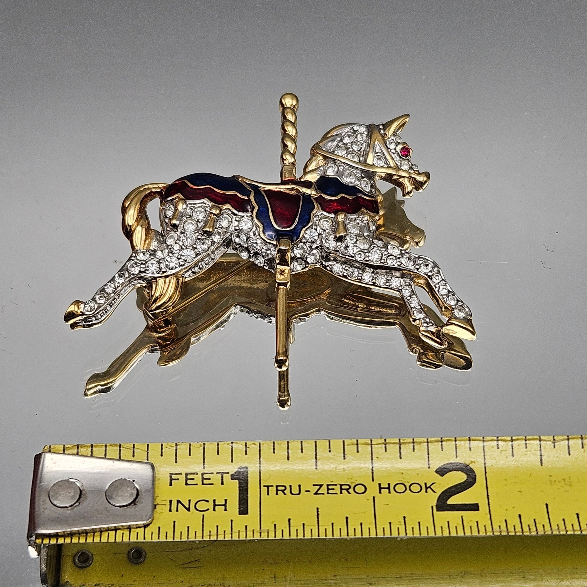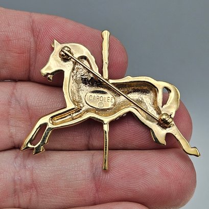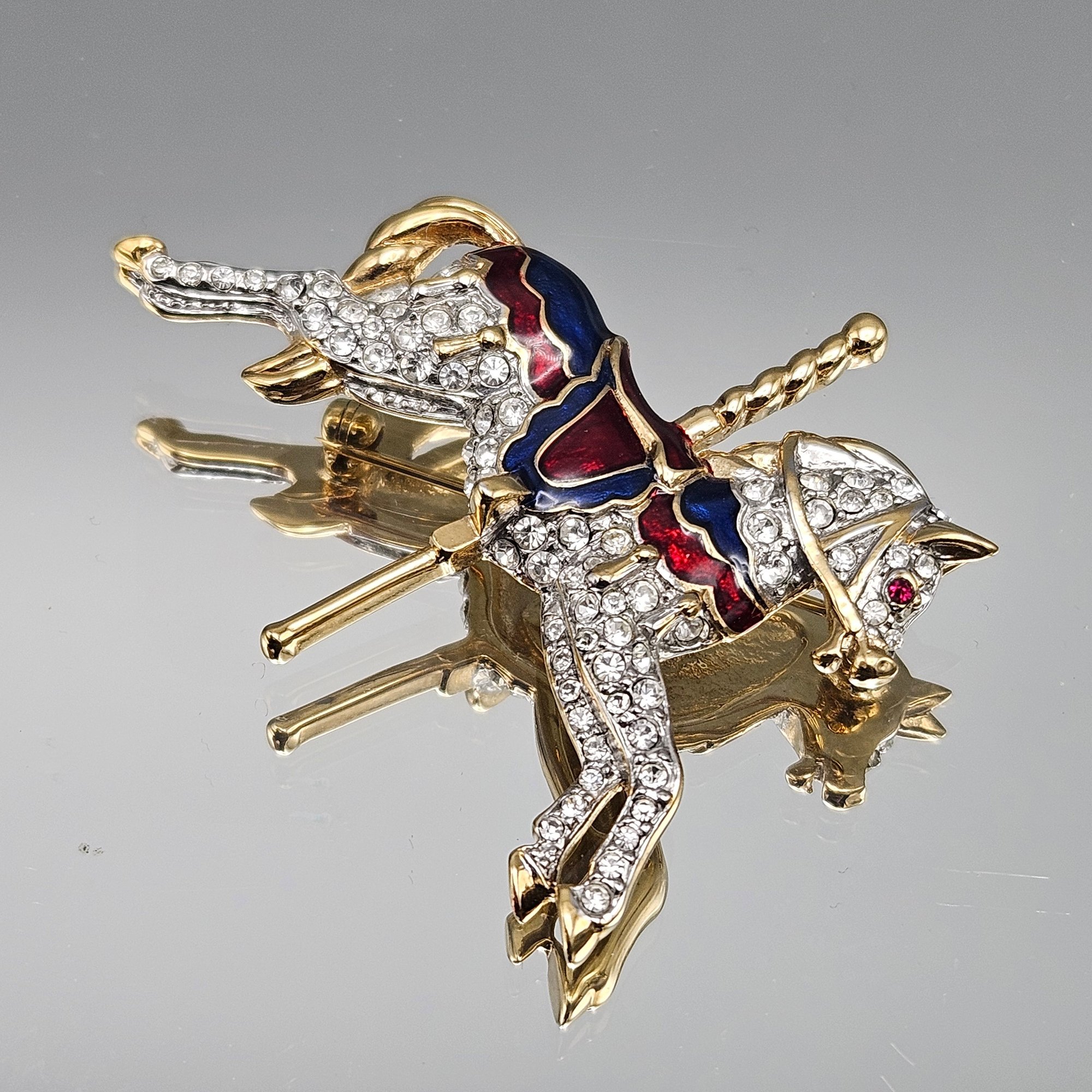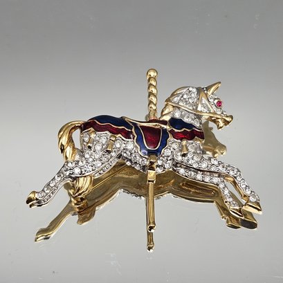 Vintage Carolee carousel horse brooch featuring sparkling rhinestones with red and blue enamel accents in a gold-tone finish. Beautifully detailed with a secure pin back—an eye-catching statement piece for collectors or horse lovers.