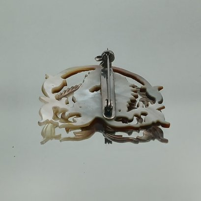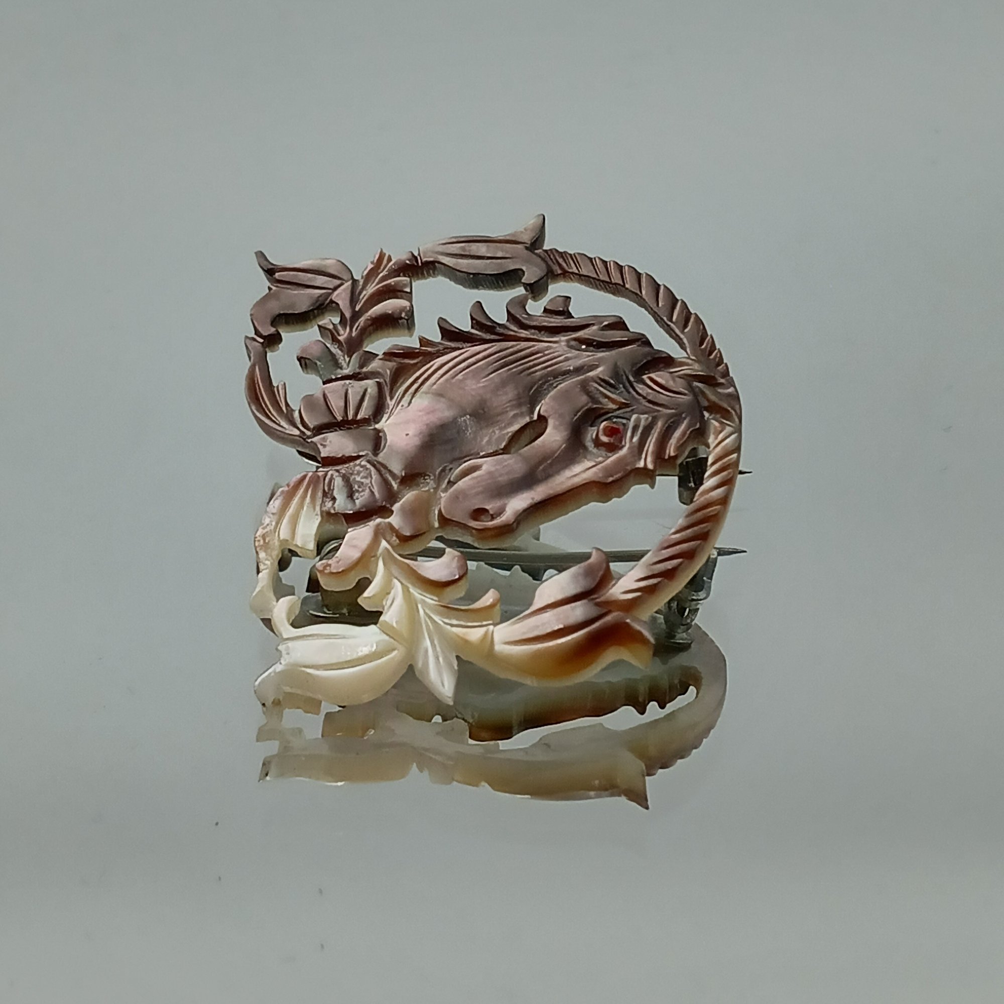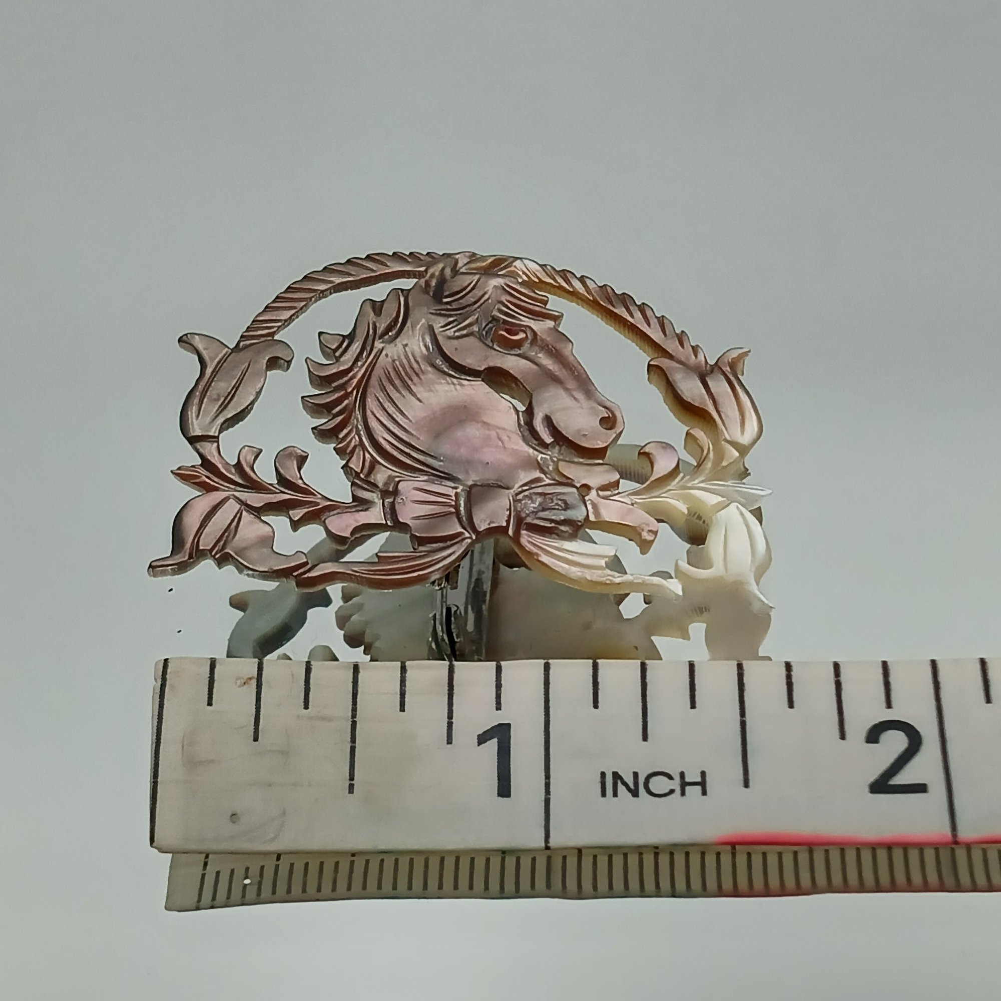 This vintage accessory features an intricately carved mother-of-pearl or shell horse head within a decorative foliate border, measuring approximately 1.5 inches in width.