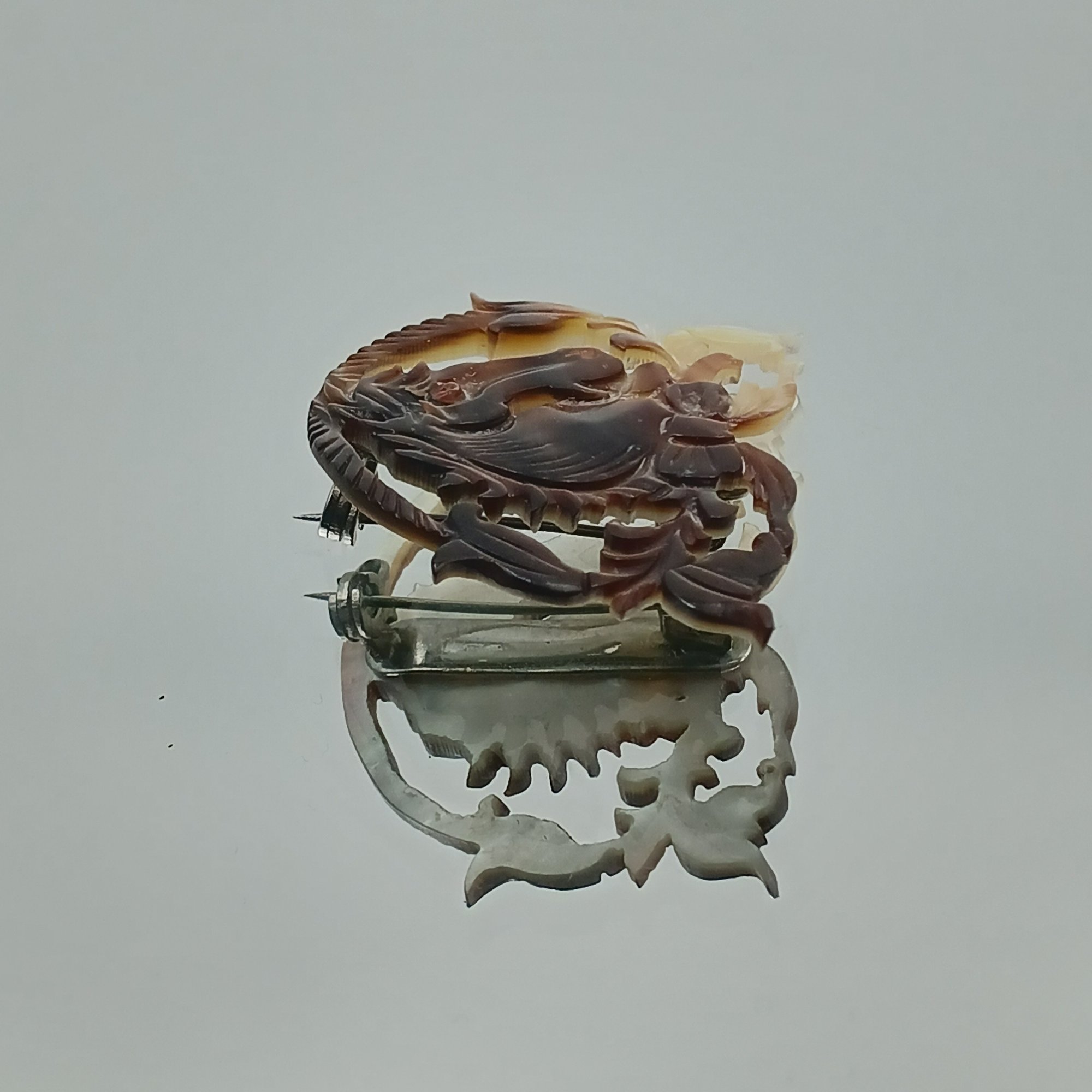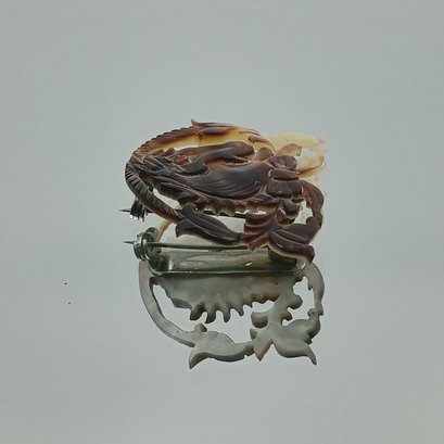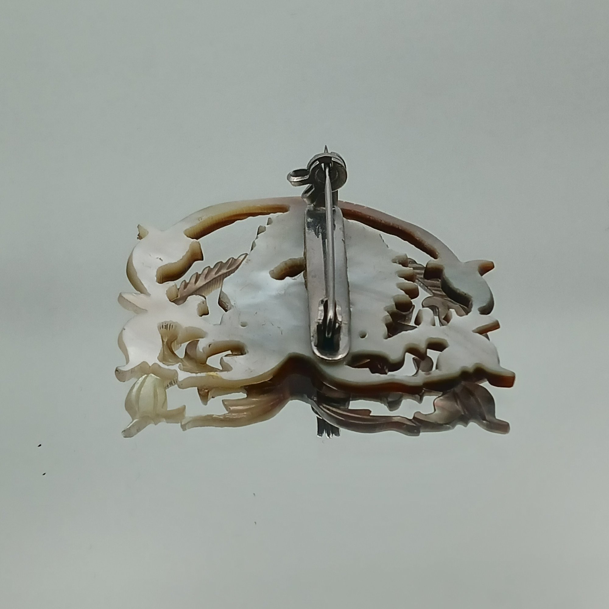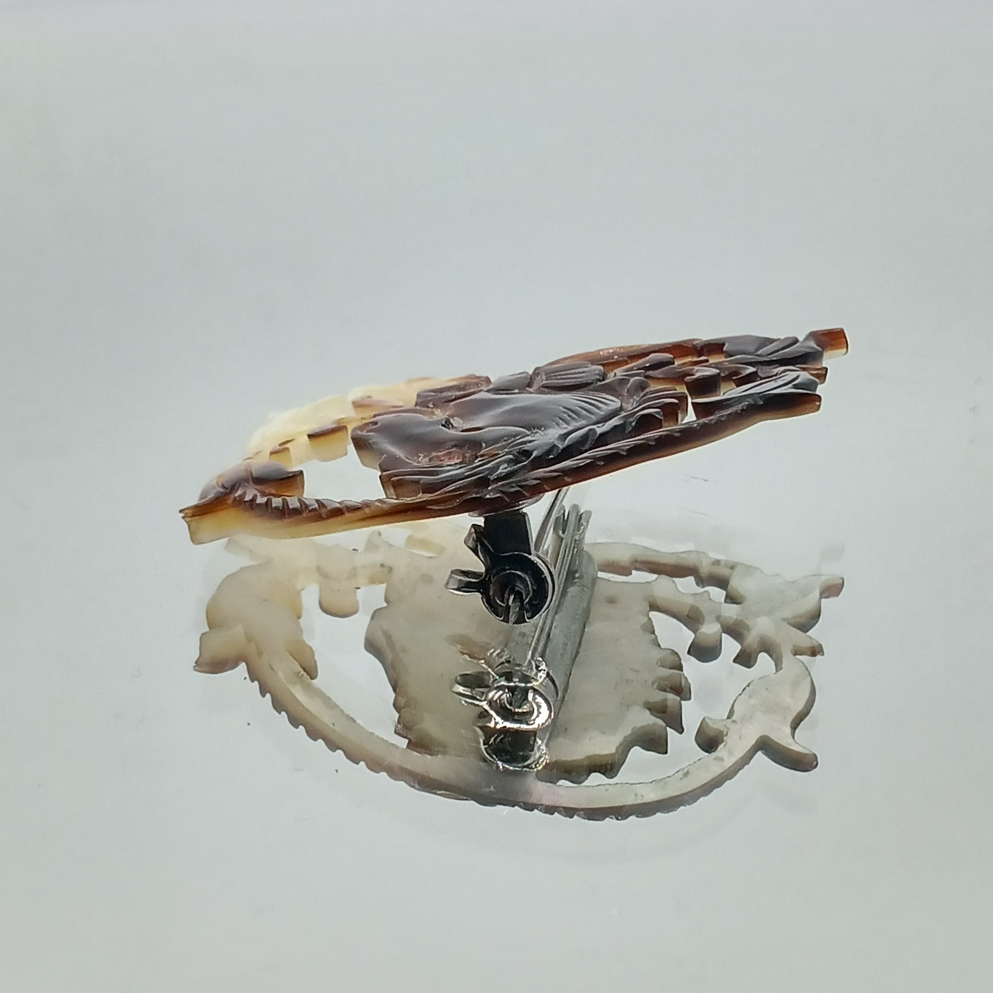 This vintage accessory features an intricately carved mother-of-pearl or shell horse head within a decorative foliate border, measuring approximately 1.5 inches in width.