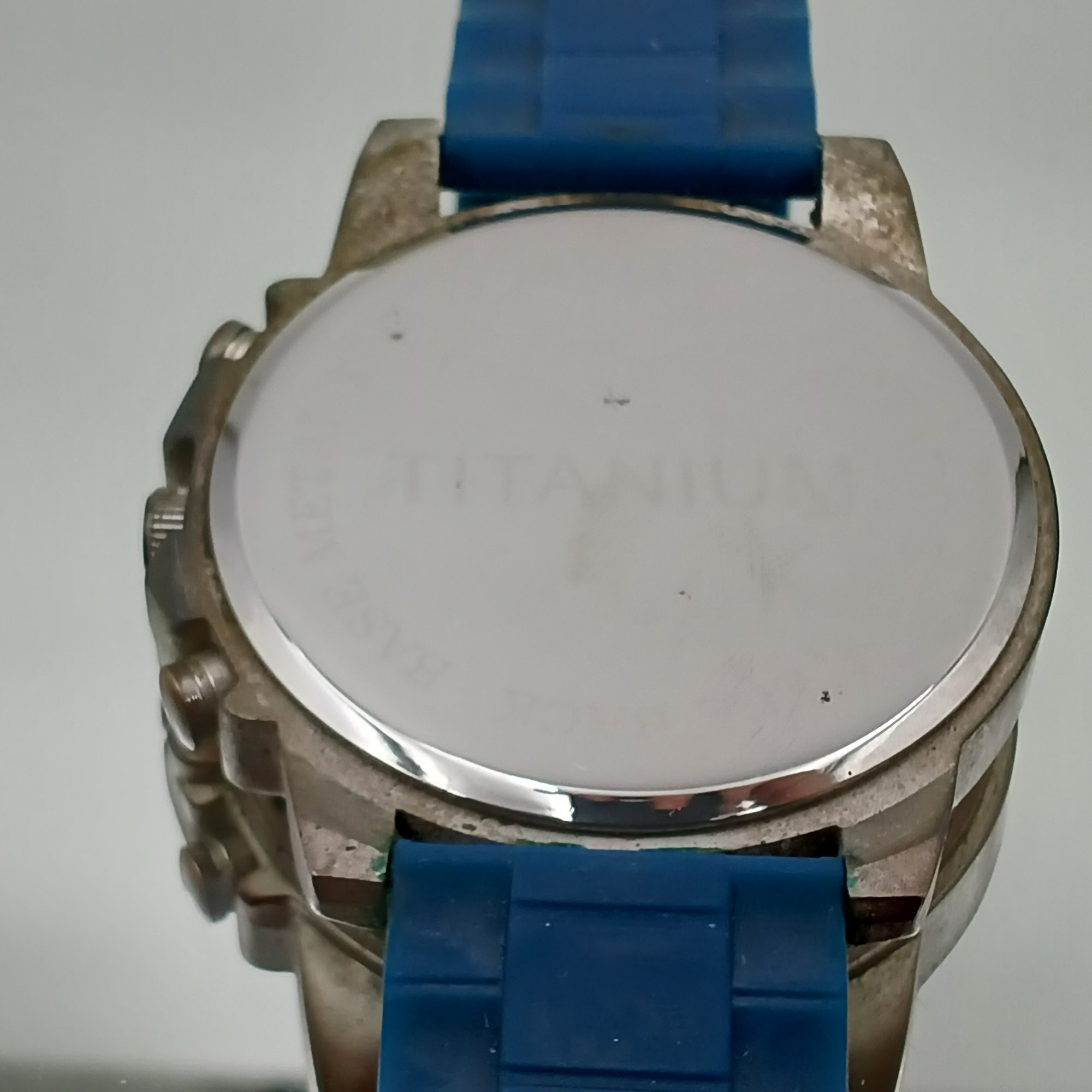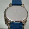 This modern Citizen timepiece features a lightweight, silver-tone Super Titanium case and a textured blue dial with a three-register chronograph layout and date window, all secured by a durable blue silicone strap.