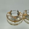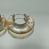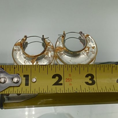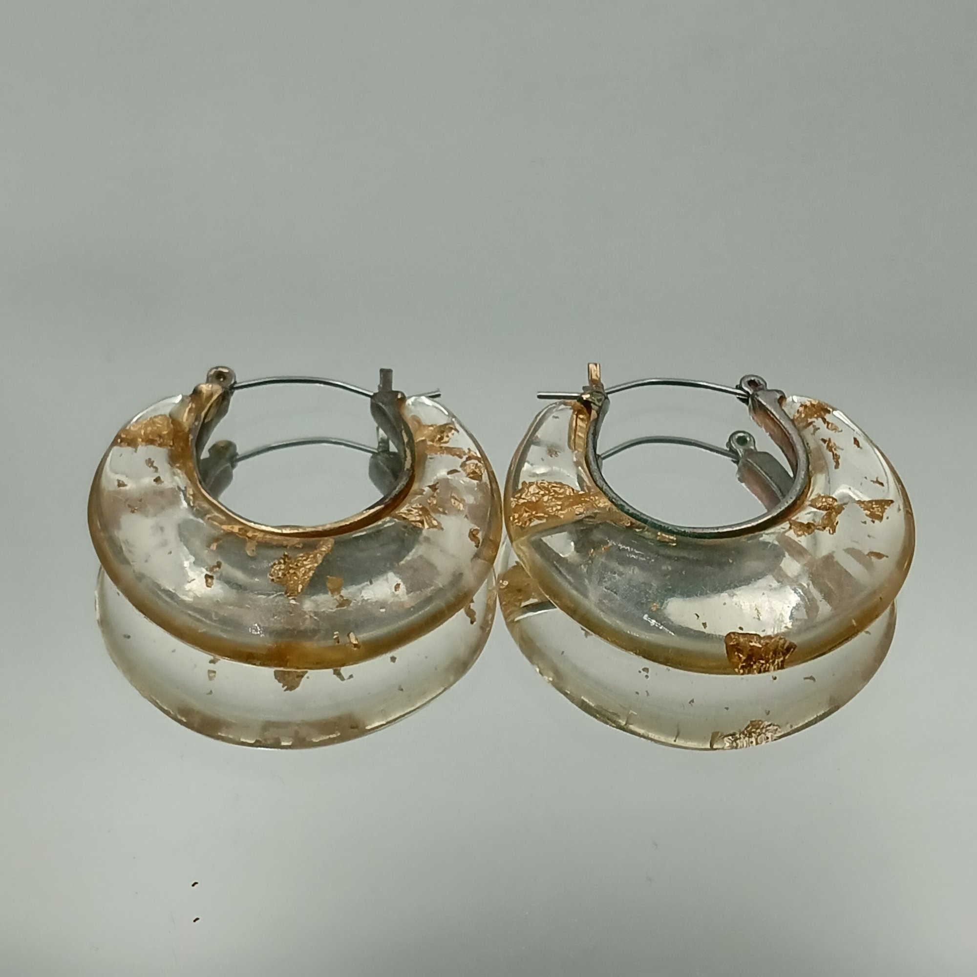 A pair of chunky, clear resin hoop earrings featuring embedded gold leaf flakes and a silver-toned saddle-back closure.