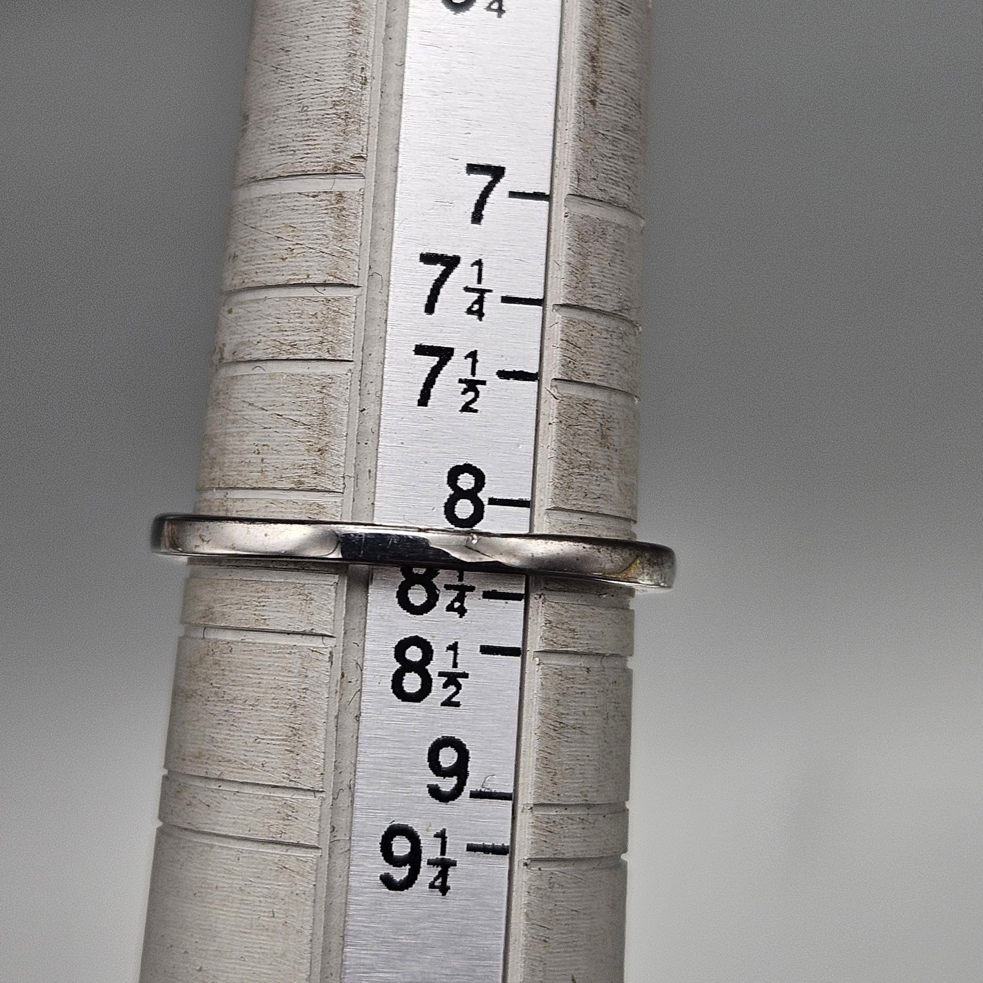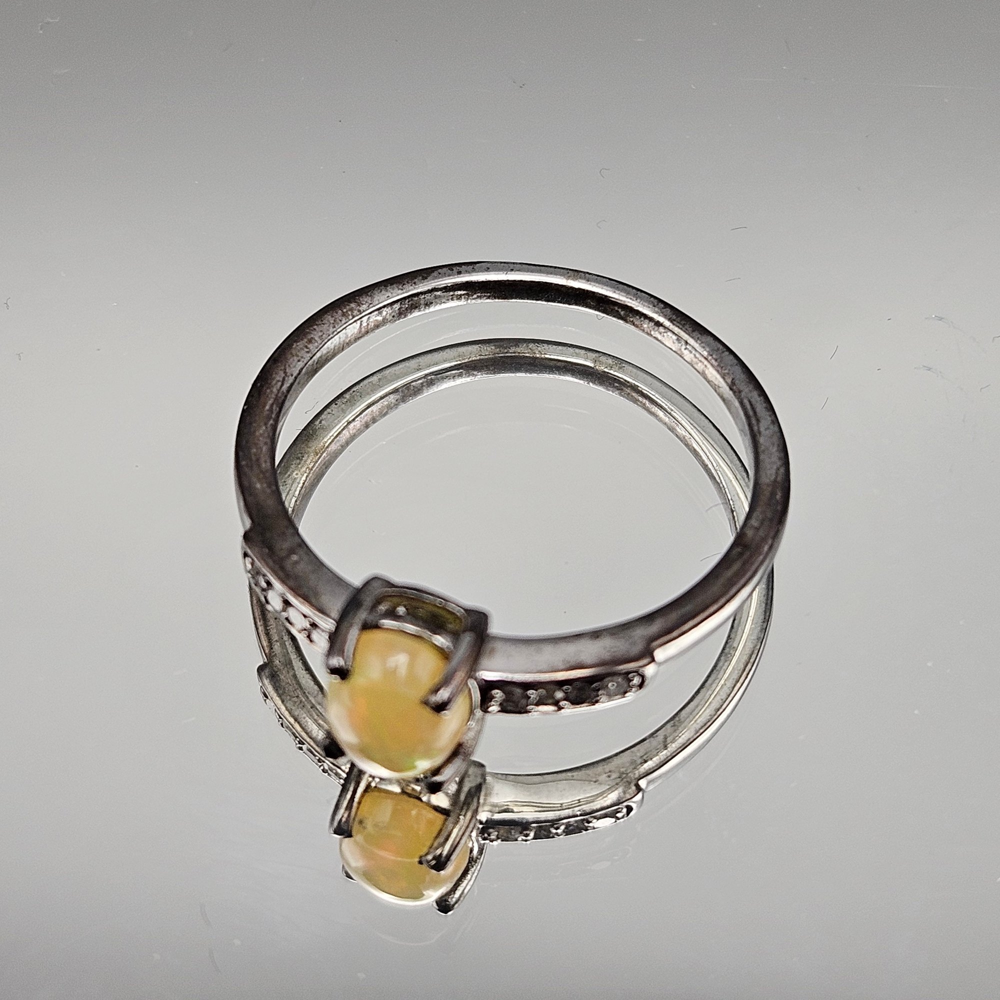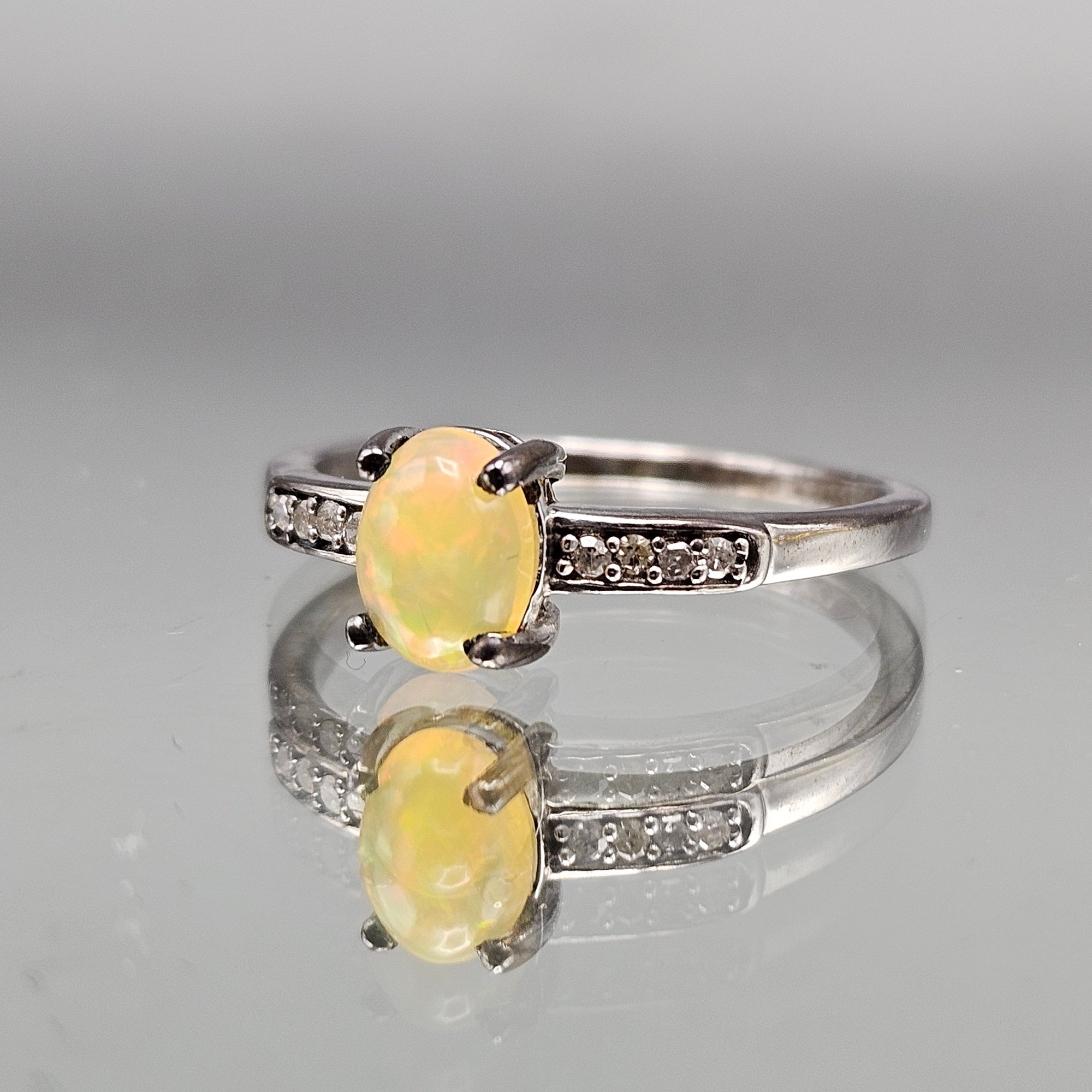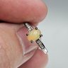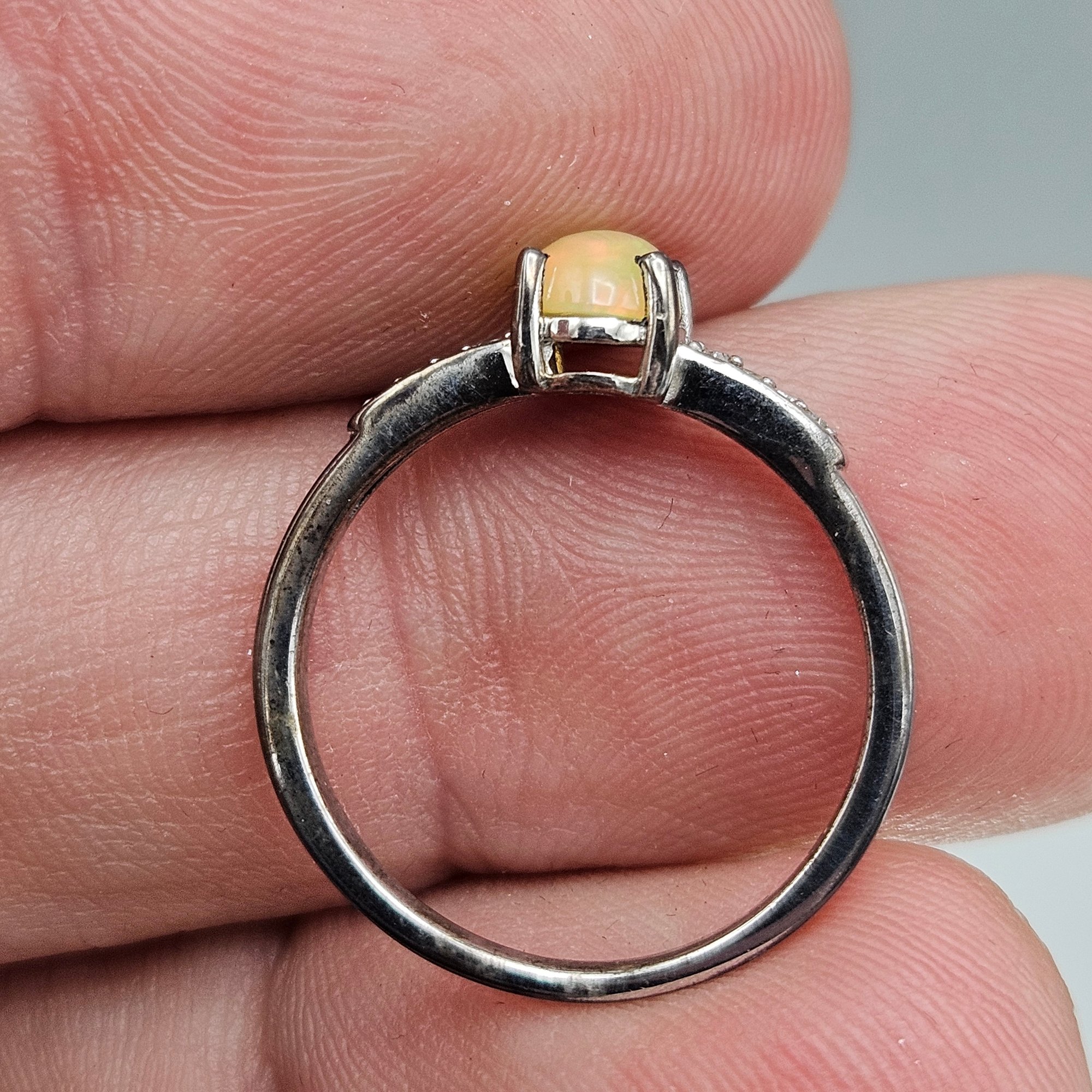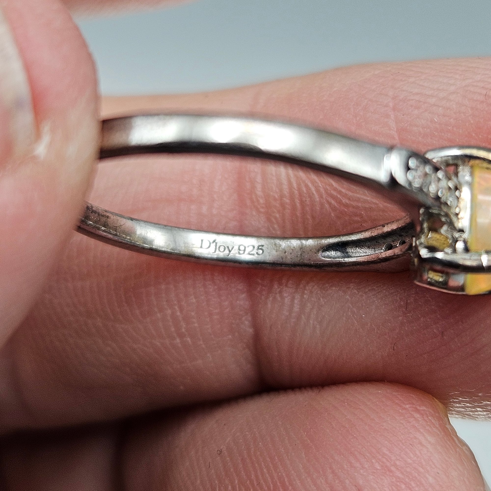 This beautiful ring by D'Joy showcases a luminous oval-cut opal cabochon secured in a four-prong setting. The sterling silver band, hallmarked with "D'Joy 925," is embellished with sparkling clear accent stones along the shoulders and is currently a size 8.
