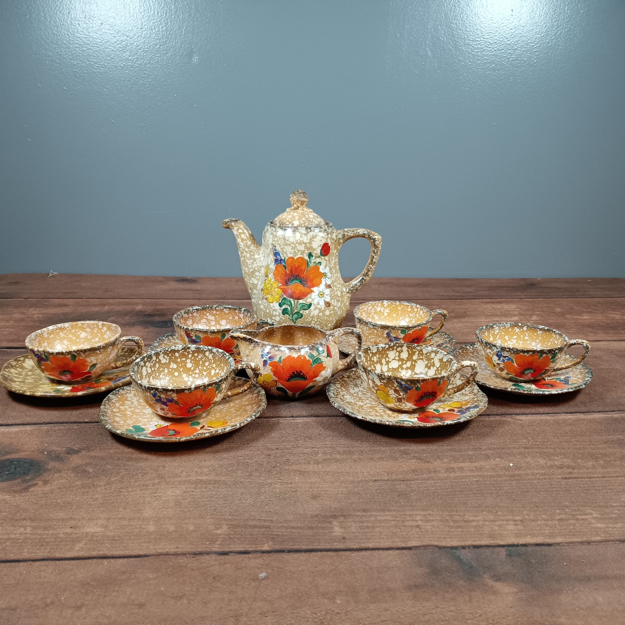Ditmar Urbach Art Deco pottery tea set with Orange flower pattern