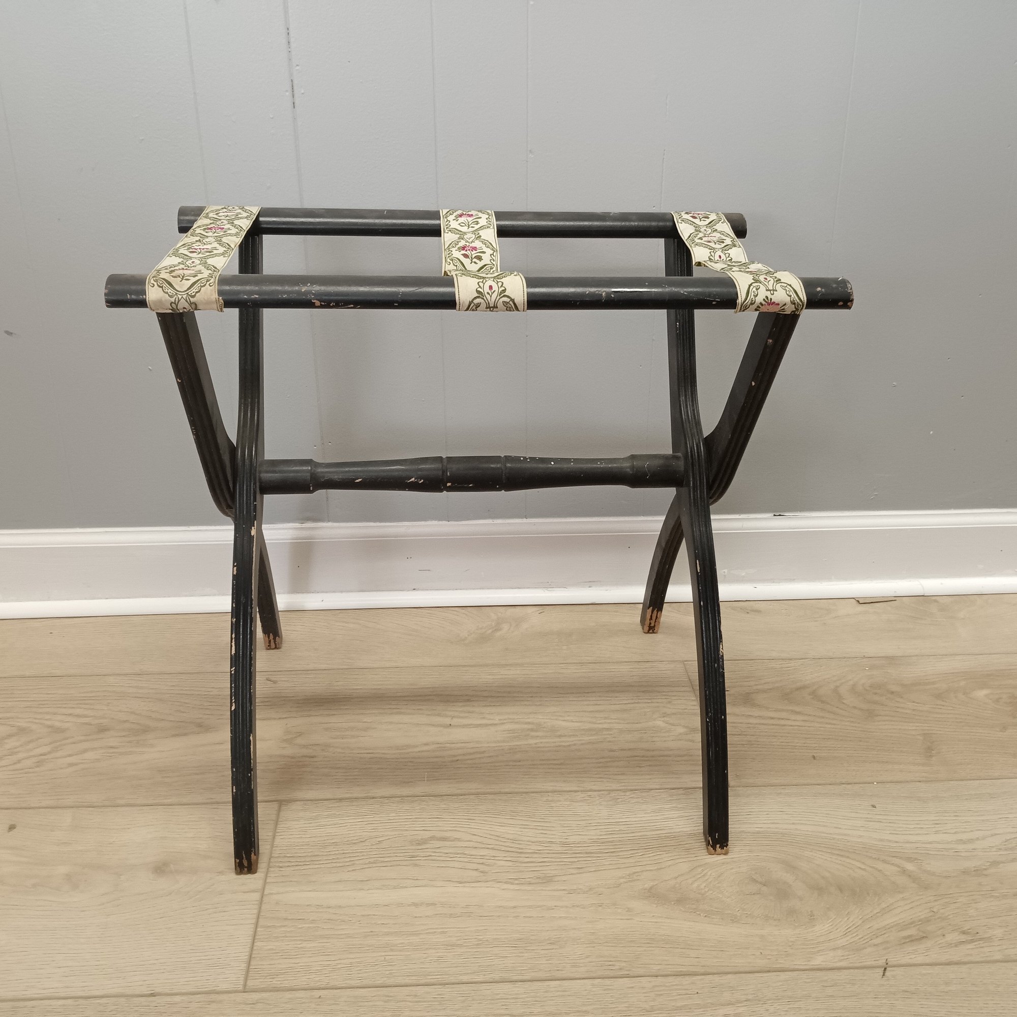 an Ebonized folding luggage rack withe embroidered straps open; 10-1/2 in tall x 22 in wide x 12-1/2 in deep