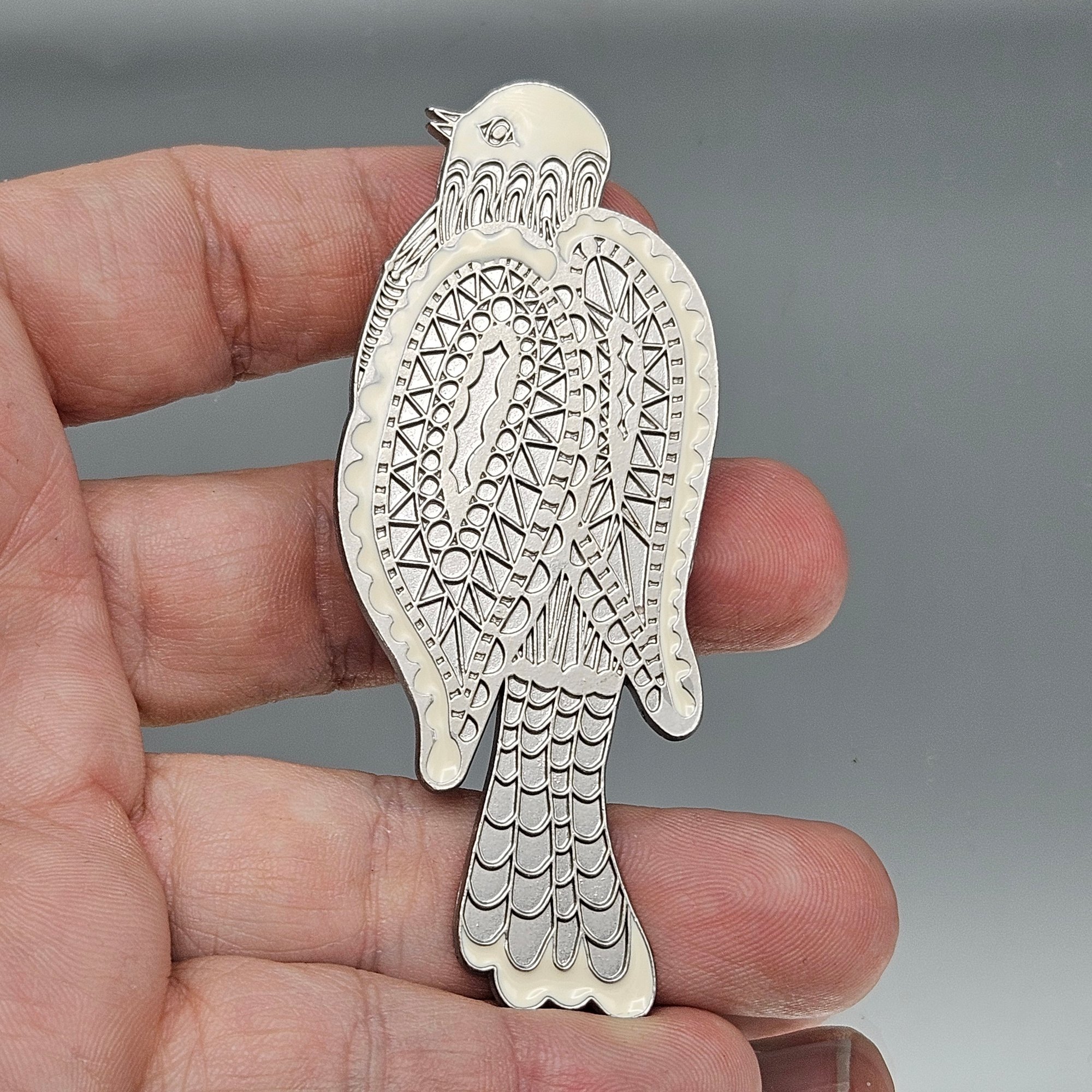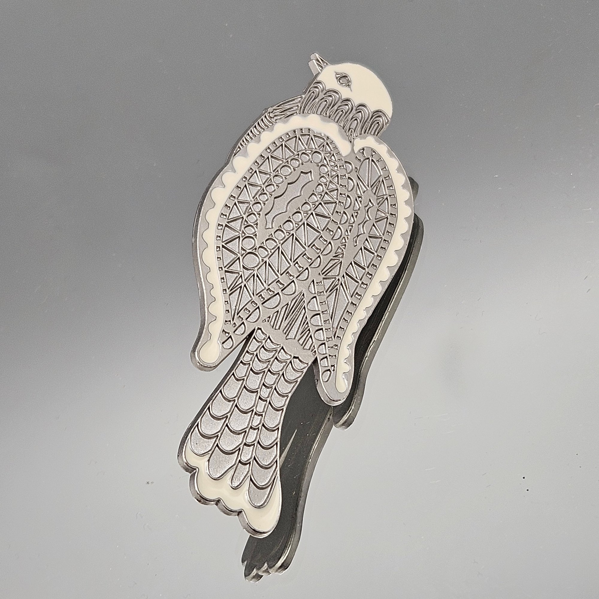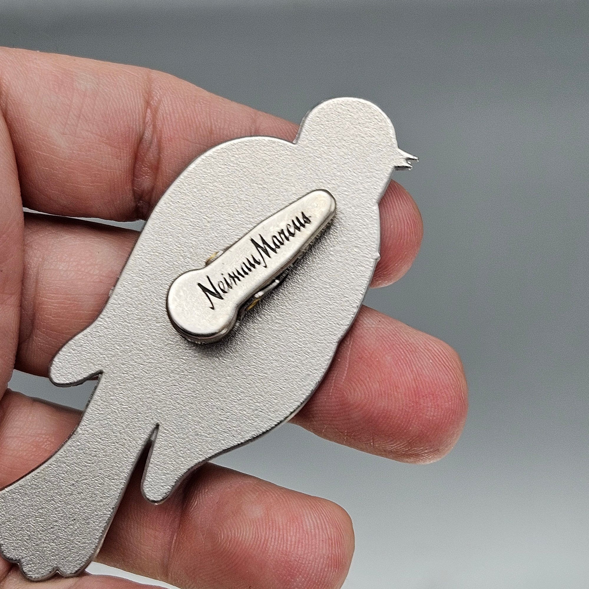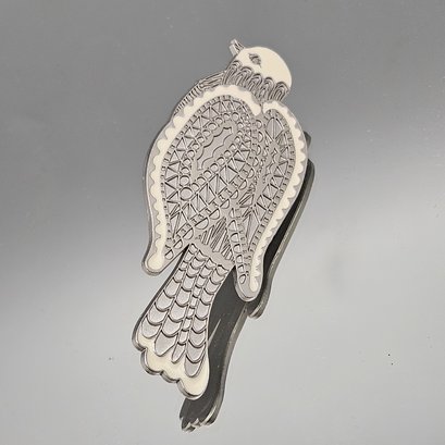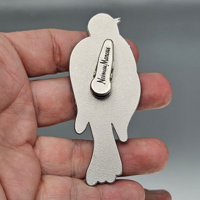 This elegant Neiman Marcus hair clip features a stylized bird crafted in silver-tone metal with ivory enamel accents. The design showcases an intricate, geometric etched pattern on the wings and body, blending vintage charm with a modern, artistic aesthetic. The back includes a secure alligator-style clip engraved with the signature Neiman Marcus logo.