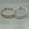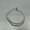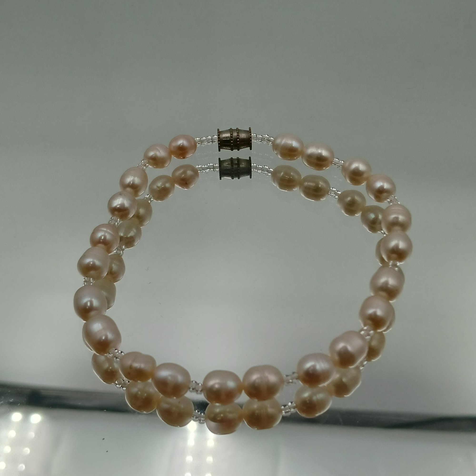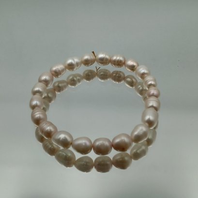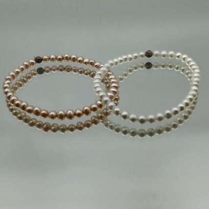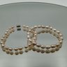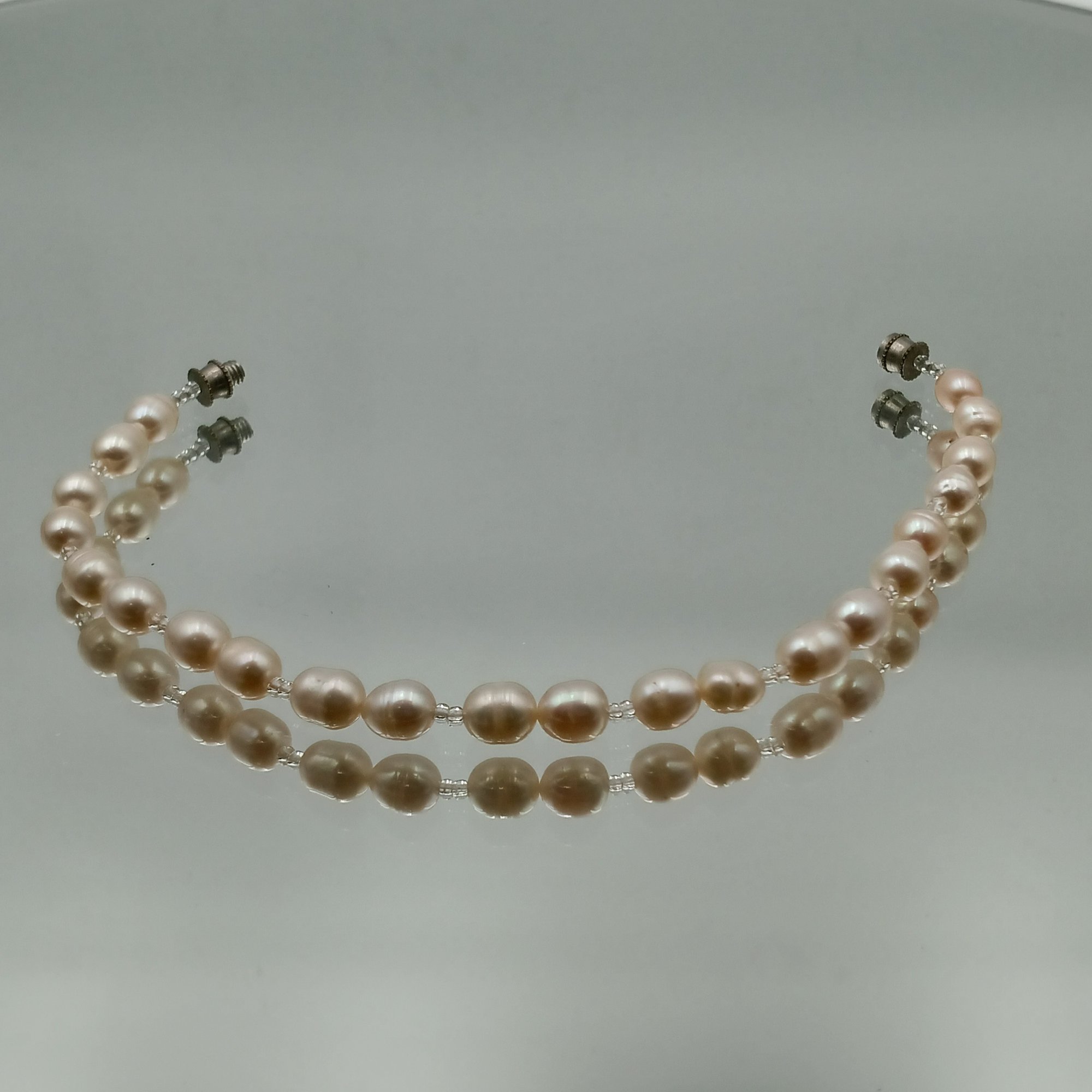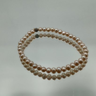 This collection features various strands of genuine cultured pearls in shades of soft white and blush pink, accented with vintage-style metallic clasps and delicate spacer beads.