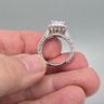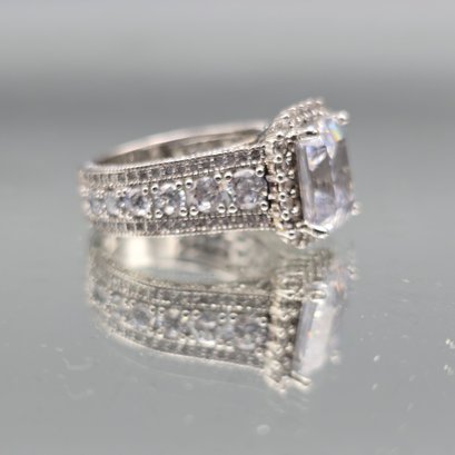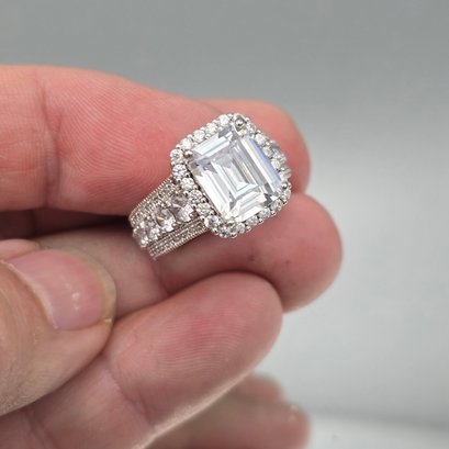 This elegant sterling silver ring features a large emerald-cut center stone surrounded by a sparkling halo and a decorative, multi-row pavé band.