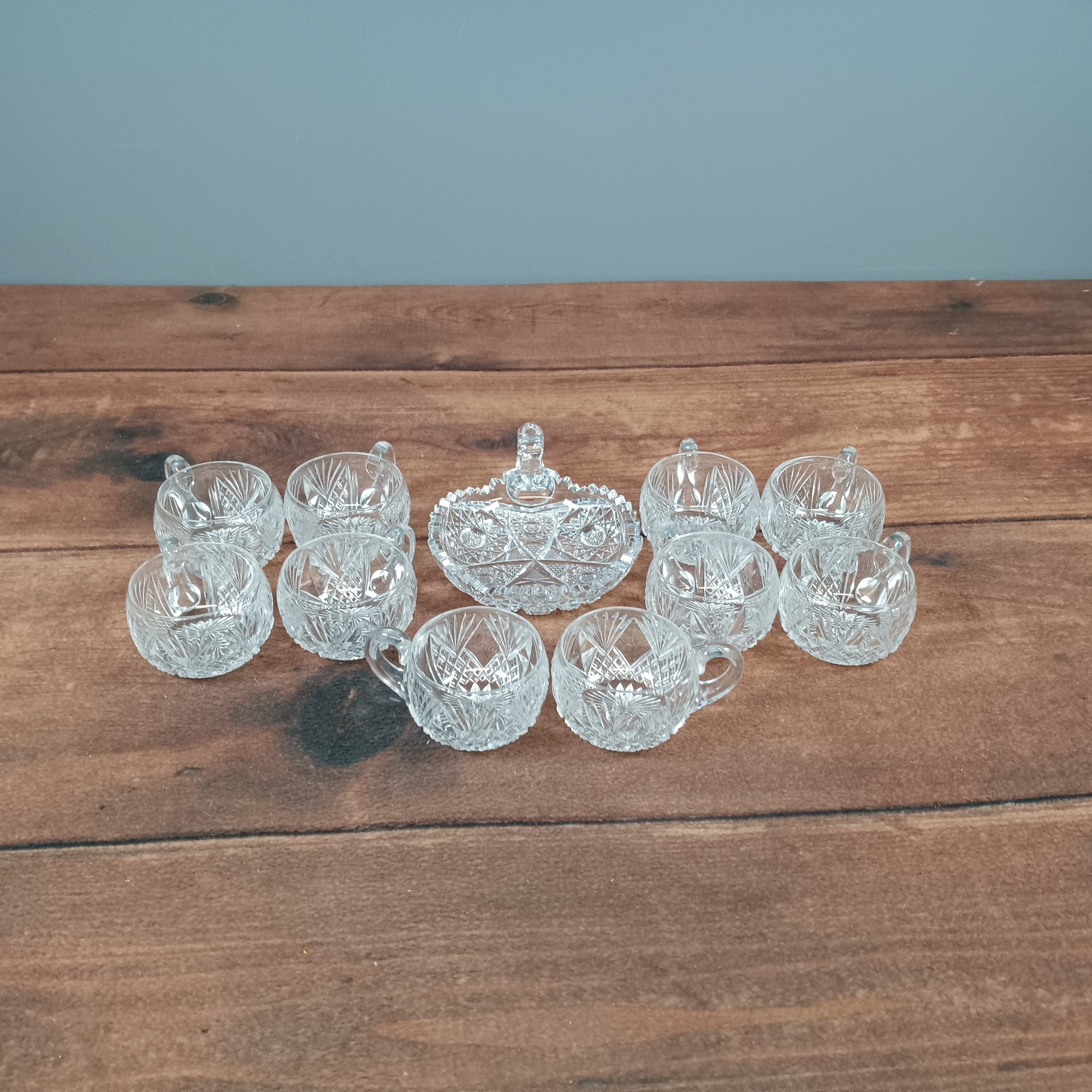 Set of 10 etched crystal Punch cups and candy dish