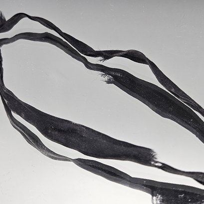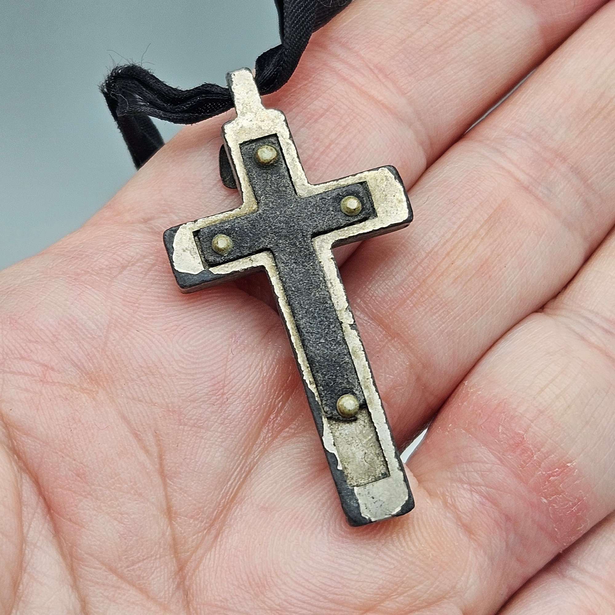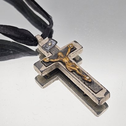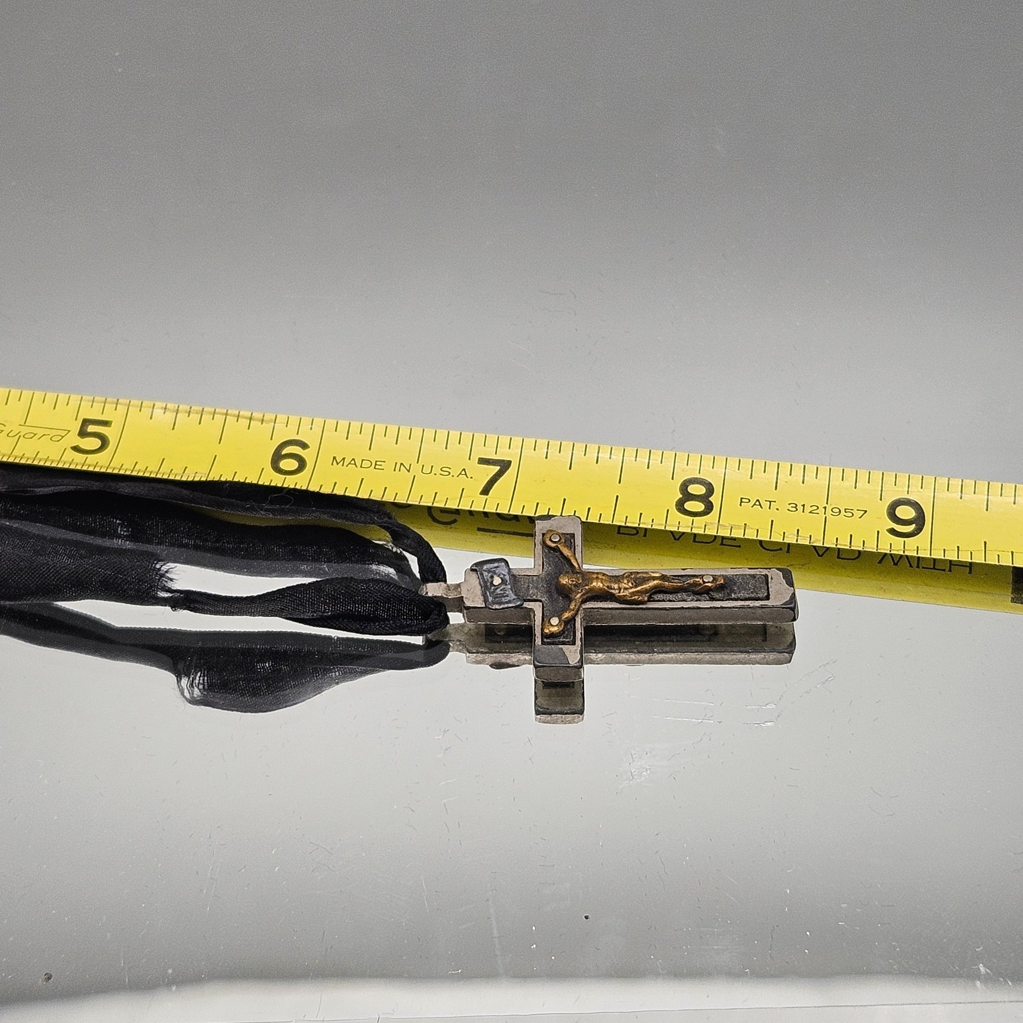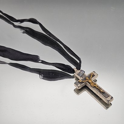 French Ebony & Silver Tone Pectoral Crucifix Ribbon Choker Necklace