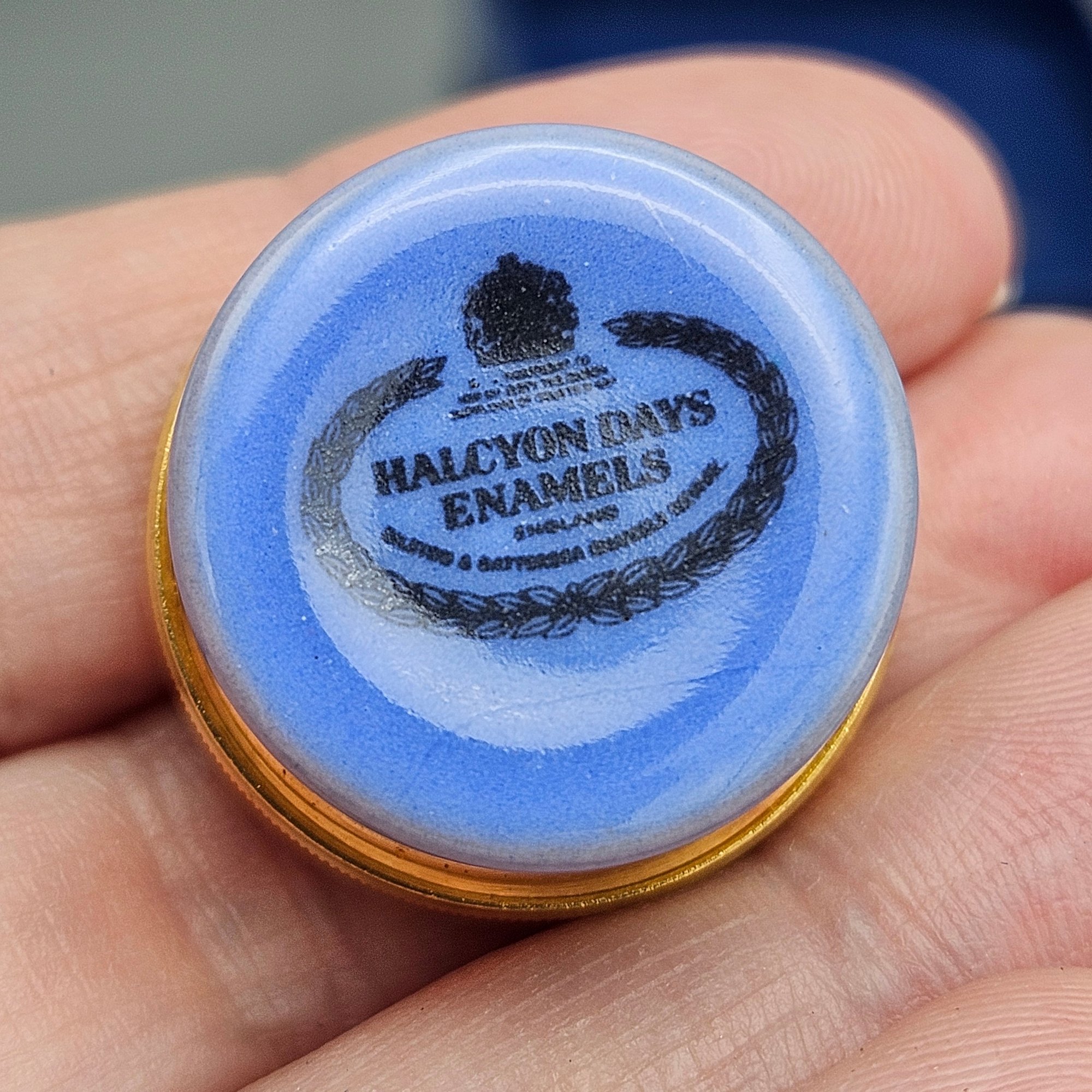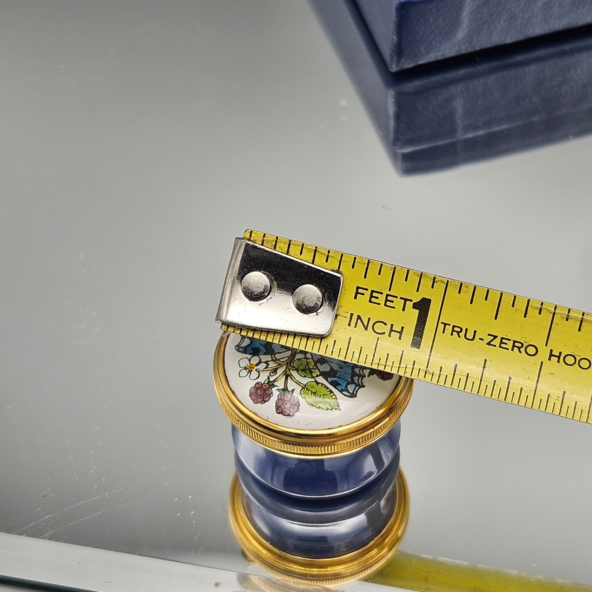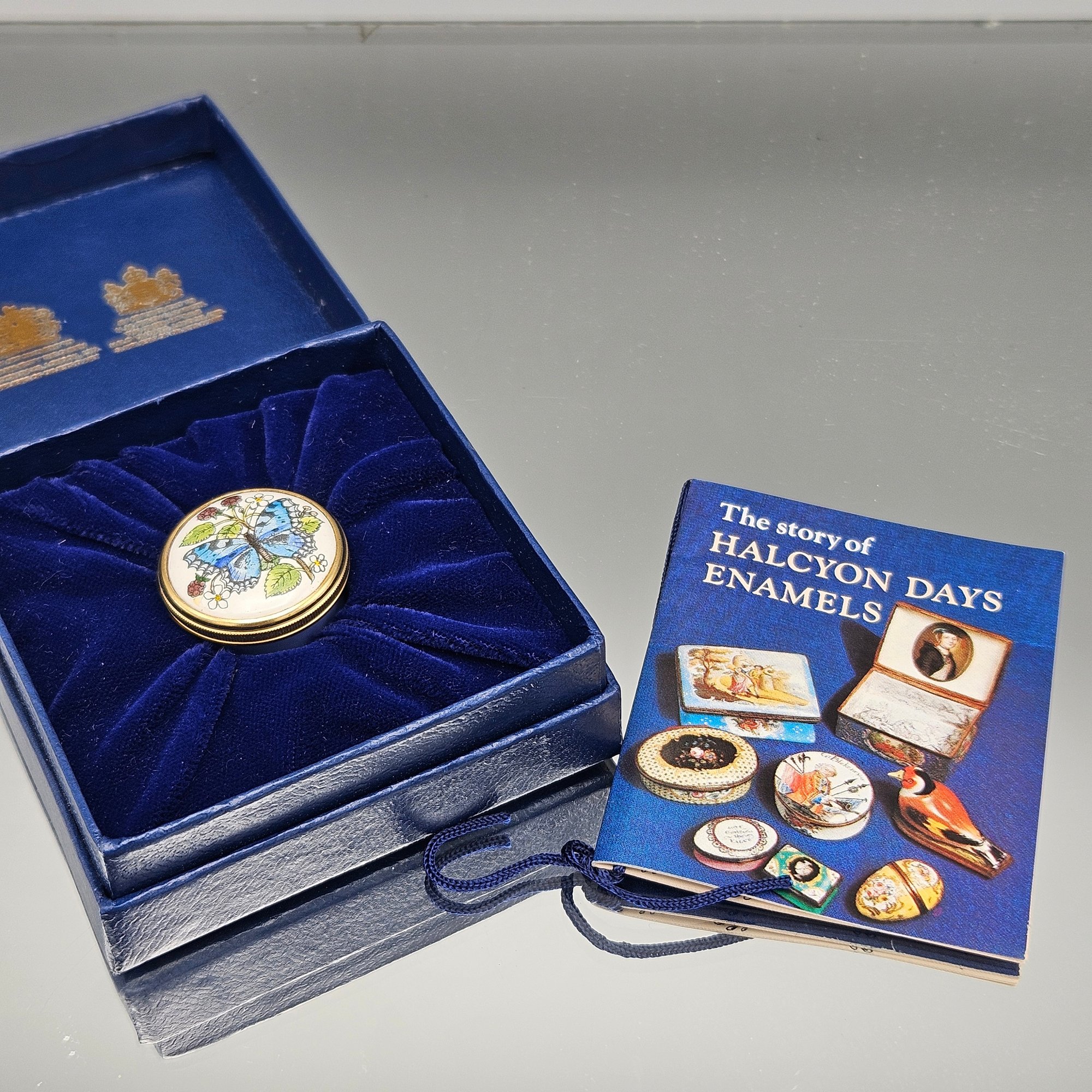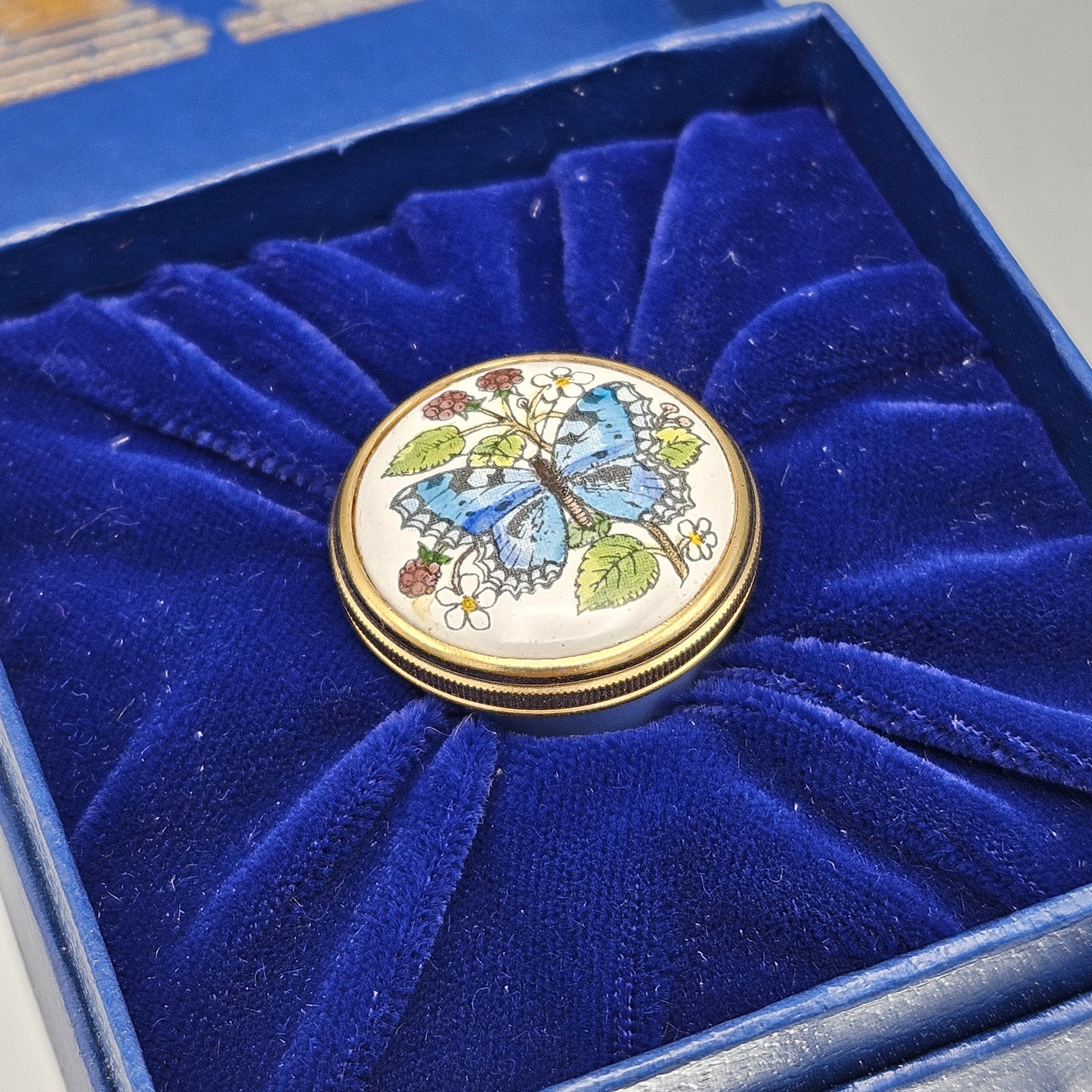 Halcyon Days Enamels Tiny Trinket Box Blue Butterfly & Berries W/ Box & Booklet