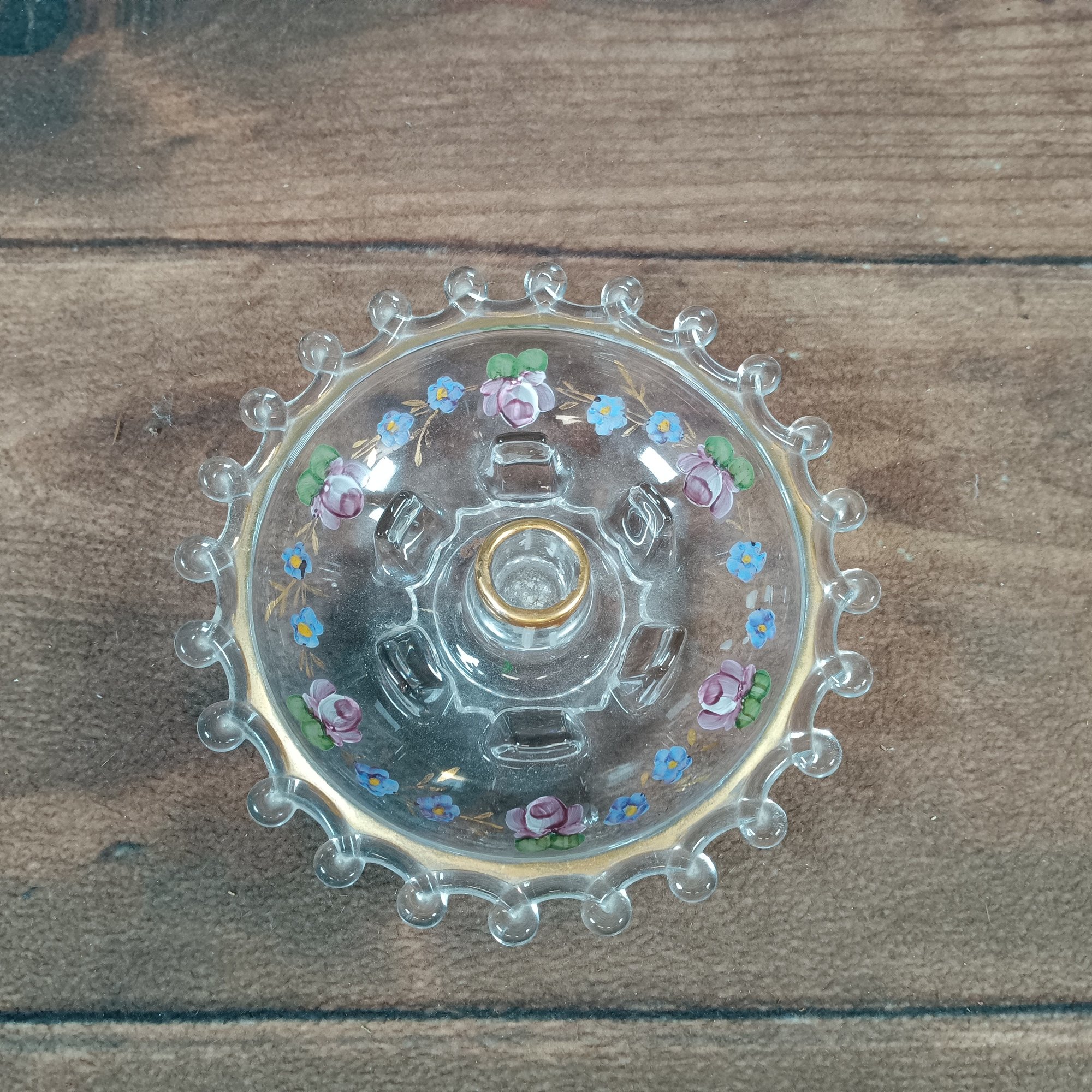 HEISEY GLASS LARIAT HURRICANE LAMP CANDLE BASE GOLD EDGING FLOWERS